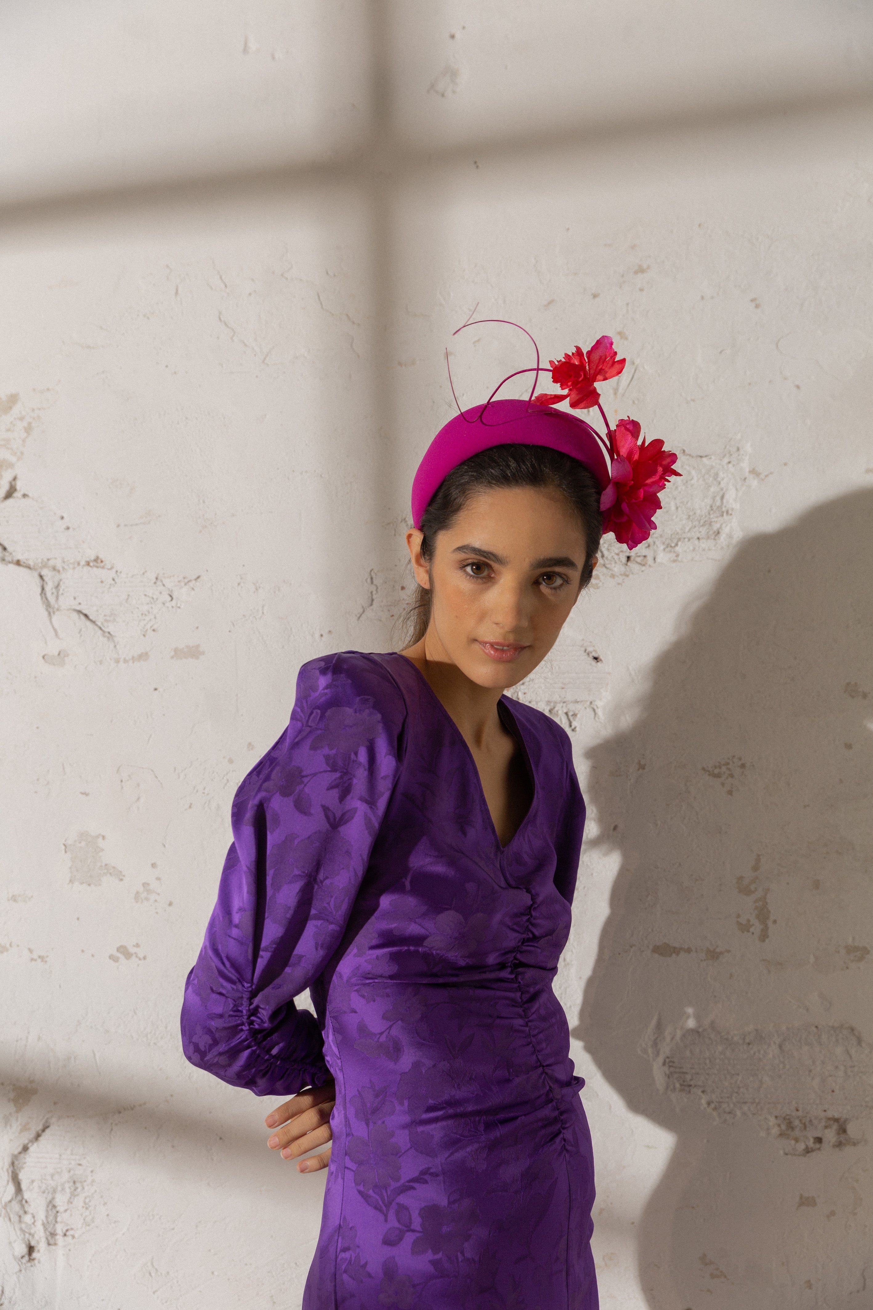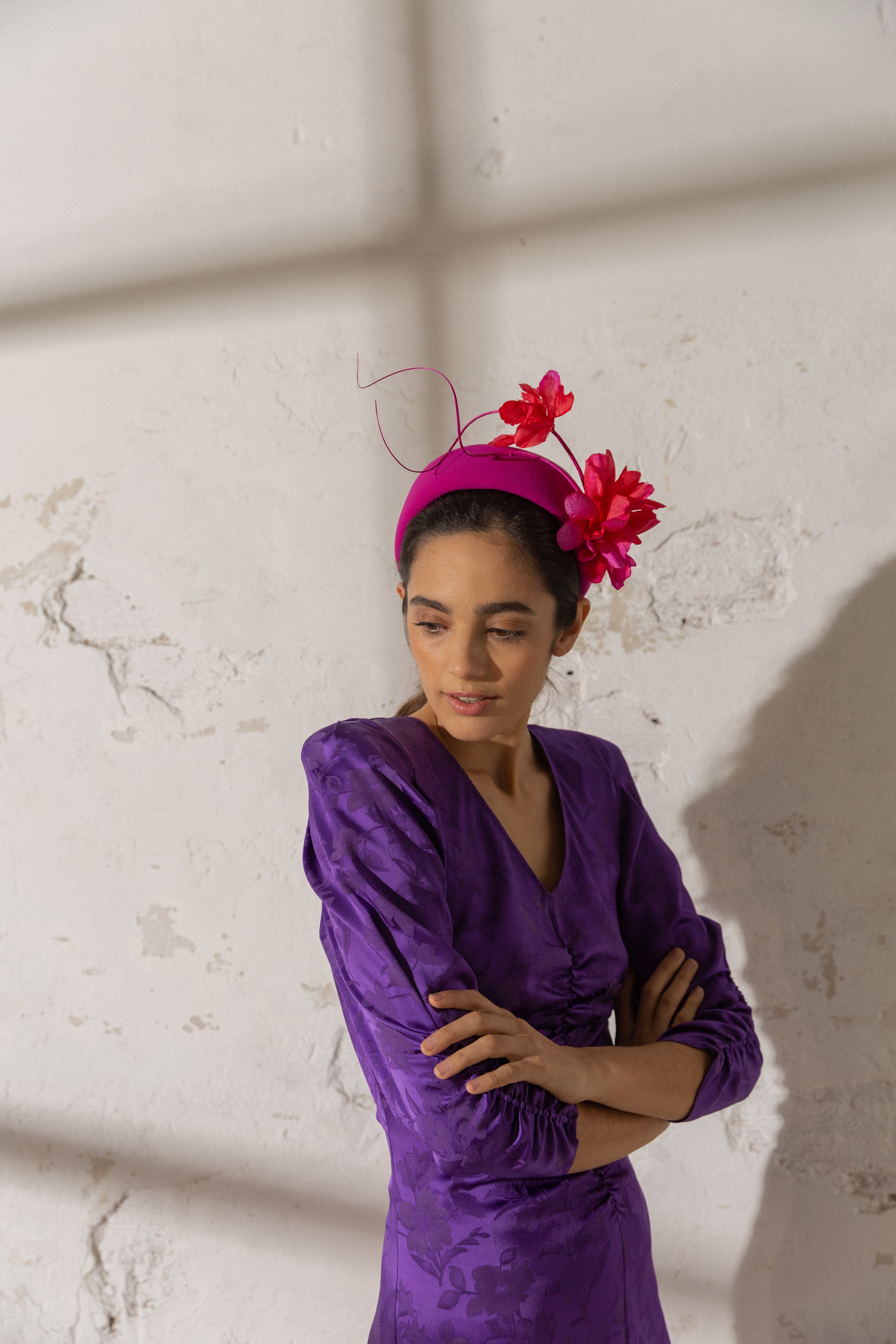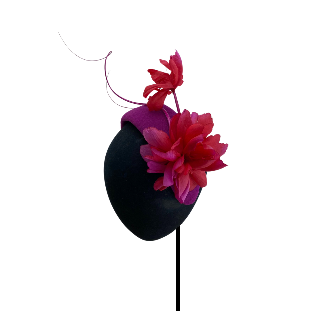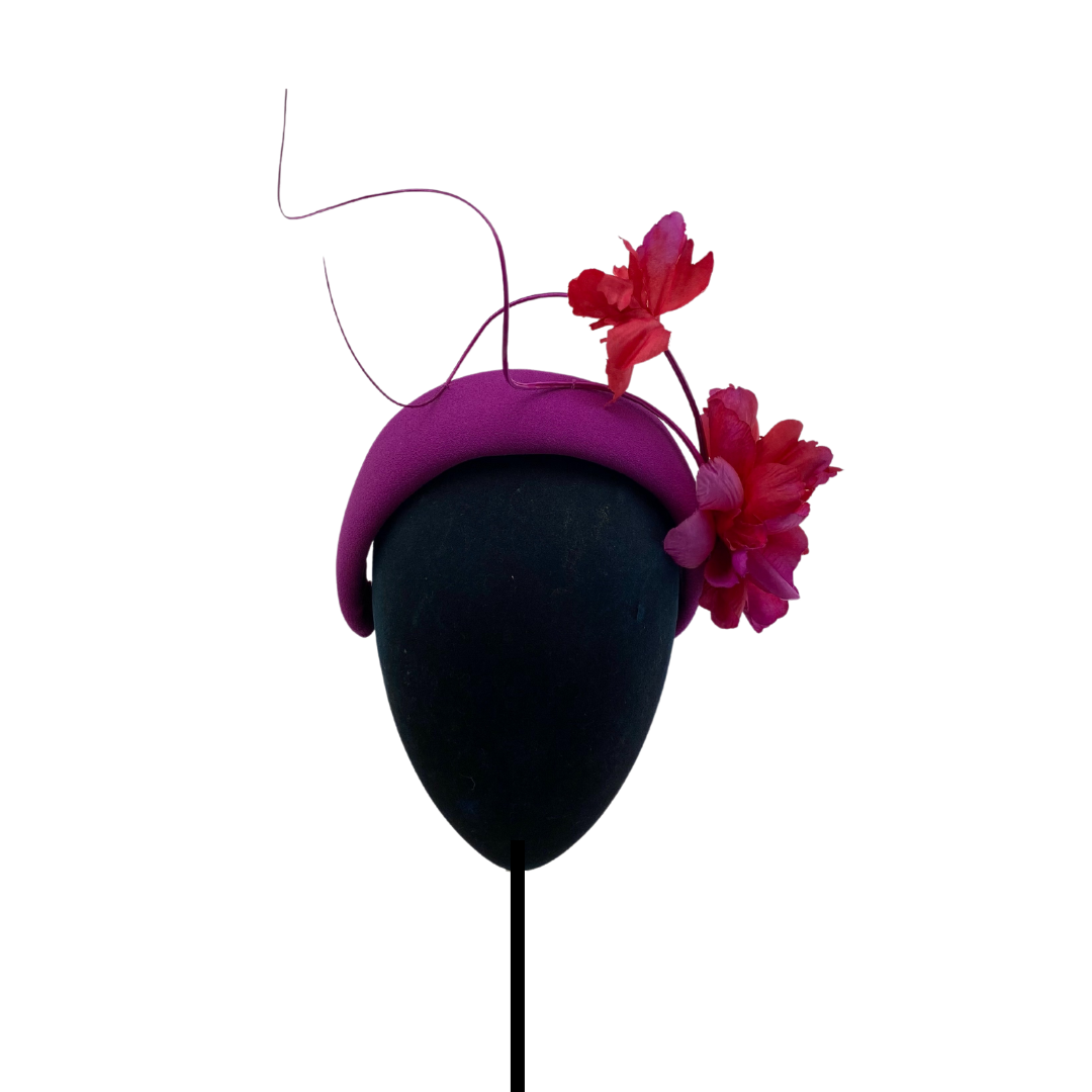 Headband cap lined in bougainvillea crepe with curved spines in the same tone and fuchsia and bougainvillea flowers