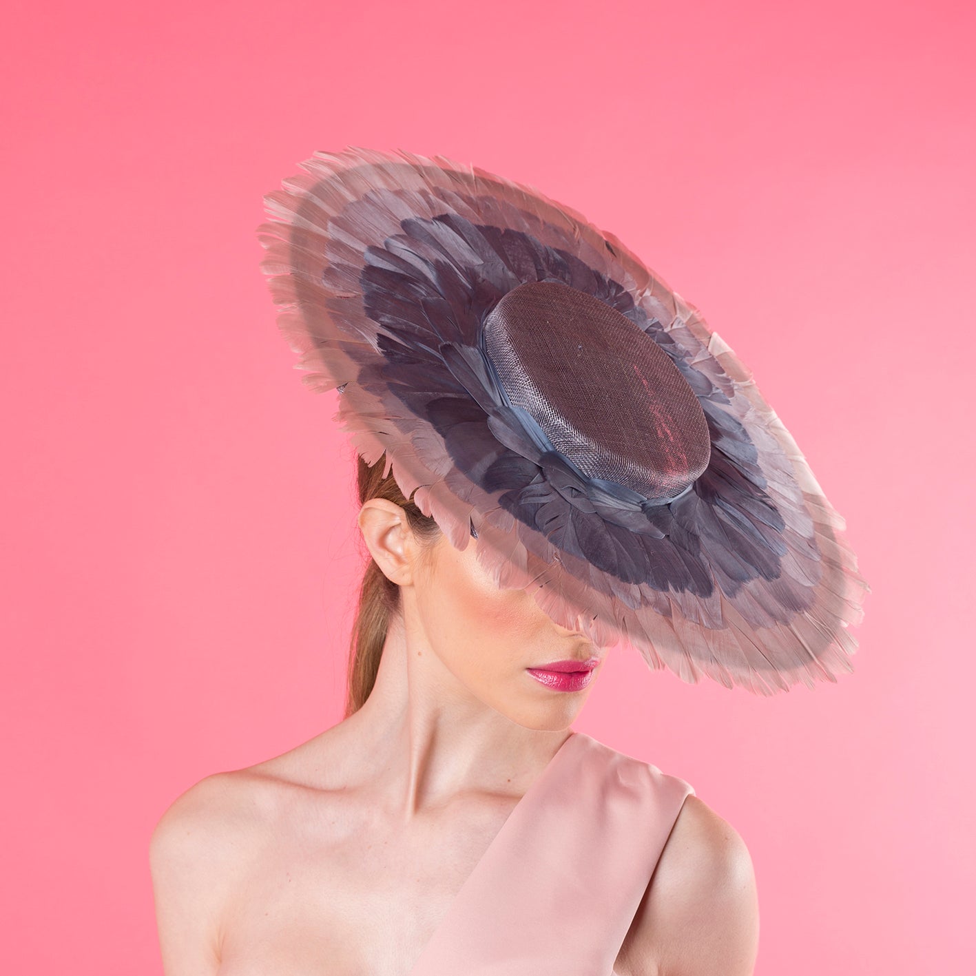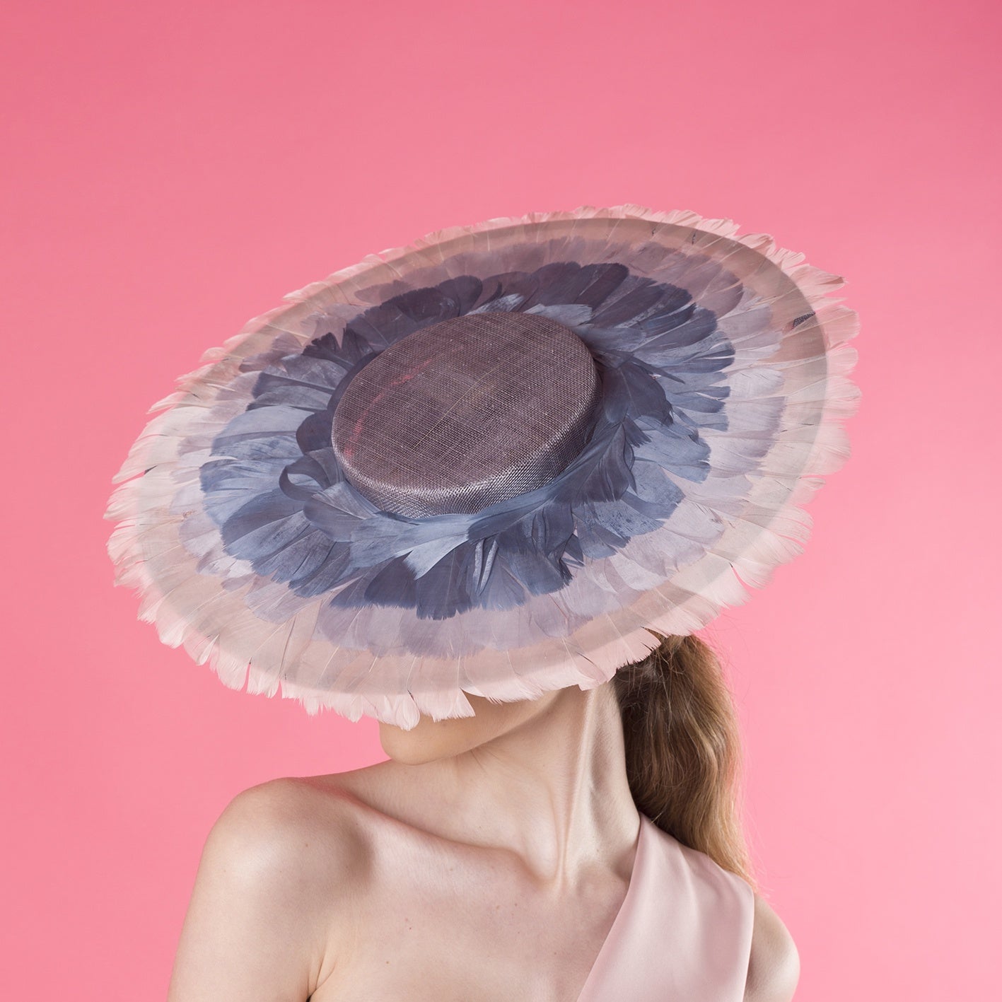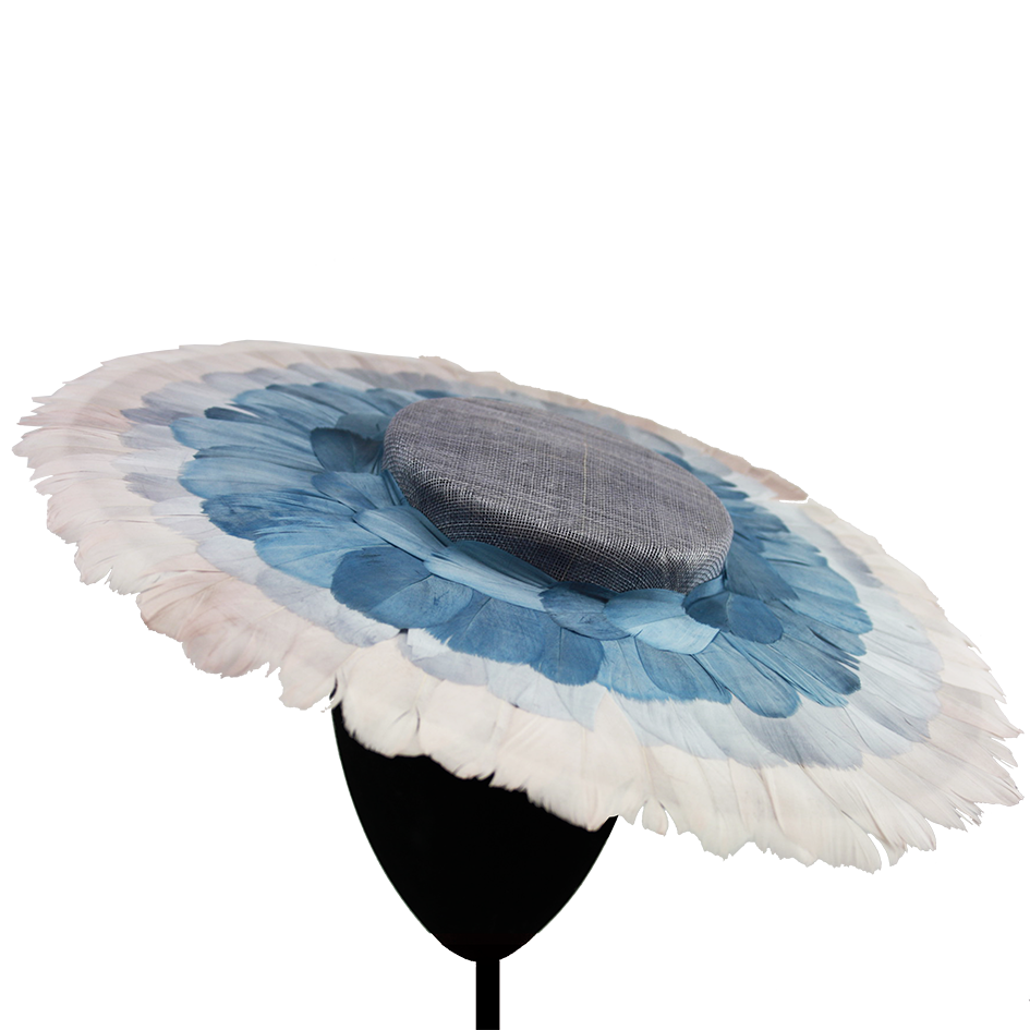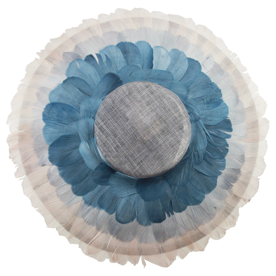 Pamela en parasisal forrada en plumas oca tricolor azules y nude