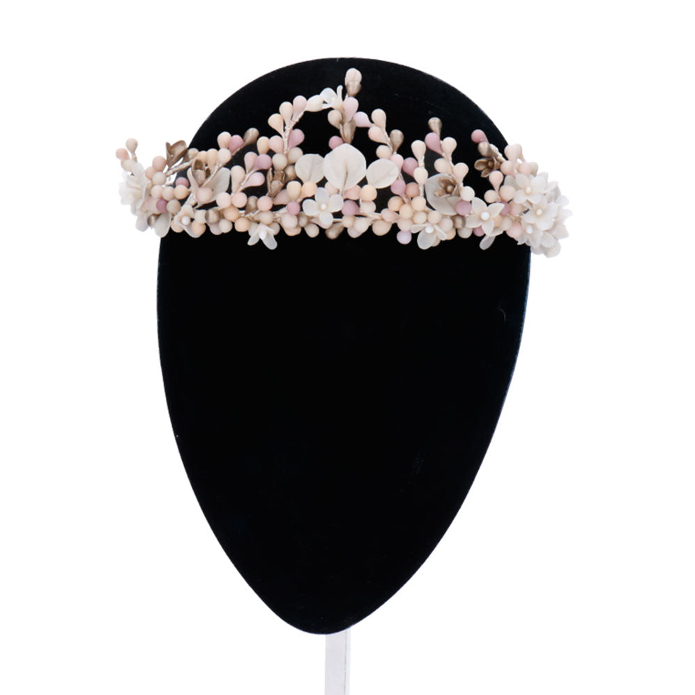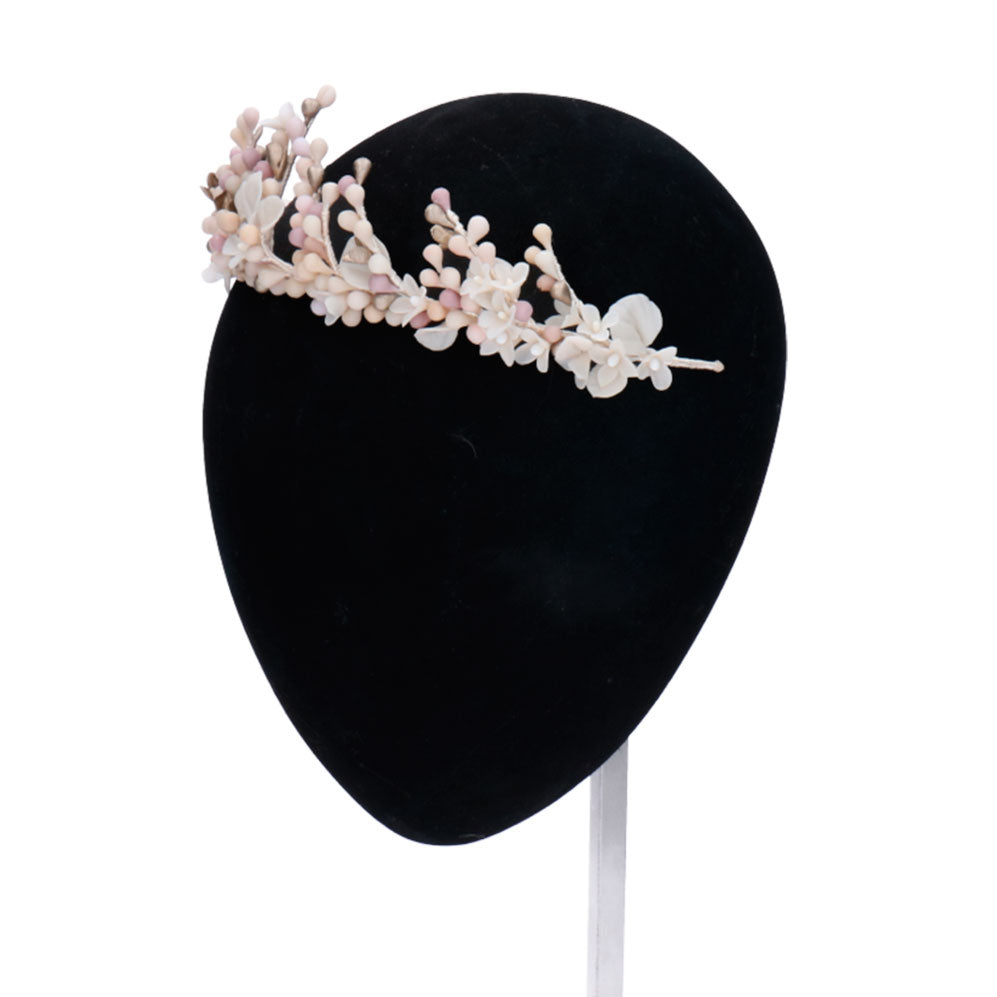 Tiara de pistilos, flores y hojas de porcelana fria en tonos blanco, malva y plata.