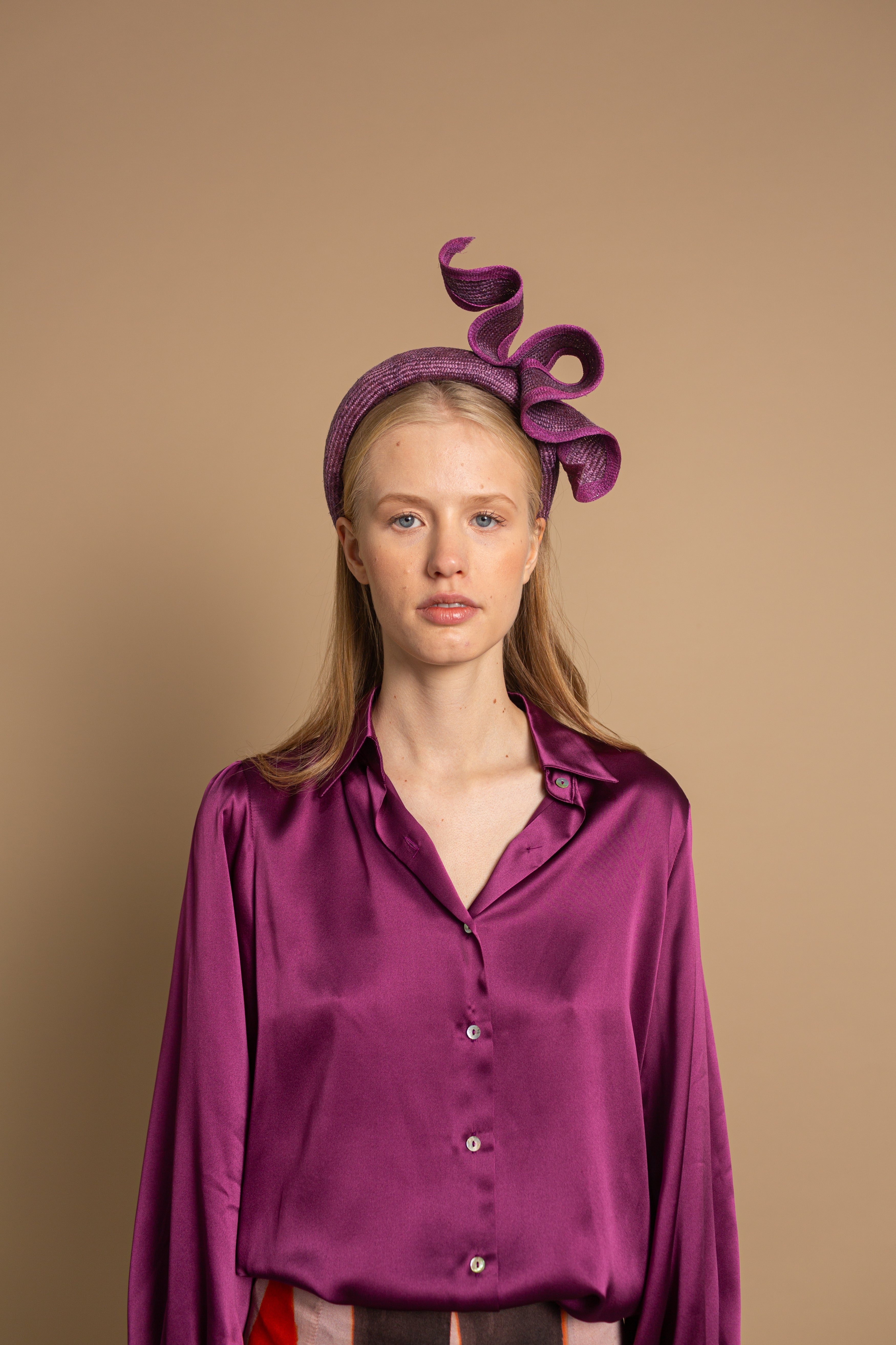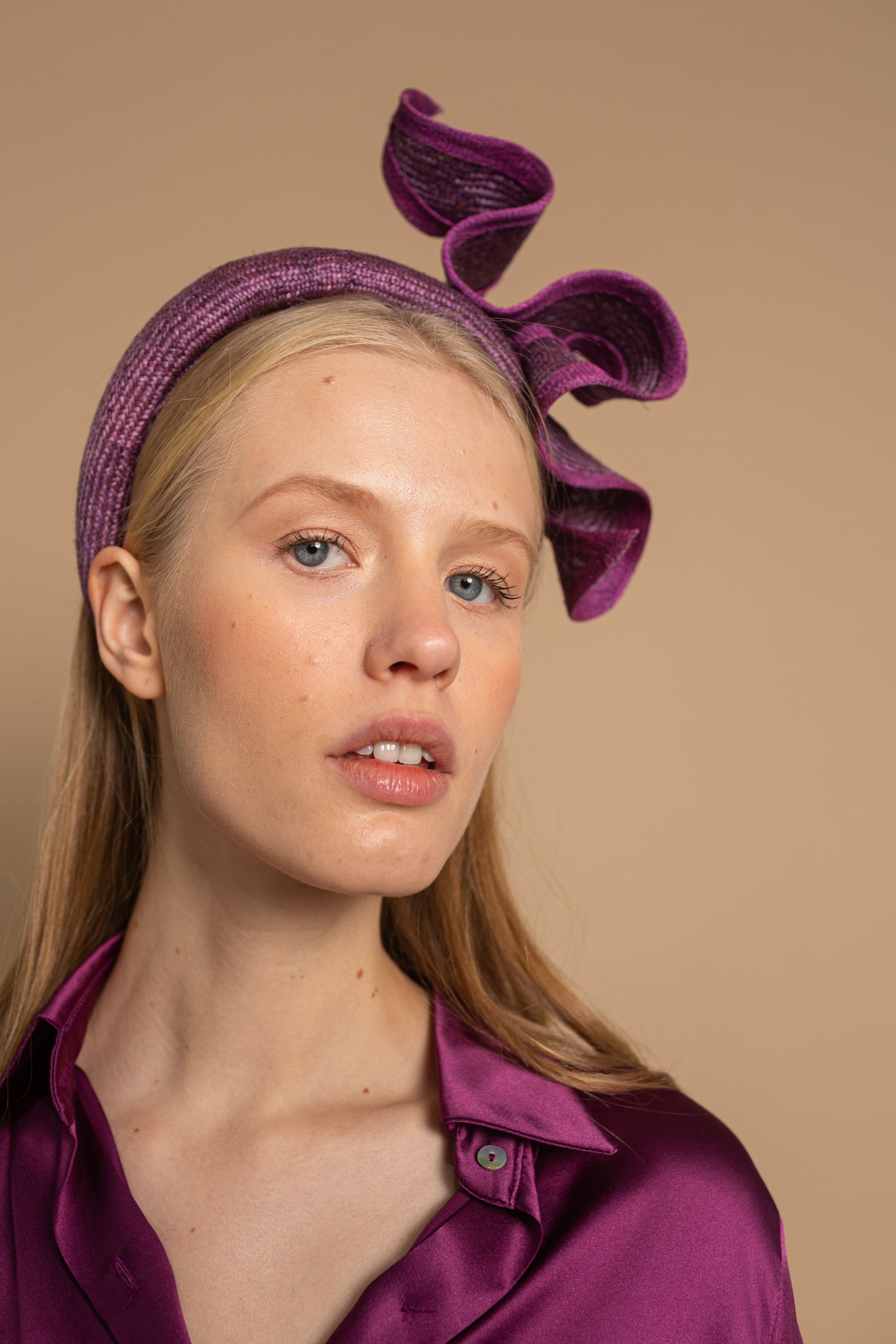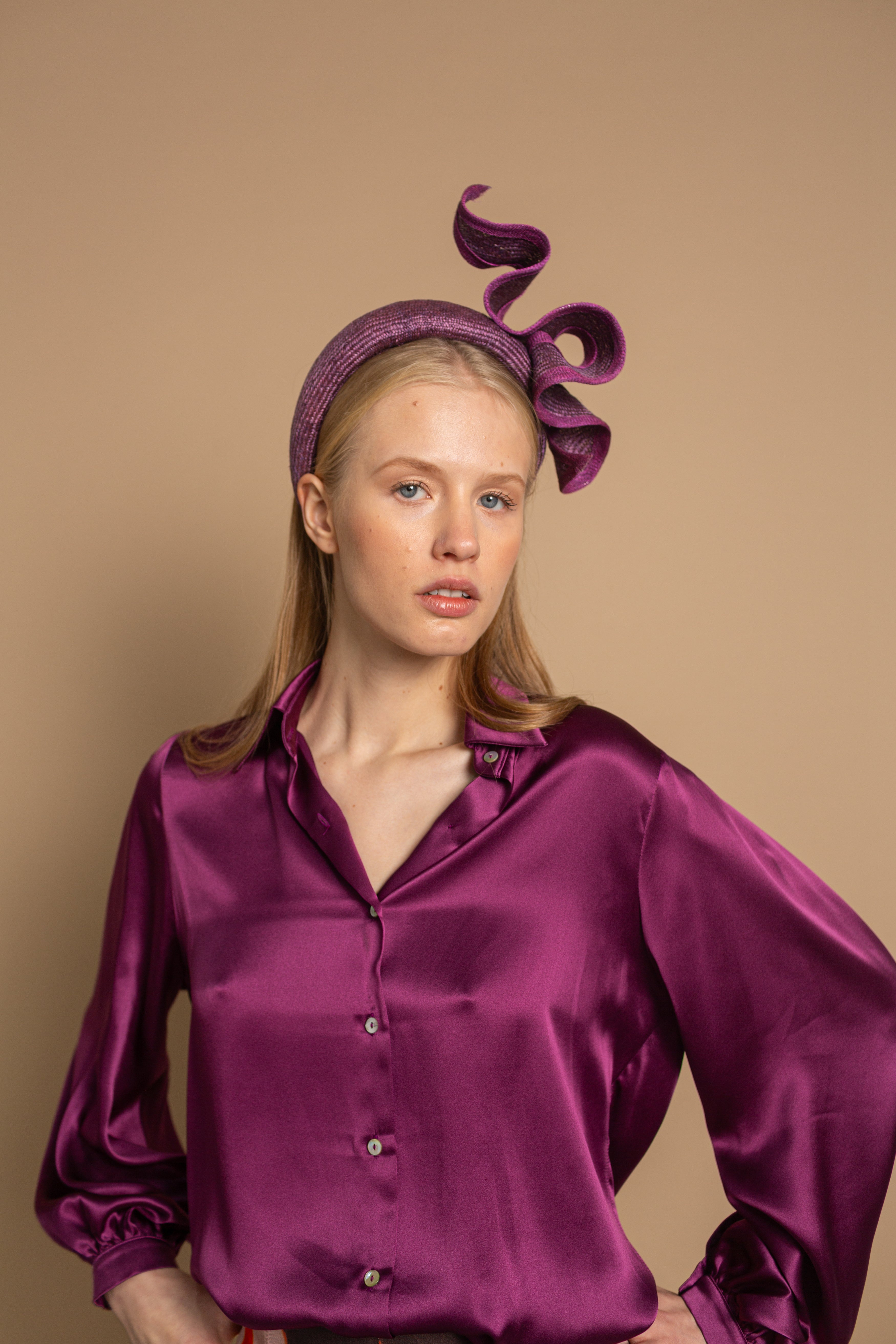 Diadema de parasisal morada con listón ondulado y bies al tono irregular
