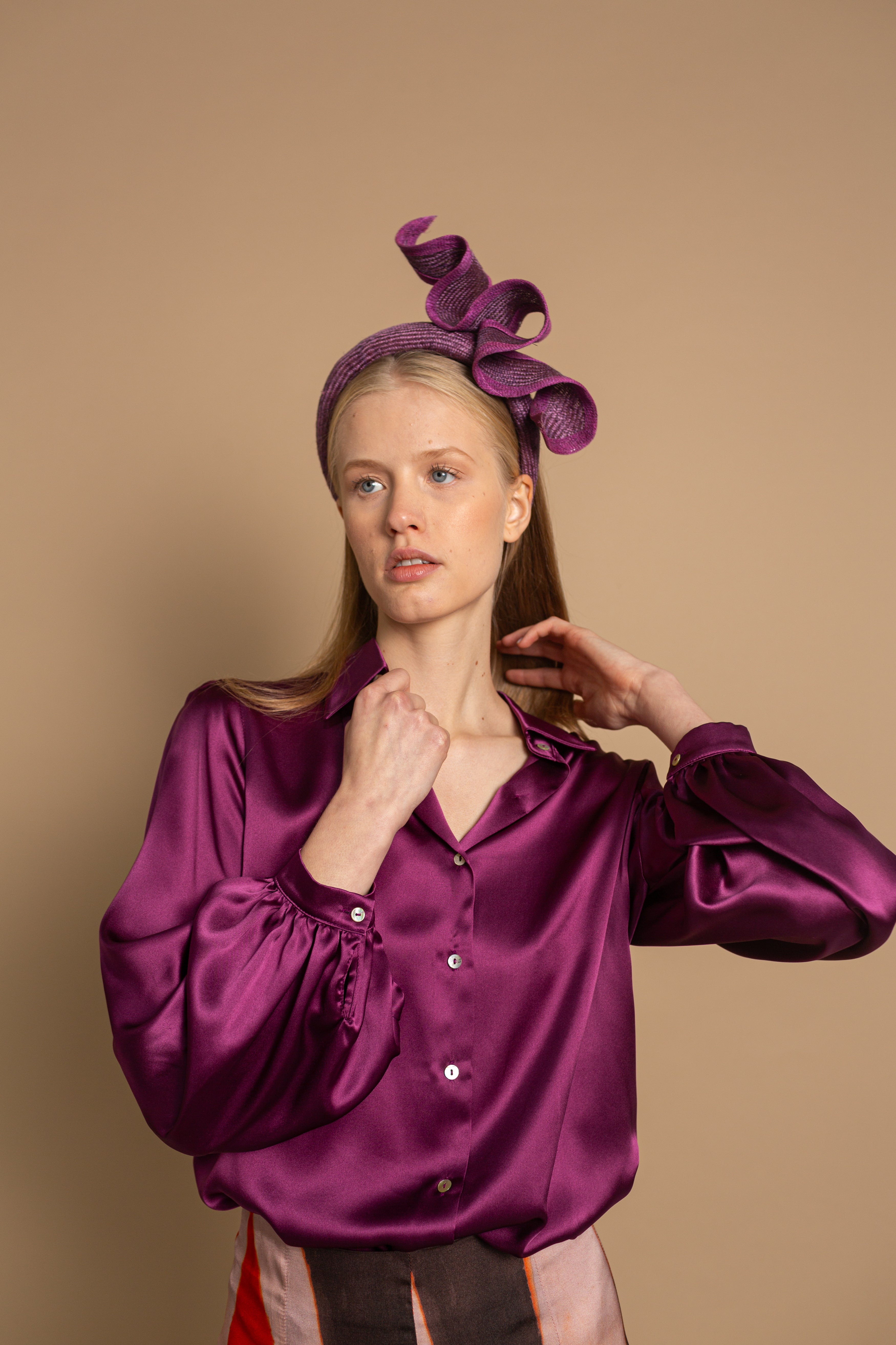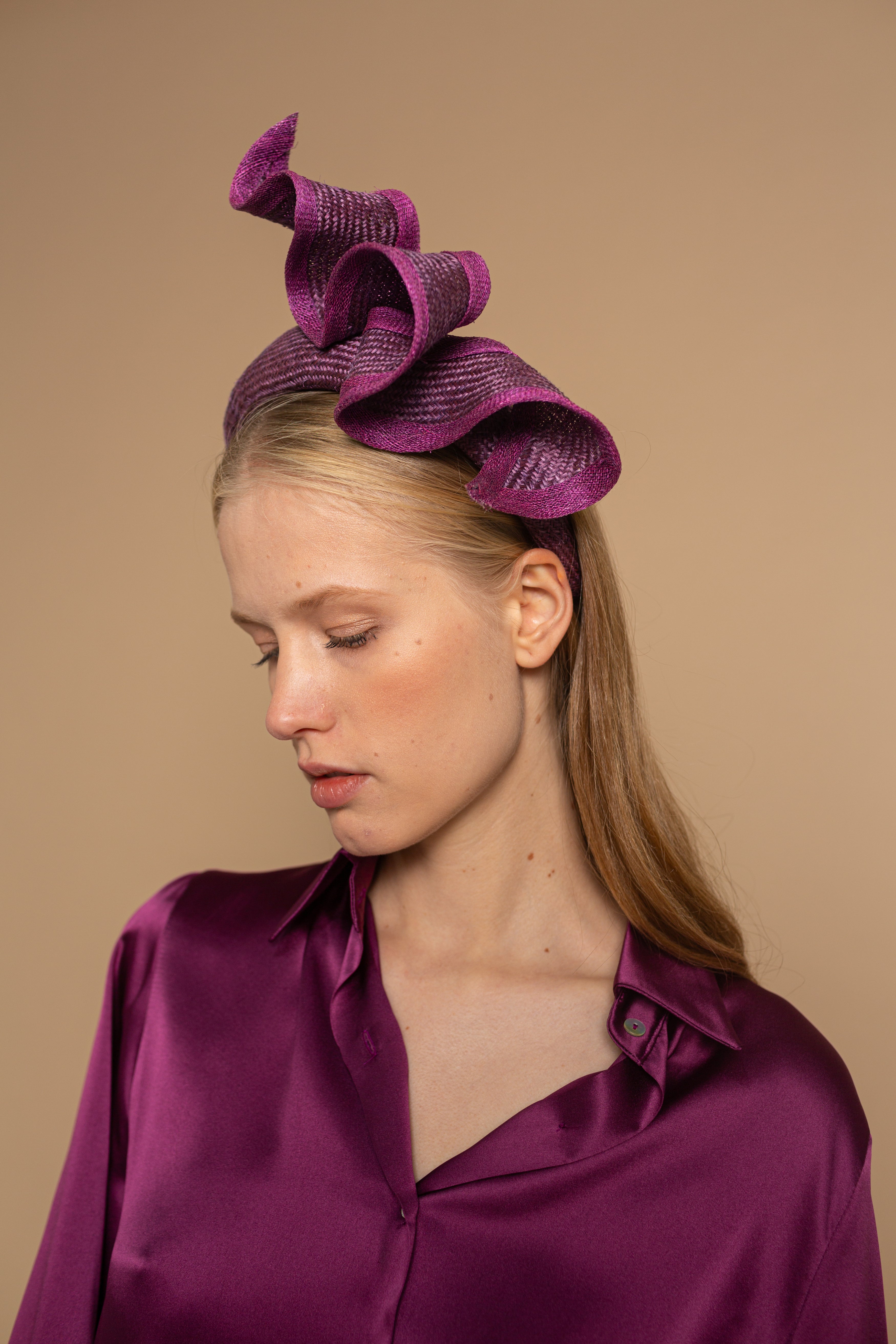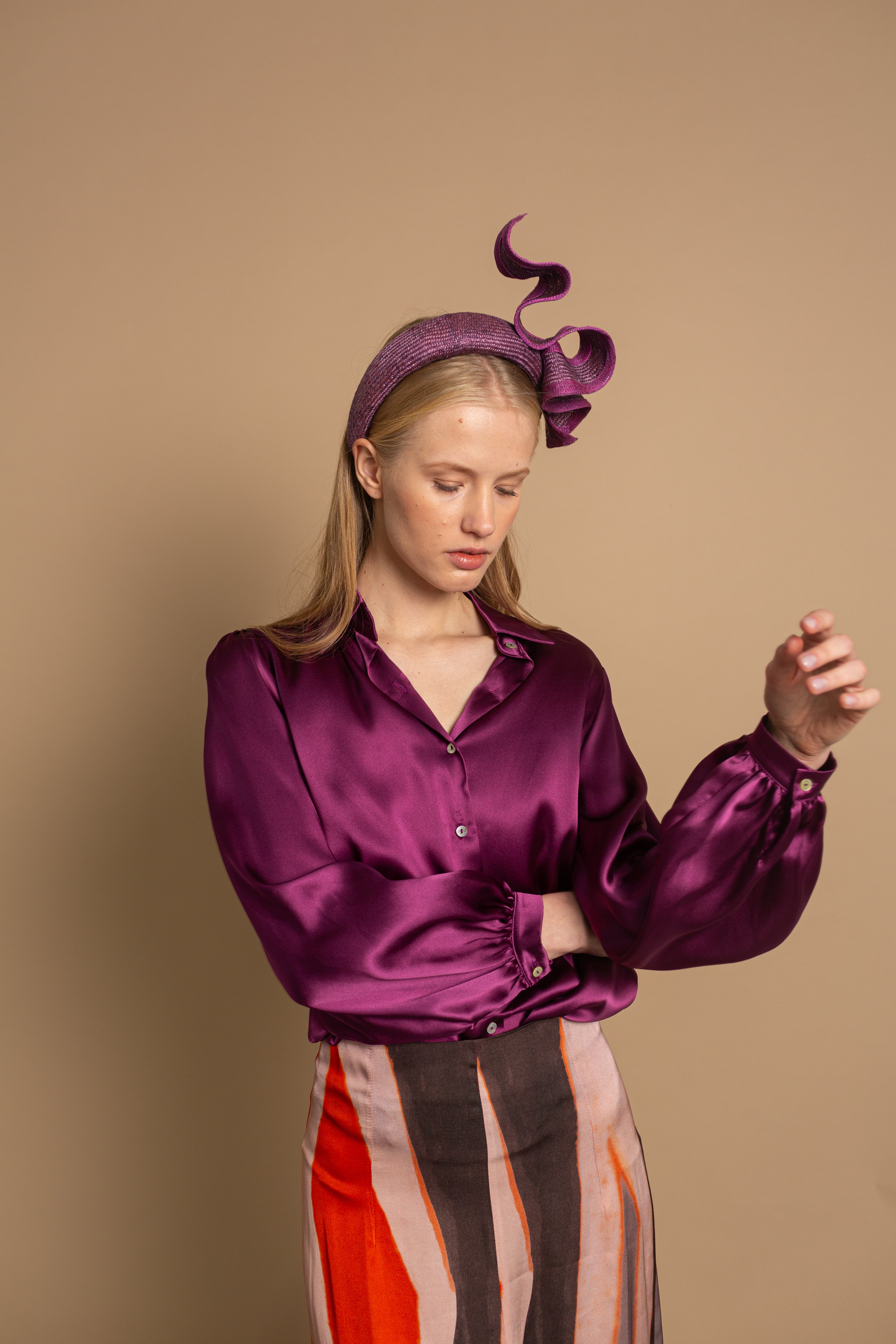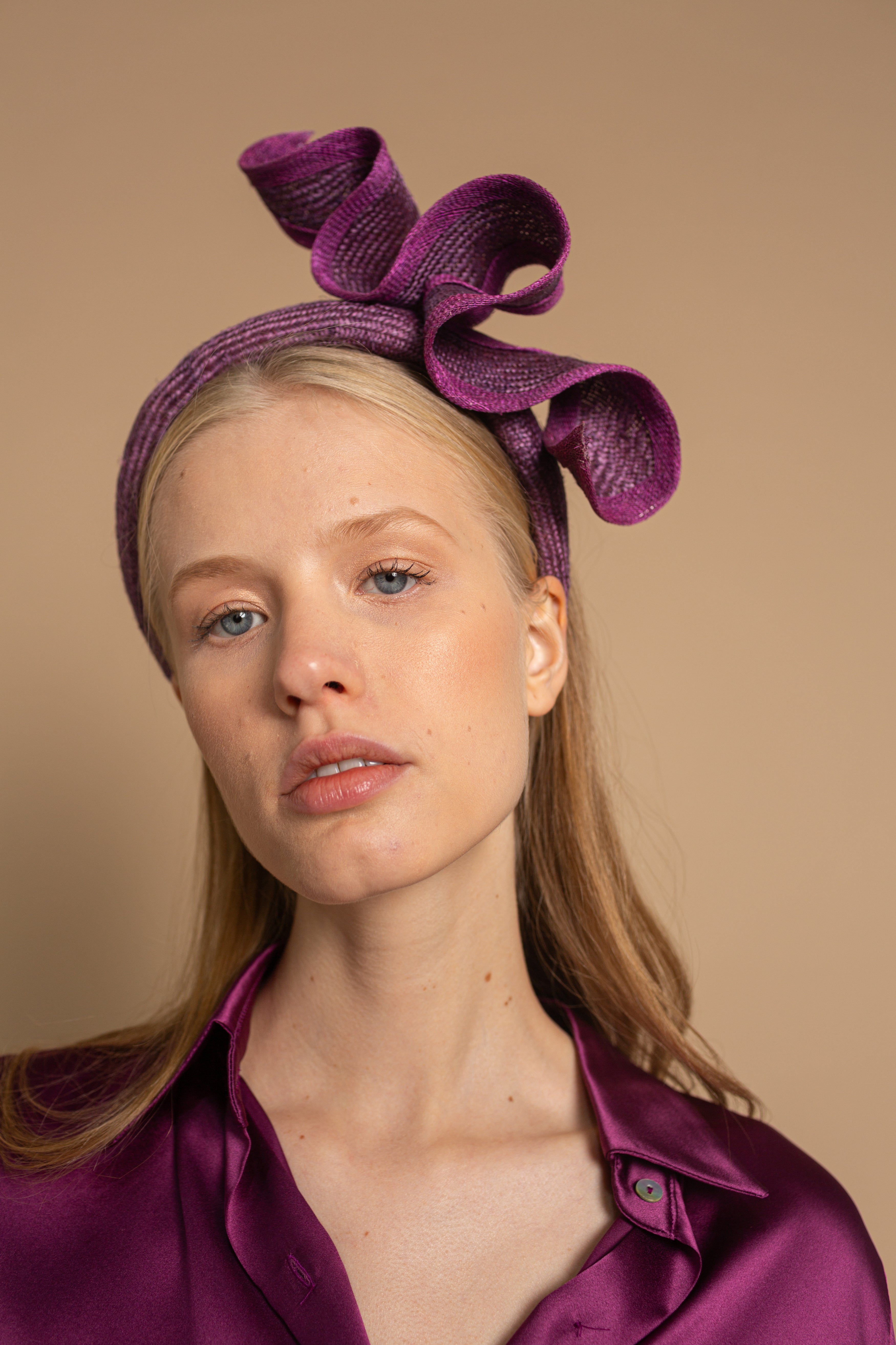 Diadema de parasisal morada con listón ondulado y bies al tono irregular