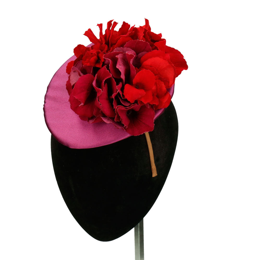 Dulcinea mini forrada en tela buganvilla con hortensias en tonos rojo y buganvilla.