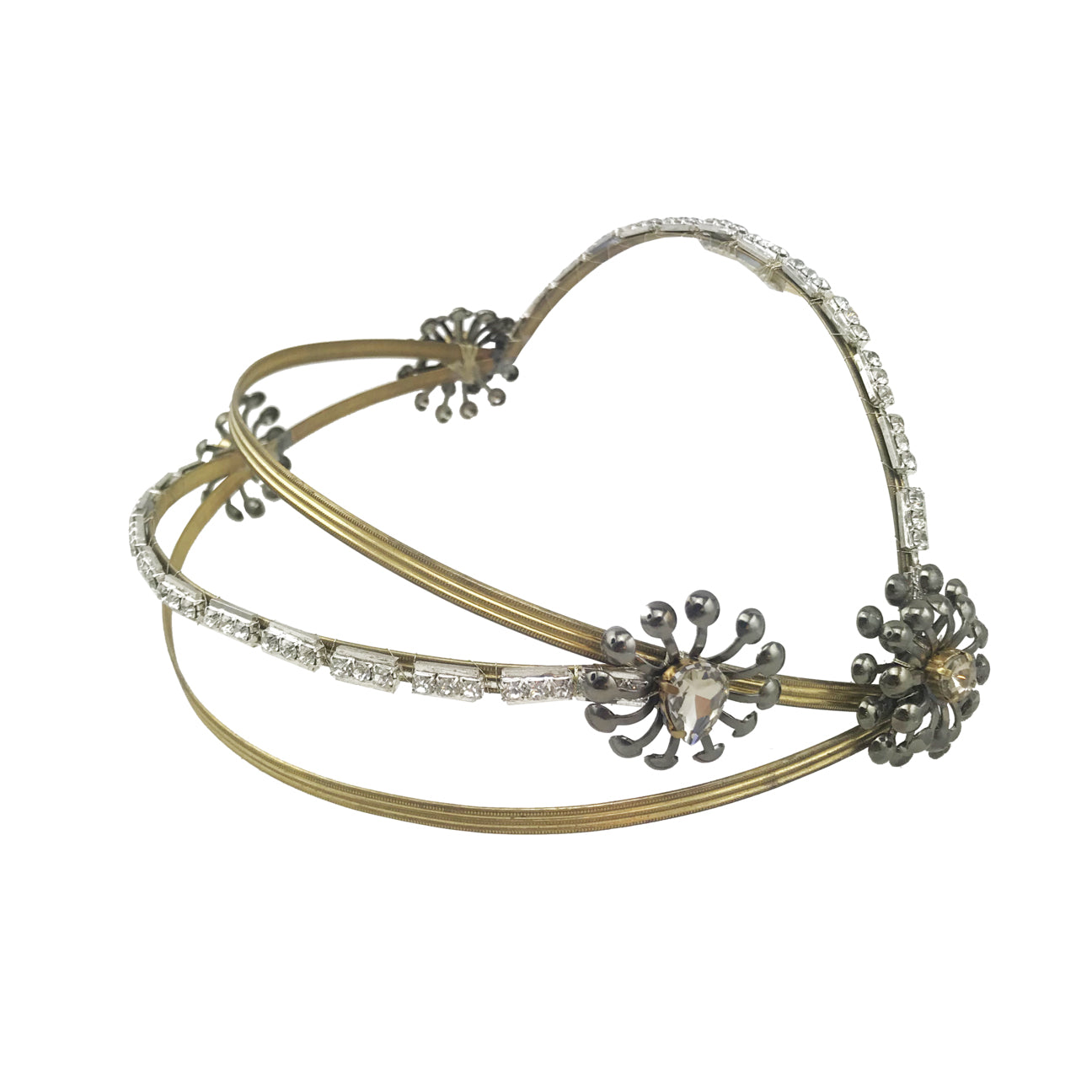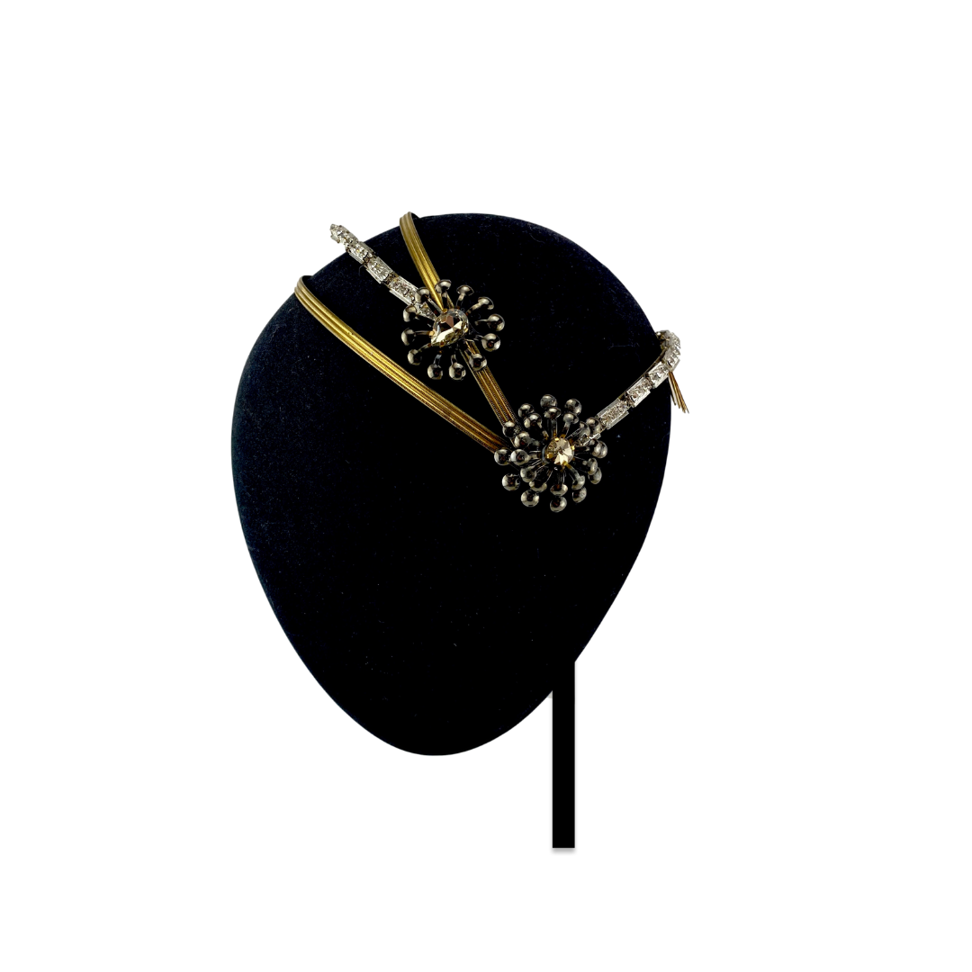 Estructura casquete de laton con cadena de cristales y 4 flores de metal cromado