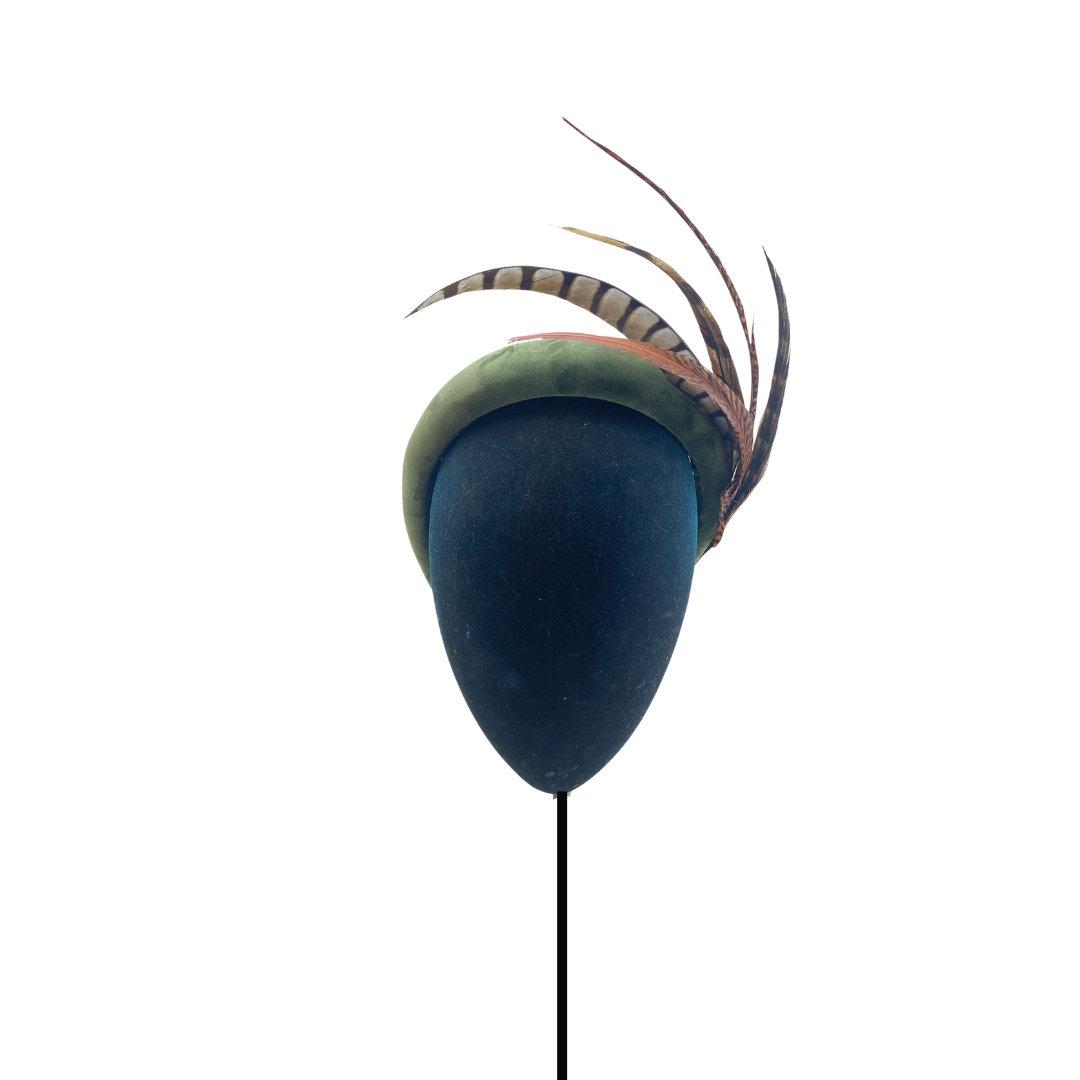 Diadema ancha de terciopelo verde musgo con conjunto de faisanes en el lateral