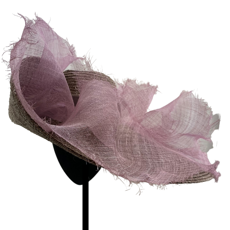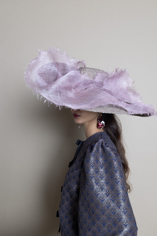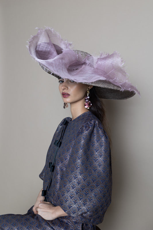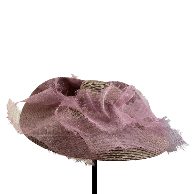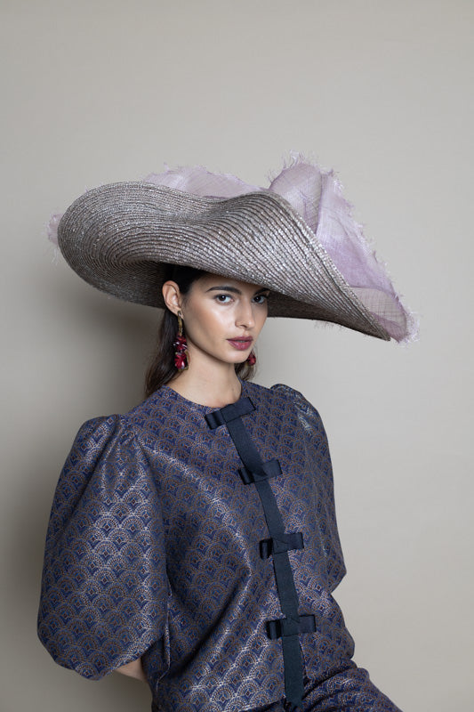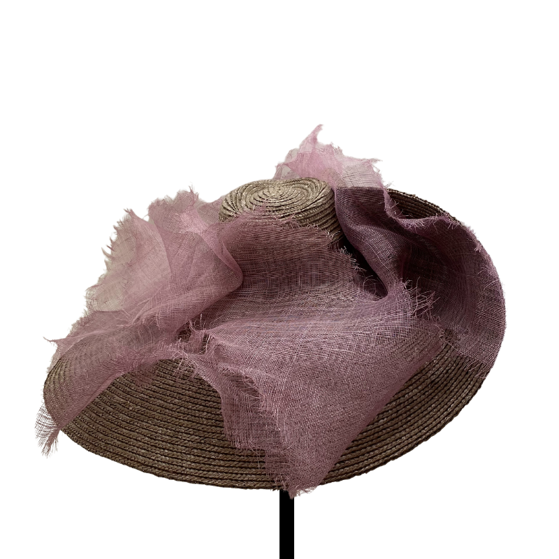Maxi sombrero de paja gris con ala doblada y sinamay malva modelado deshilachado