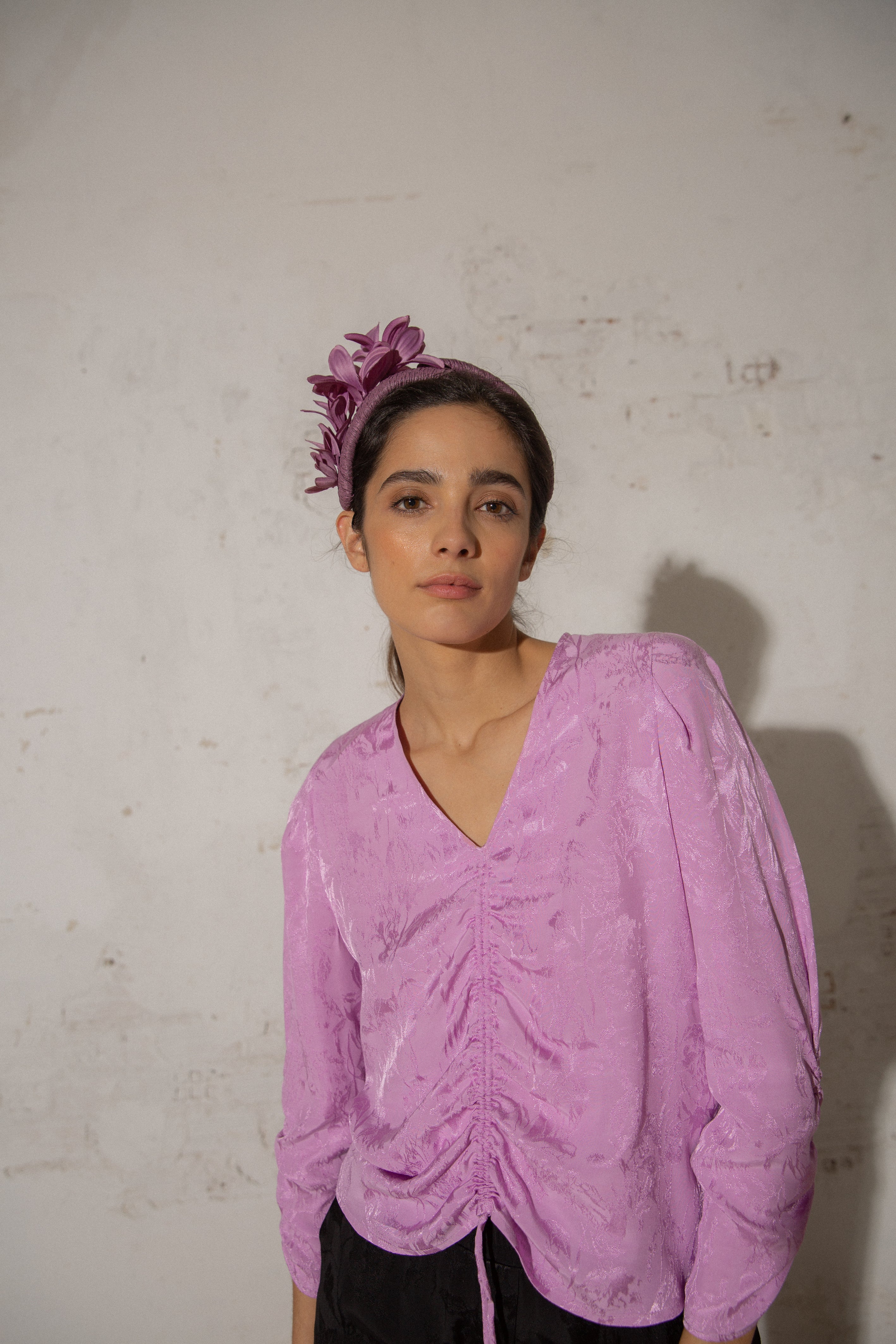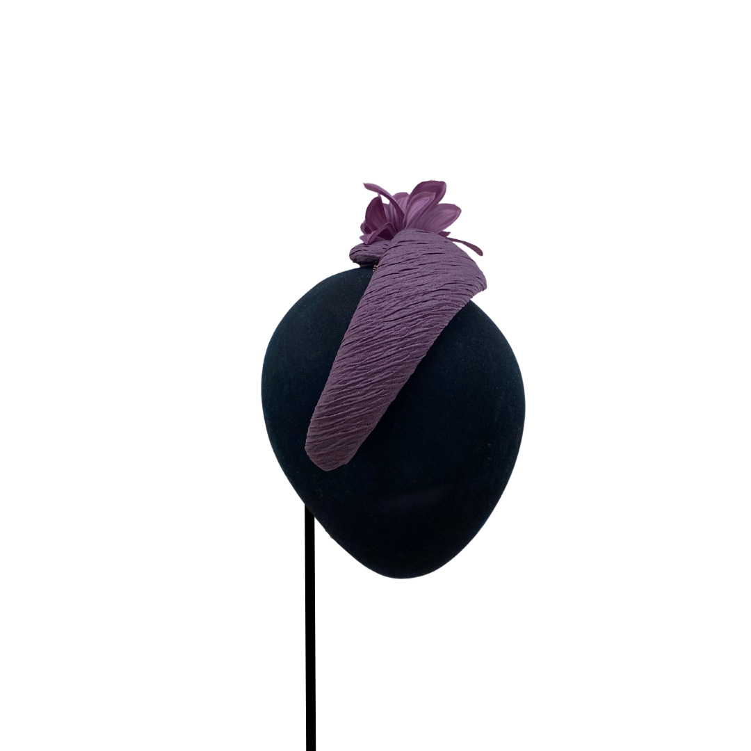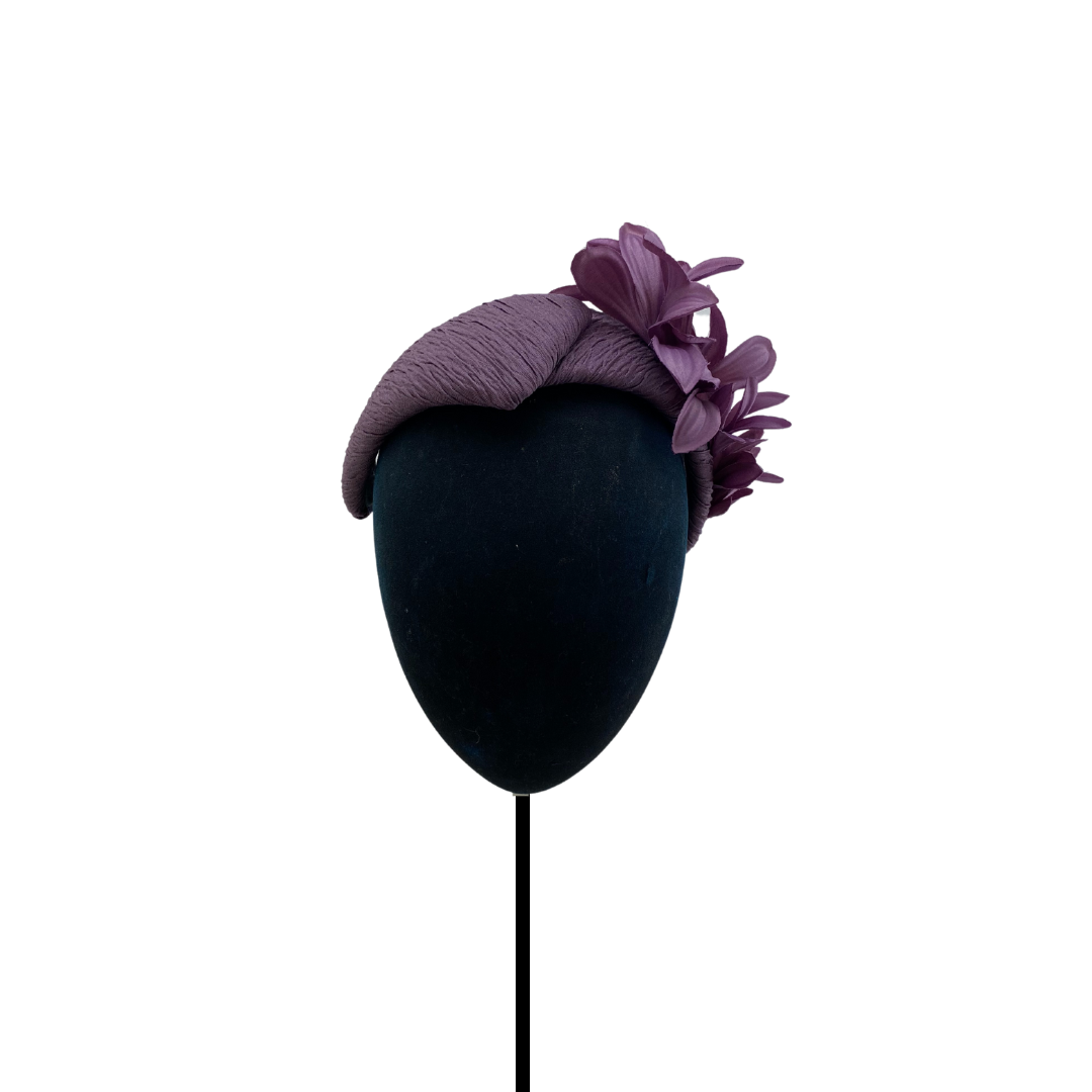 Estructura doble forrada en tejido estriado morado con pétalos de flor degradados al tono