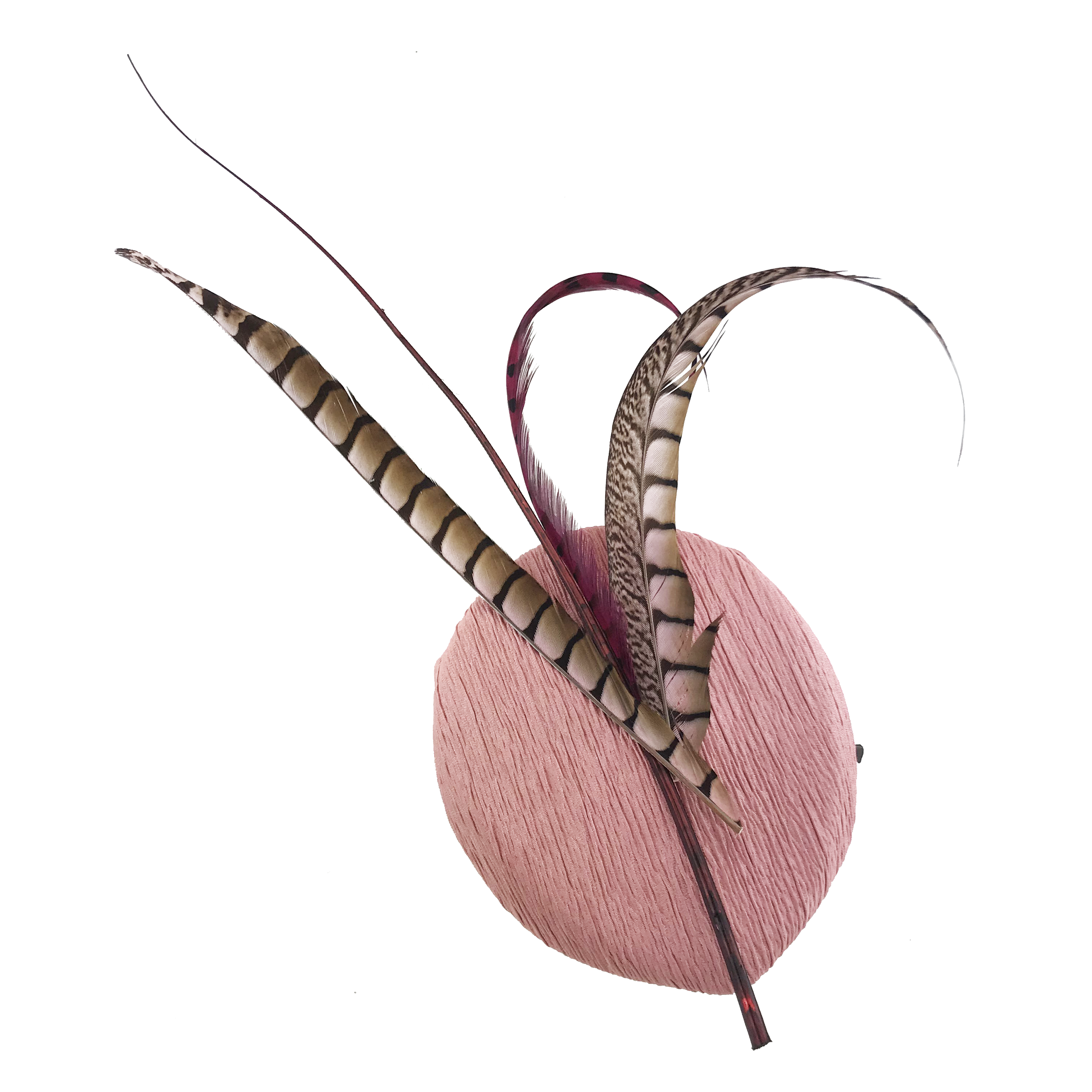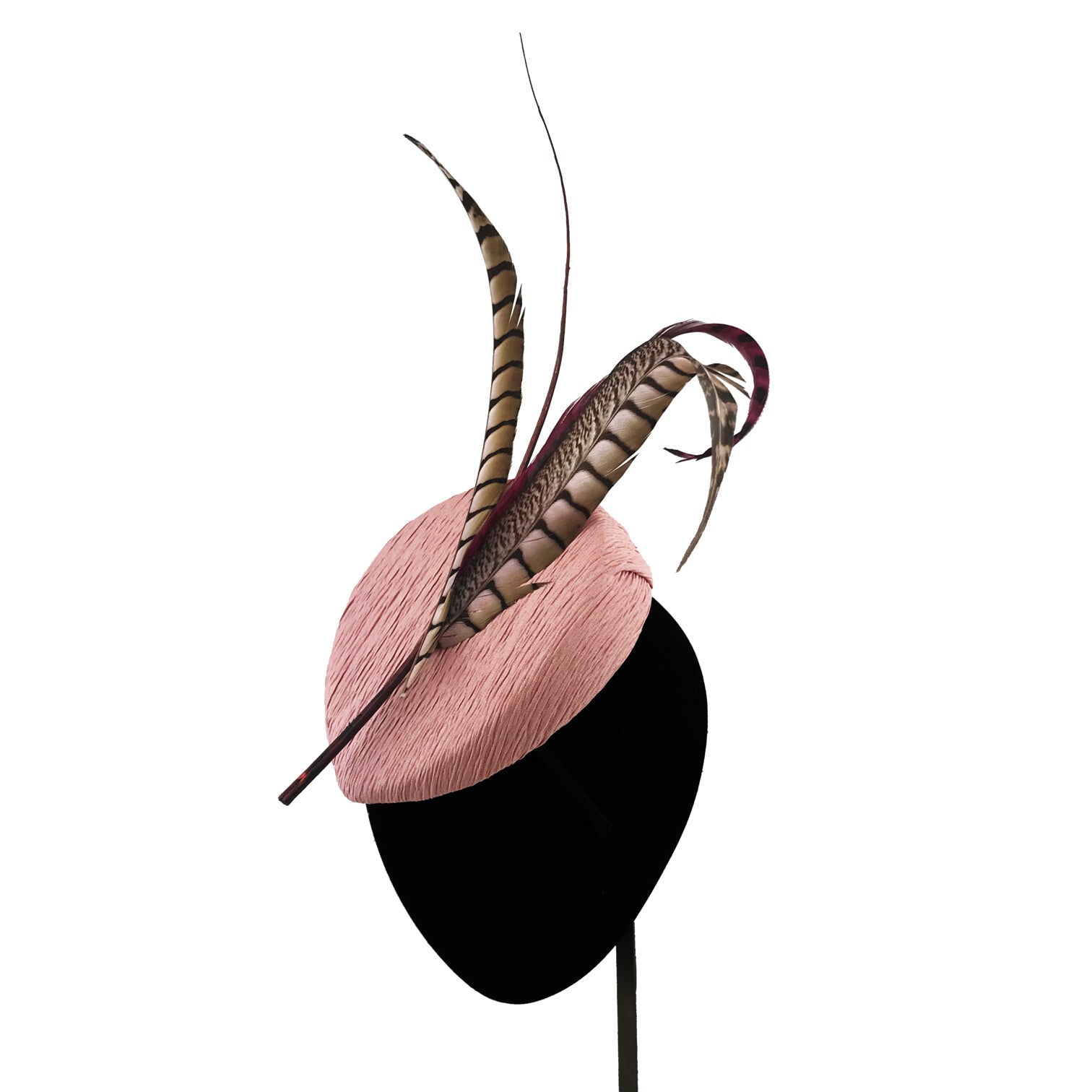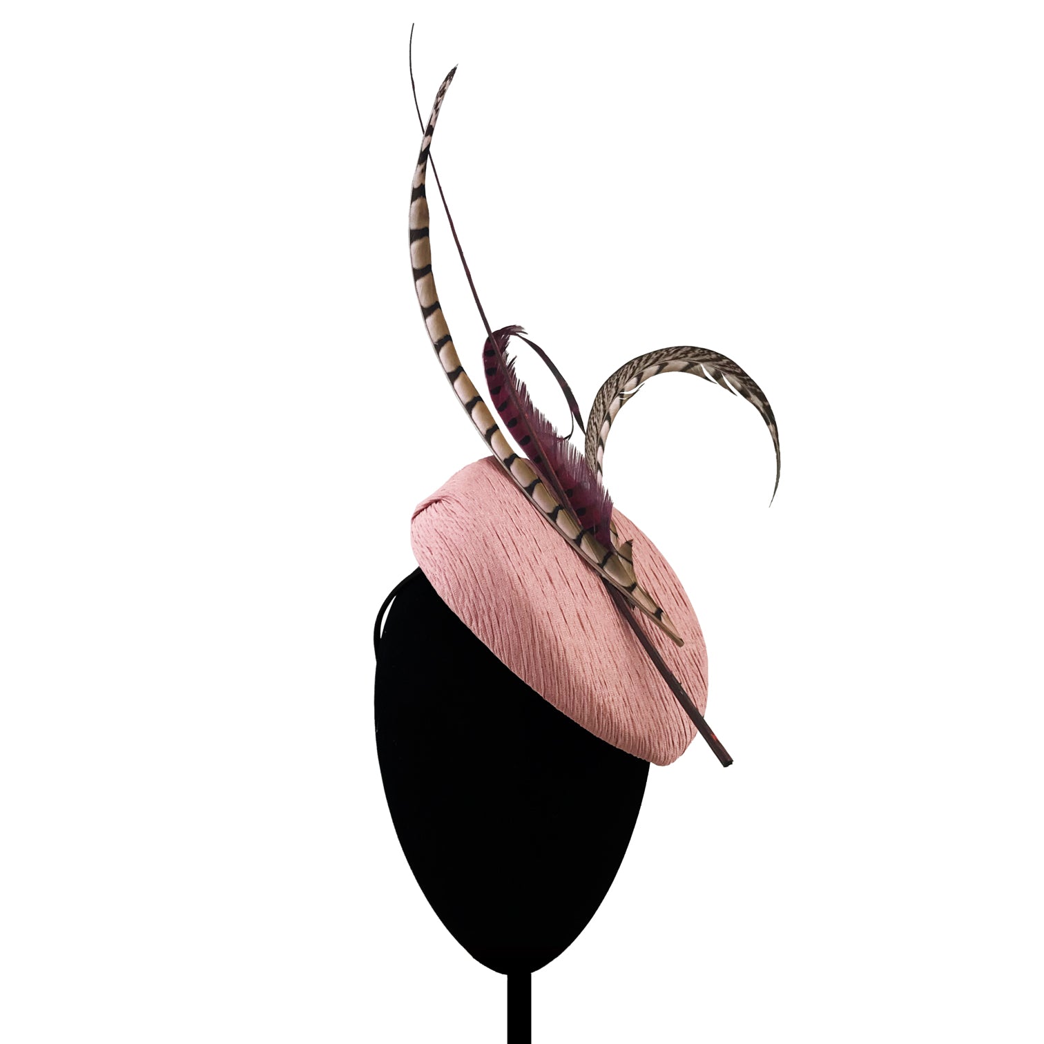Casquete en pico de tejido estriado rosa con faisanes al tono.