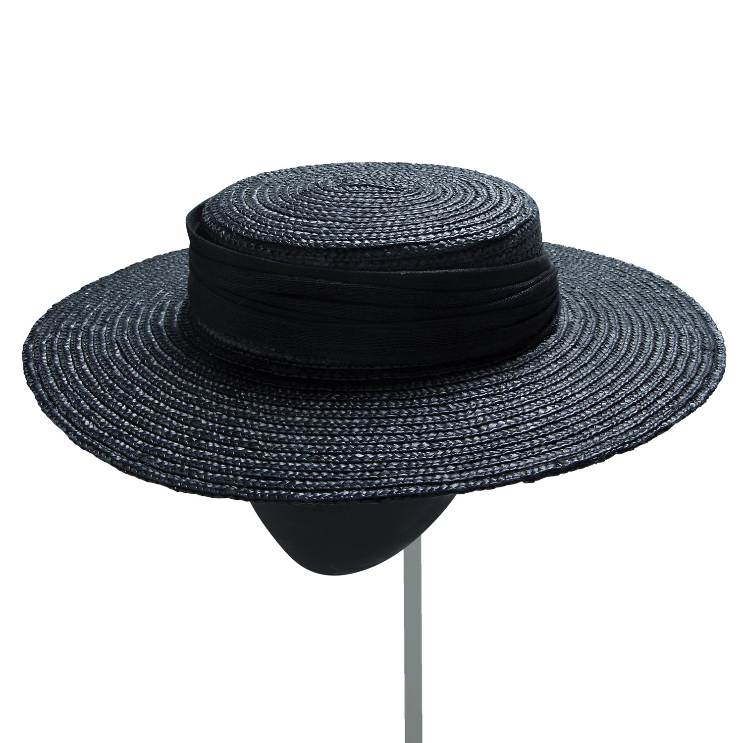 Canotier de paja negro con copa baja y lazada de rafia al tono