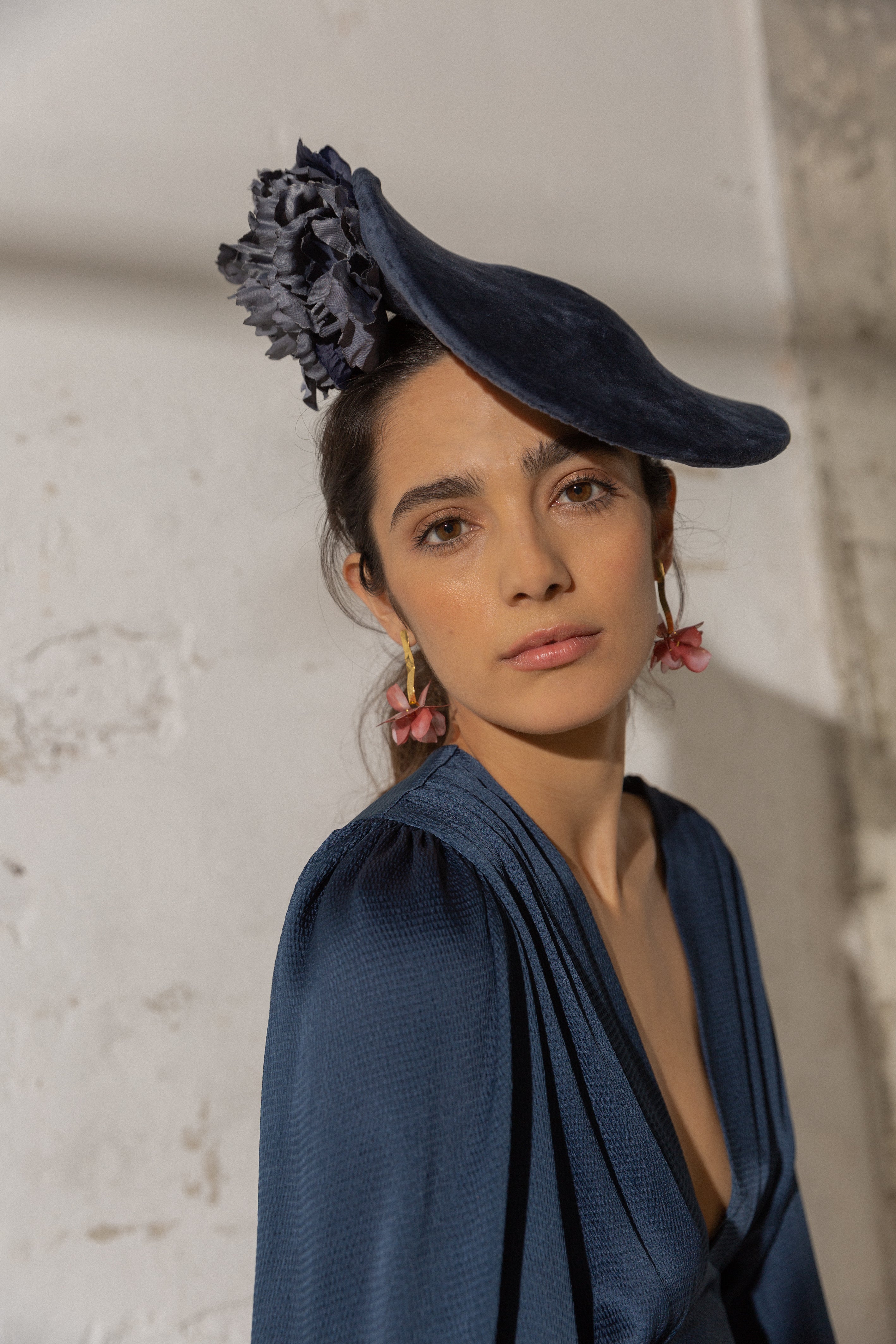 Dulcinea mediana forrada en terciopelo azul con flores laterales al tono