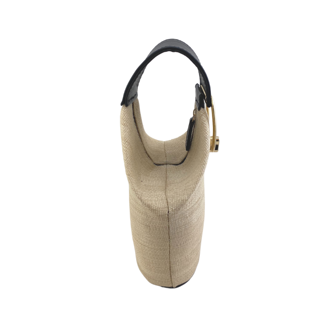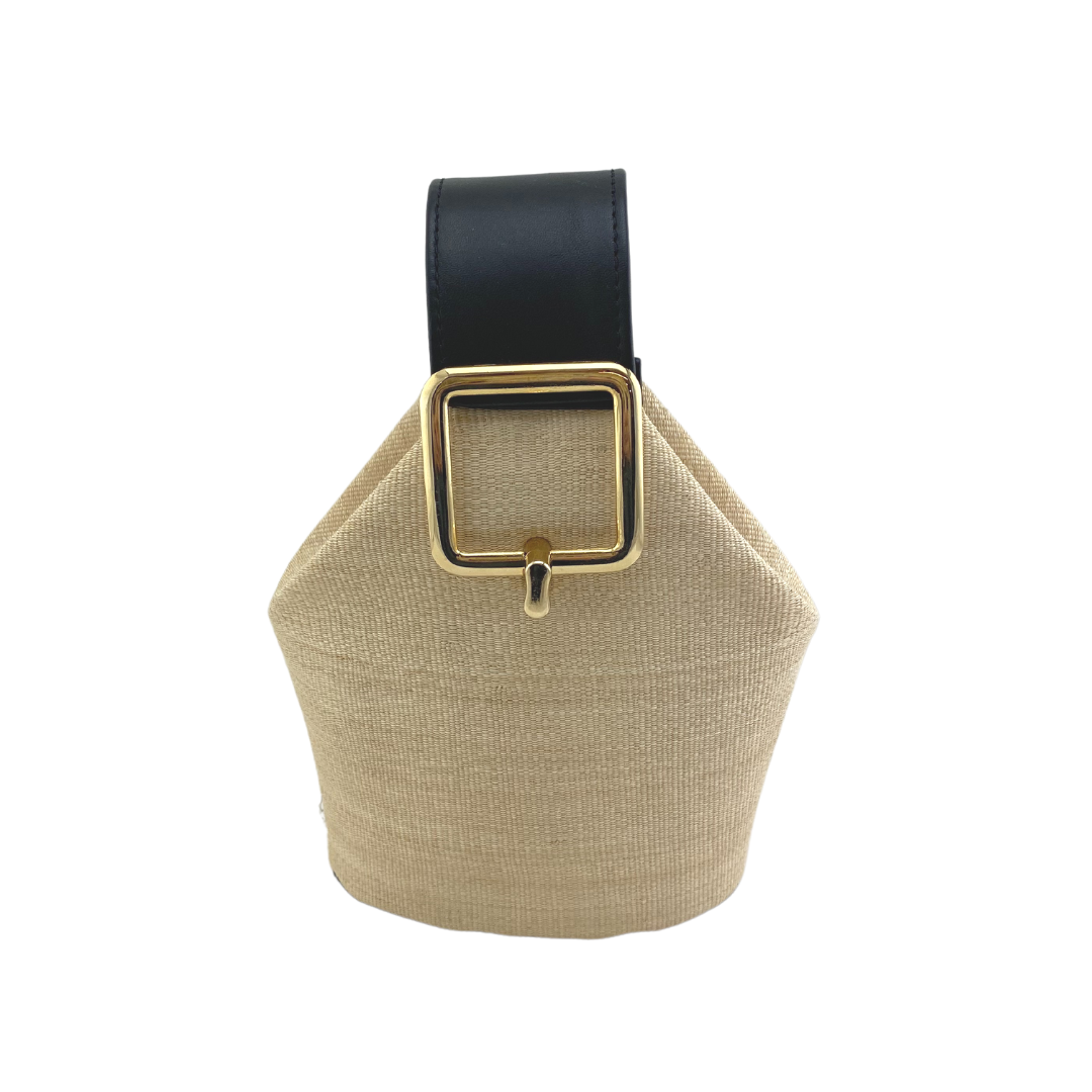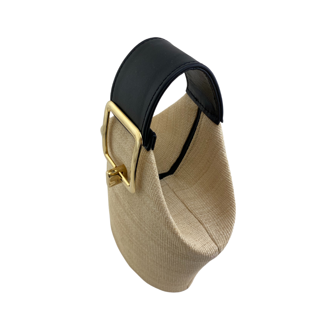 Bolso tipo cesta de tinalak natural con cremallera y asa de cuero negro y hebilla grande dorada