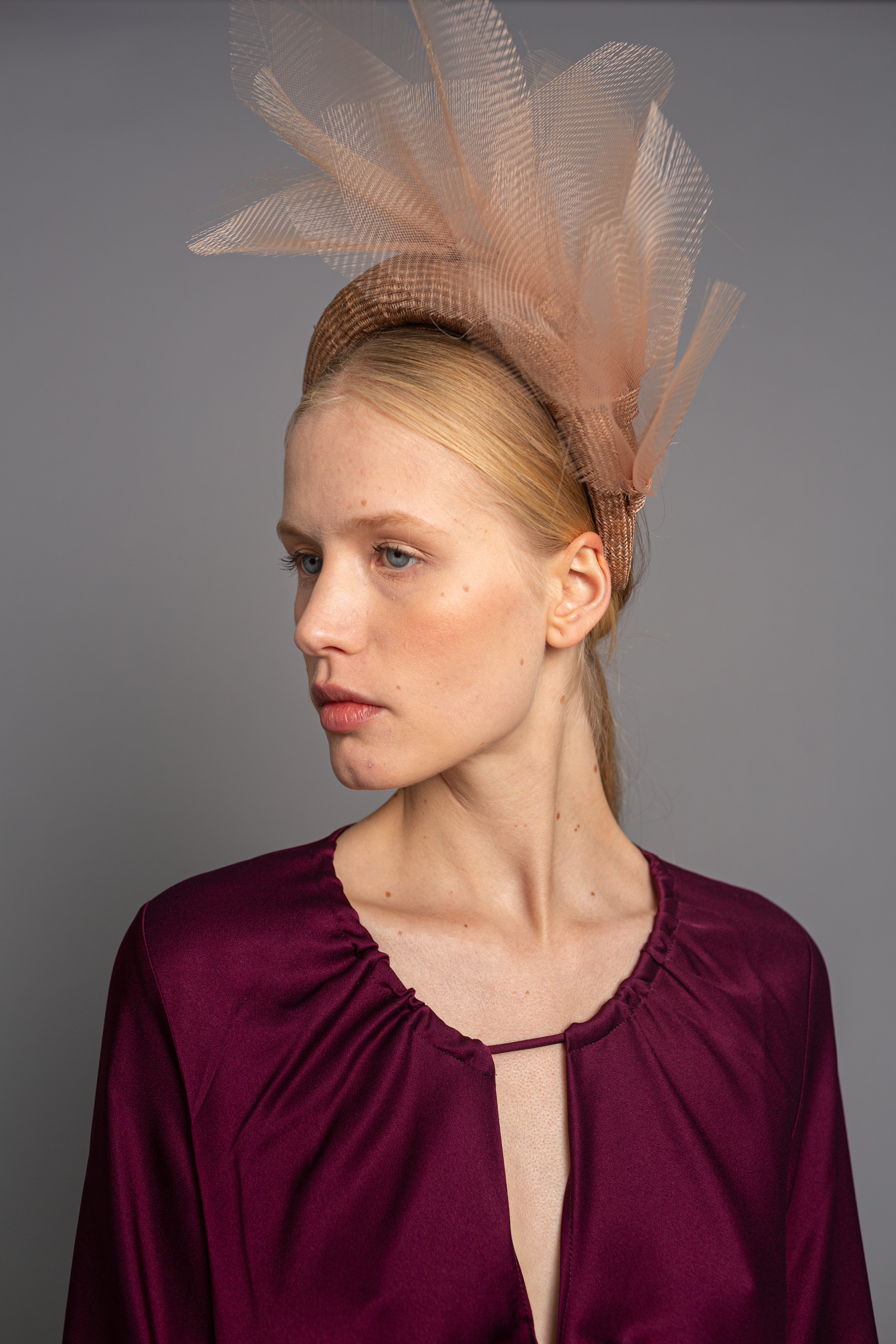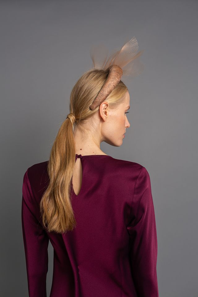 Diadema ancha forrada en parasisal tostado con hojas de crin deshilachado al tono.