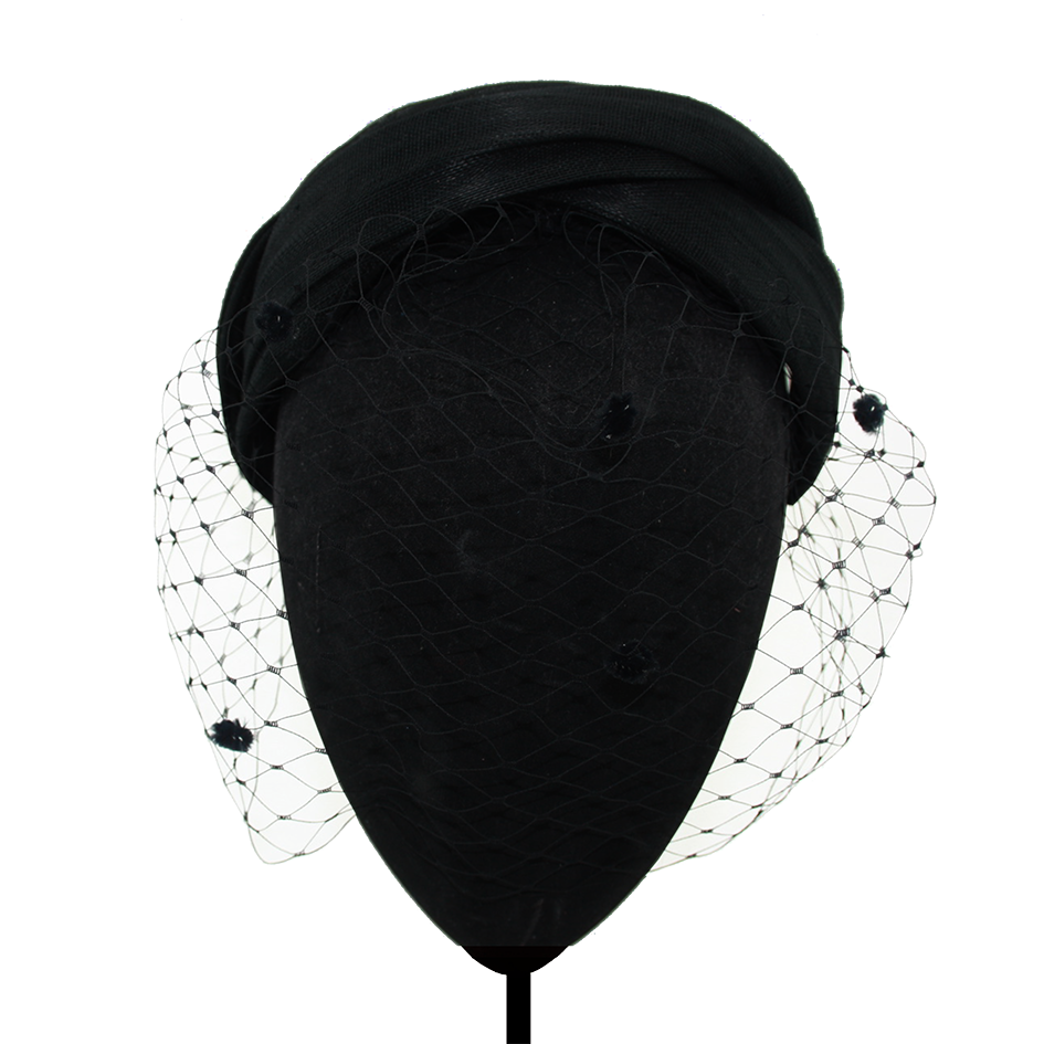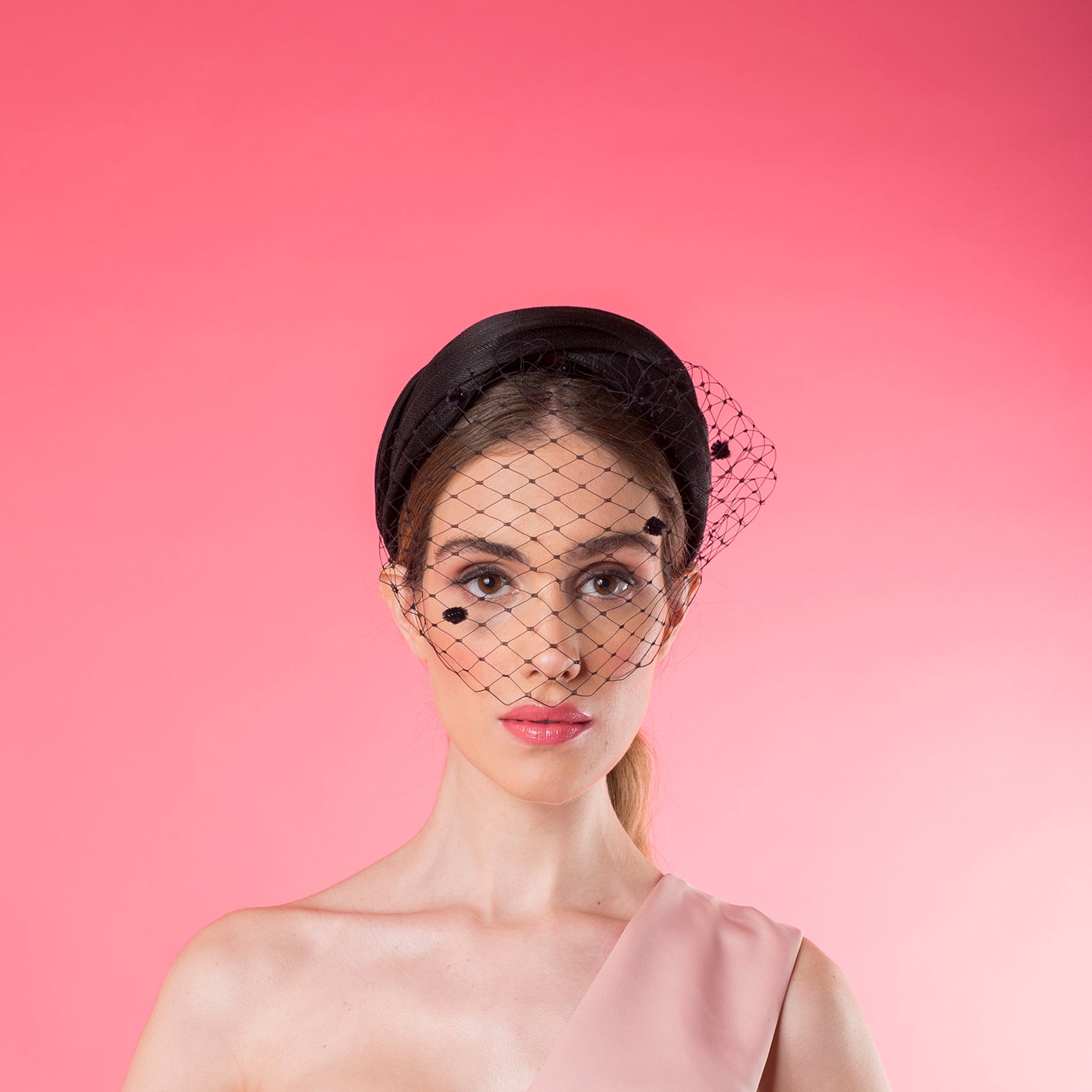 Diadema turbante negra de rafia con velo de plumeti al tono