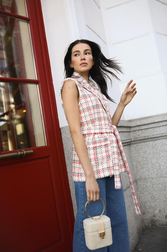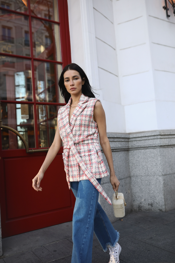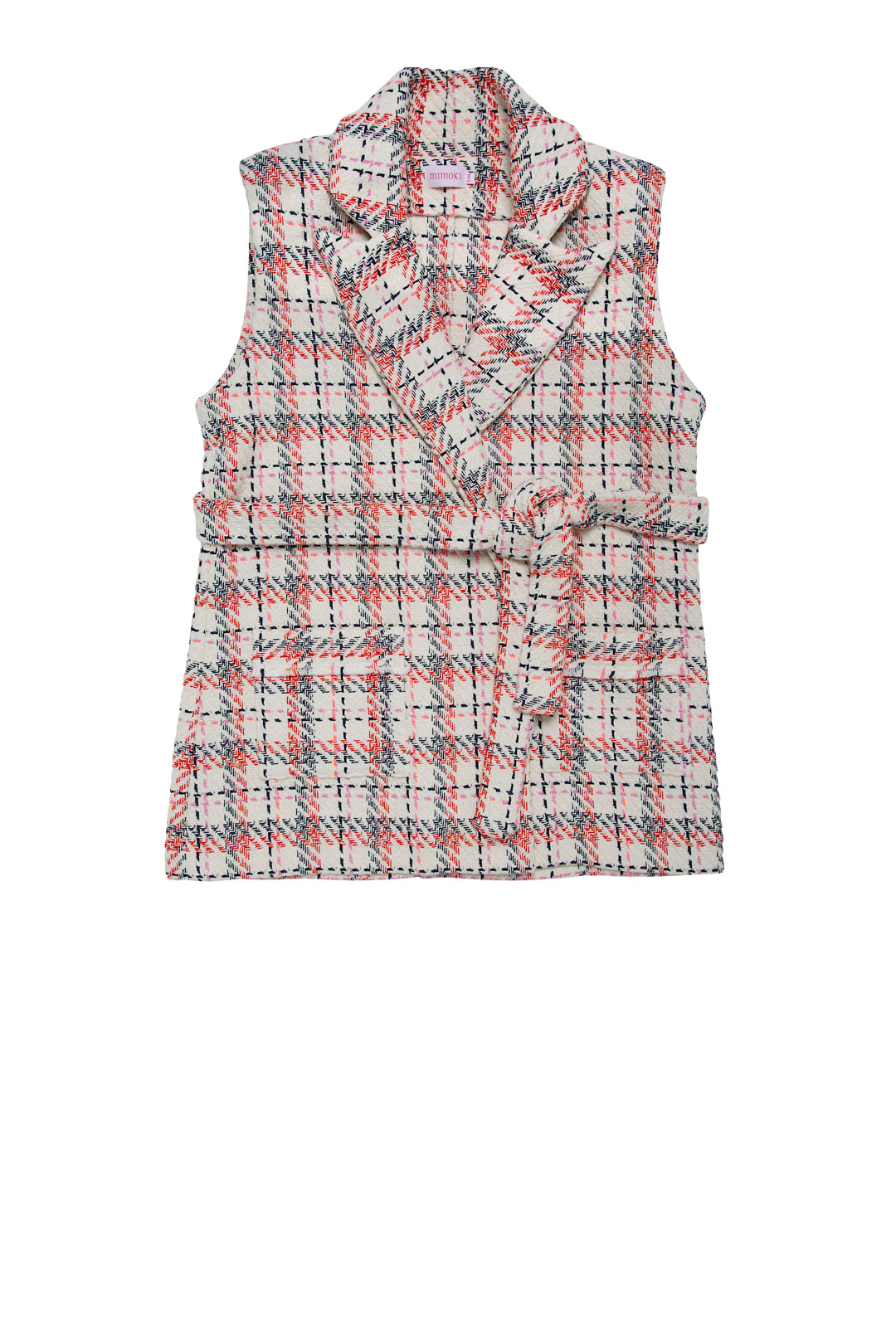 Chaleco de cuello solapa en tejido tweed, bolsillos en delantero y cierre frontal con cinturón.