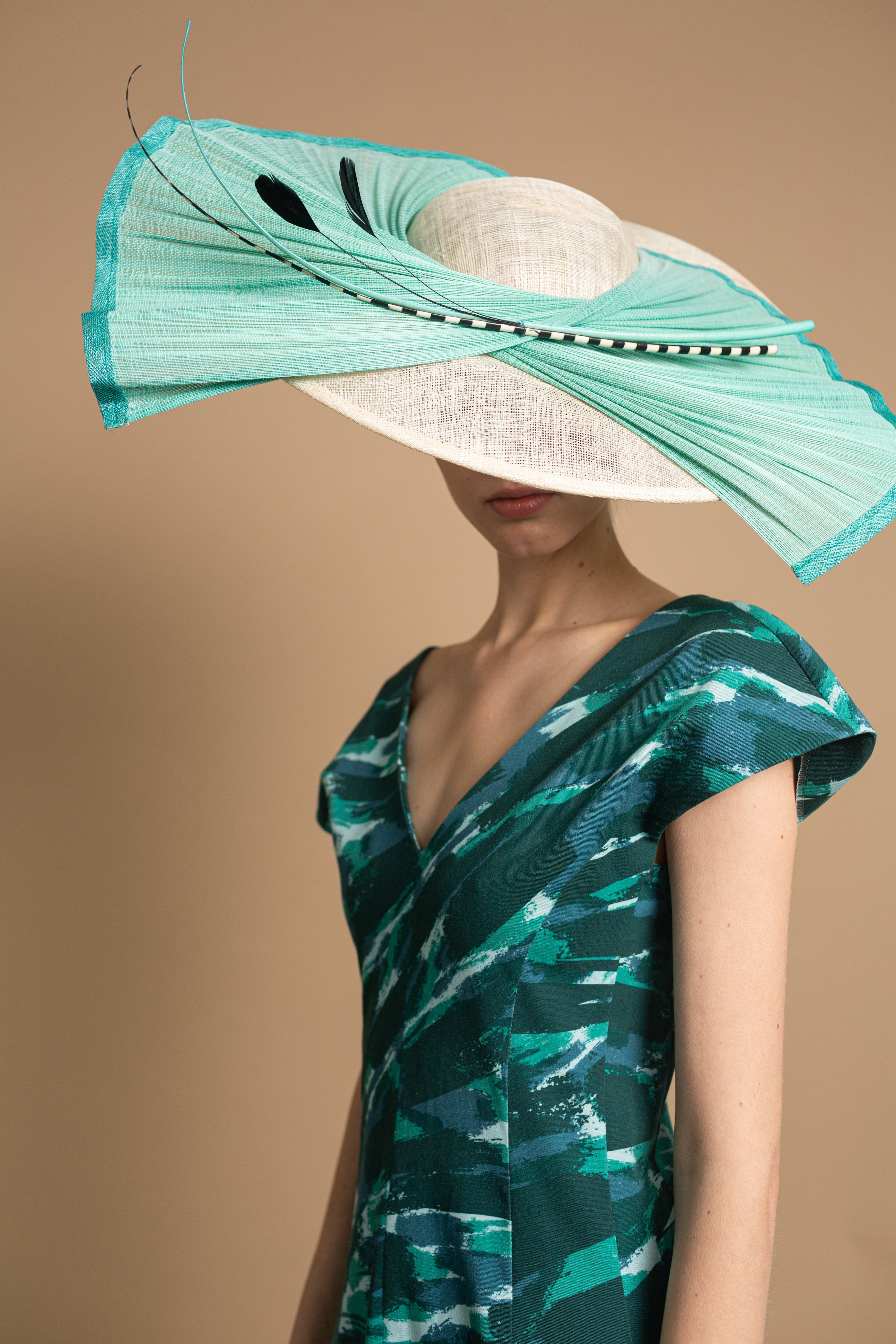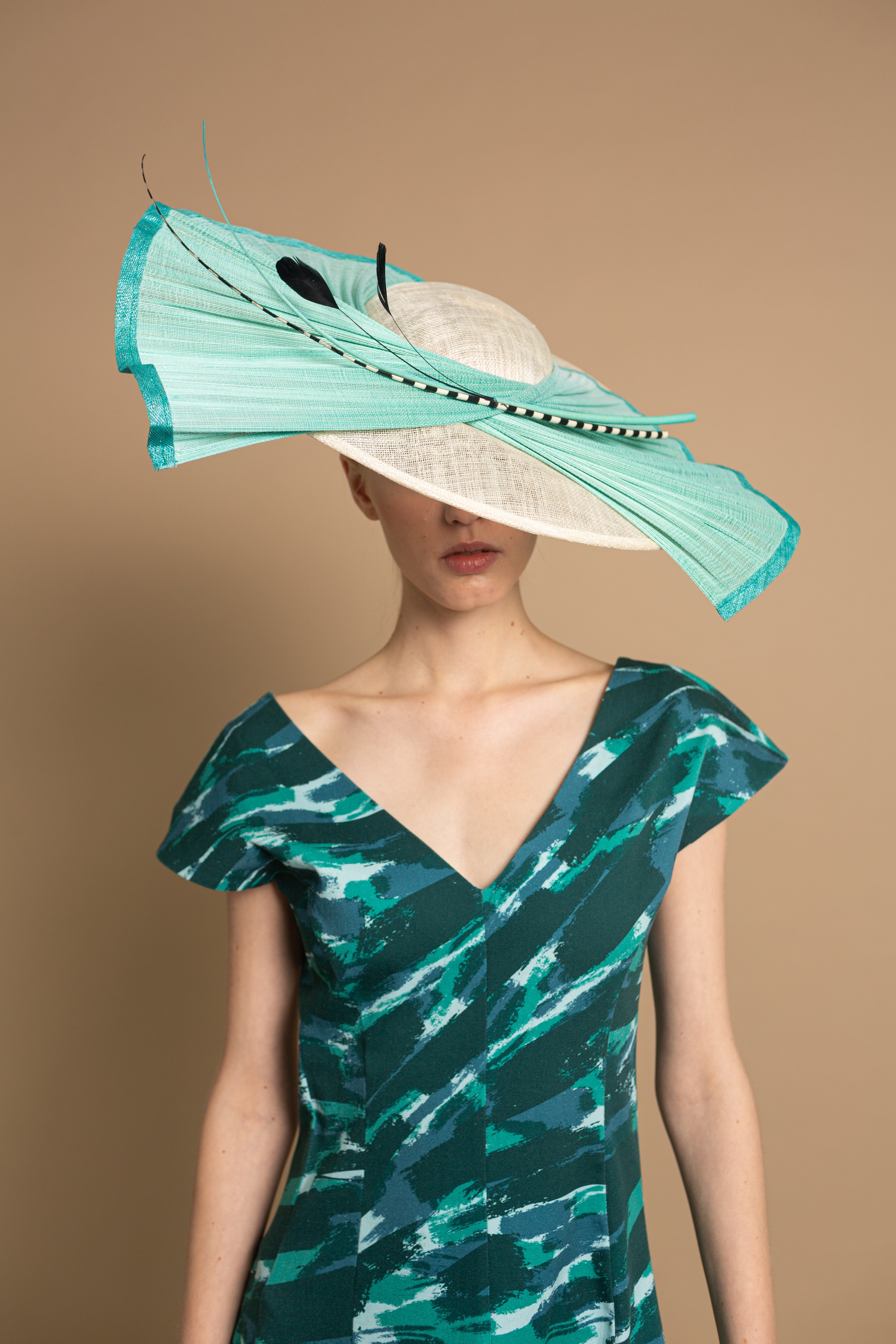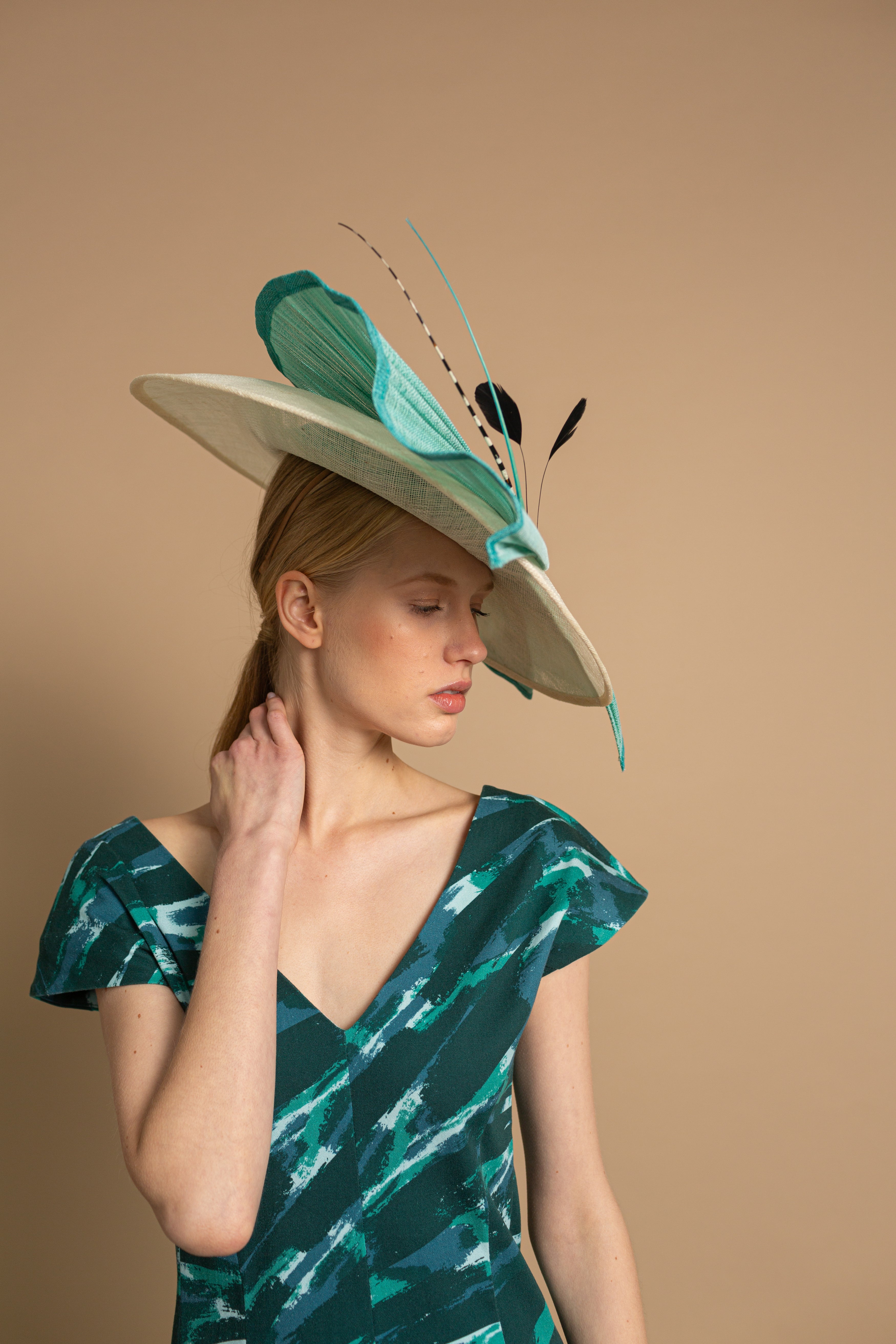 Dulcinea de sinamay crudo con abanico cruzado de rafia rígida turquesa, raqui B/N y truquesa con antenitas