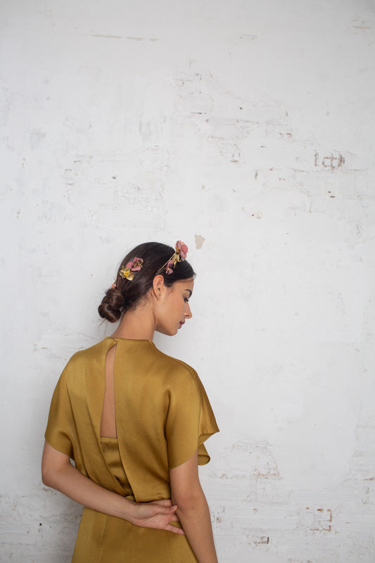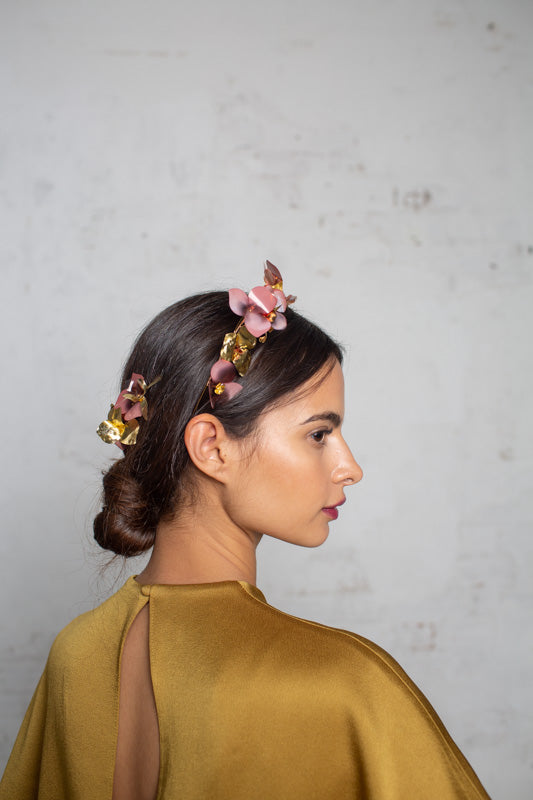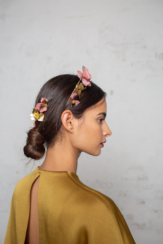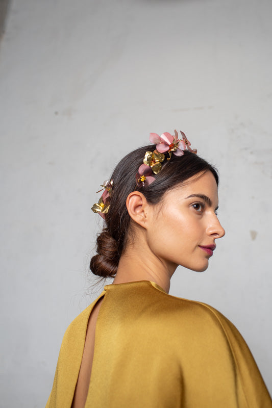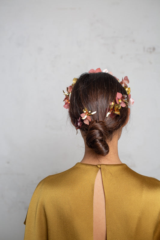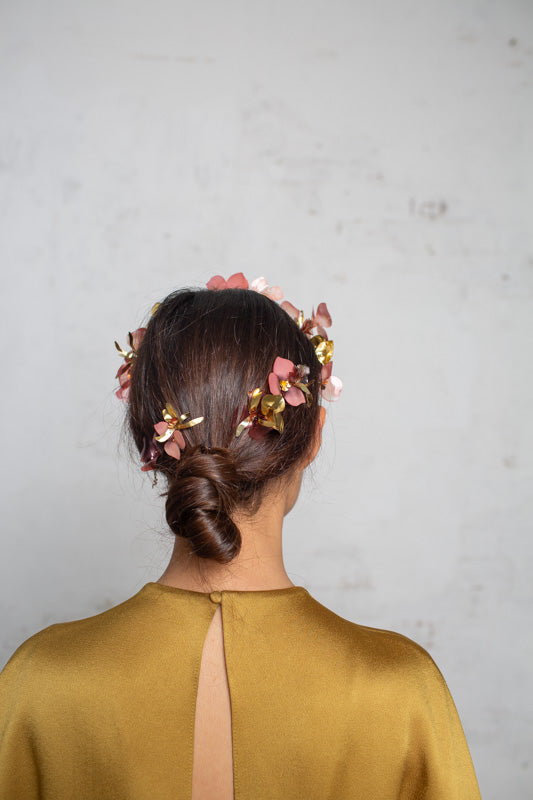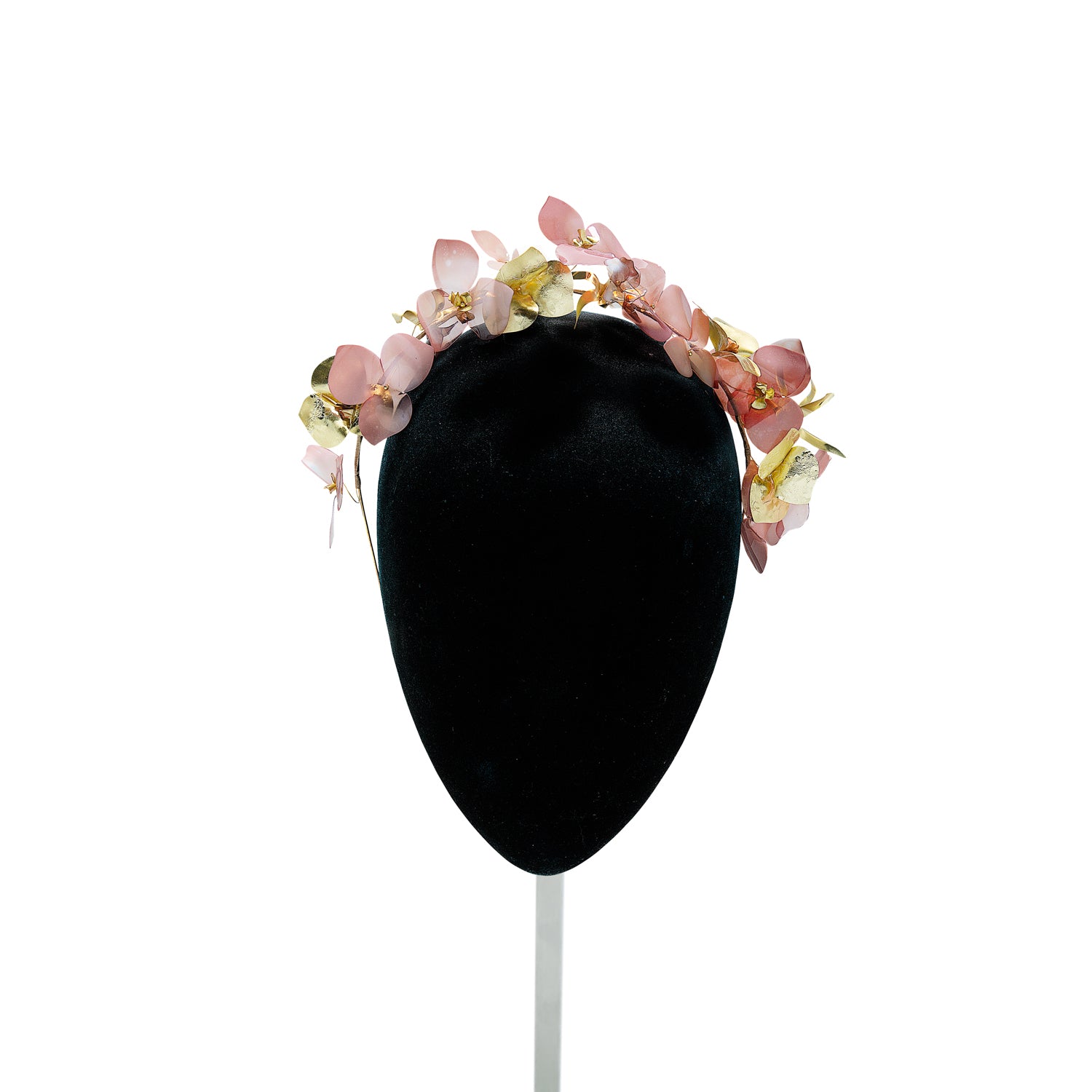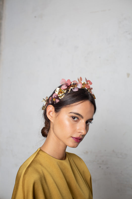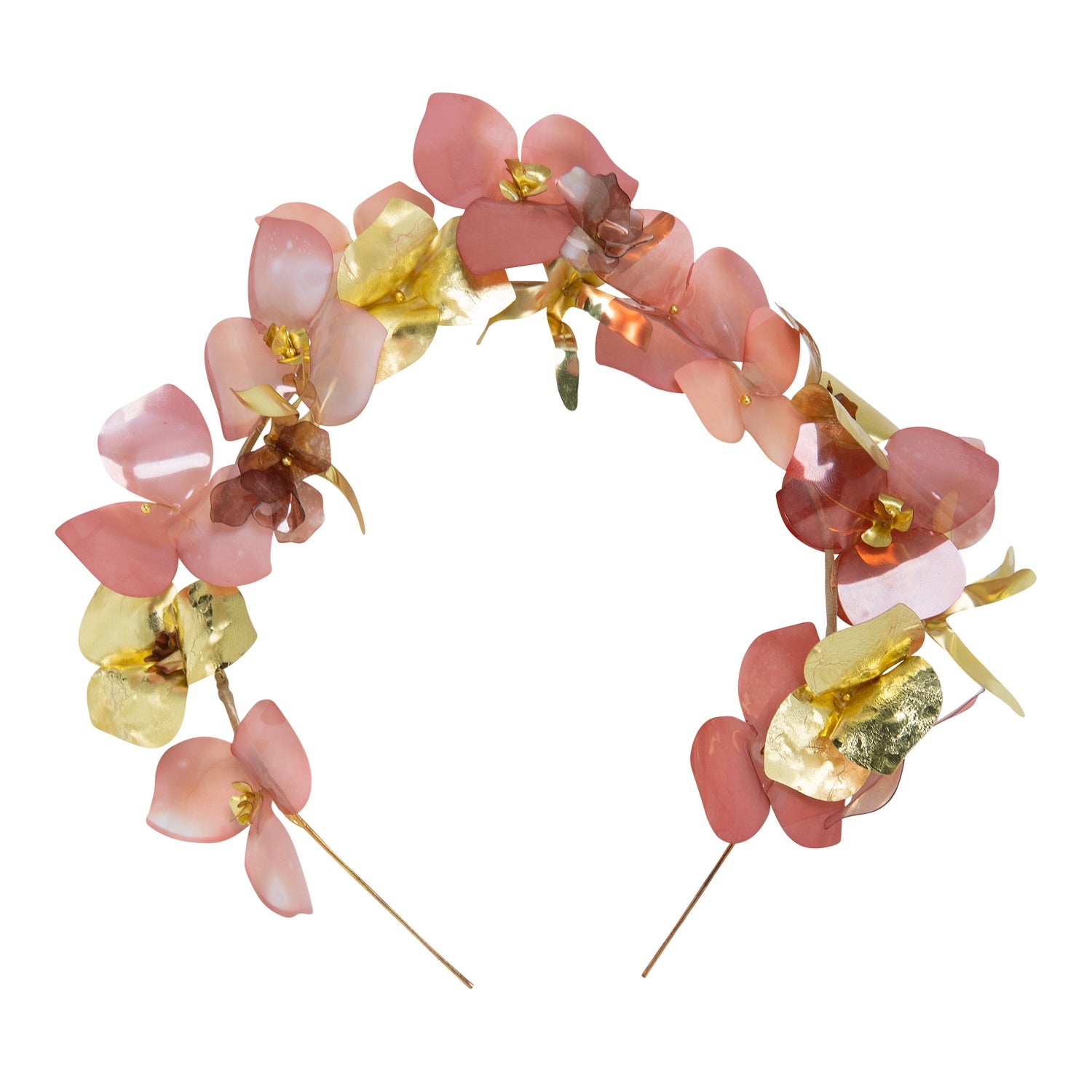 Diadema de flores de plástico reciclado en tonos rosas y dorados