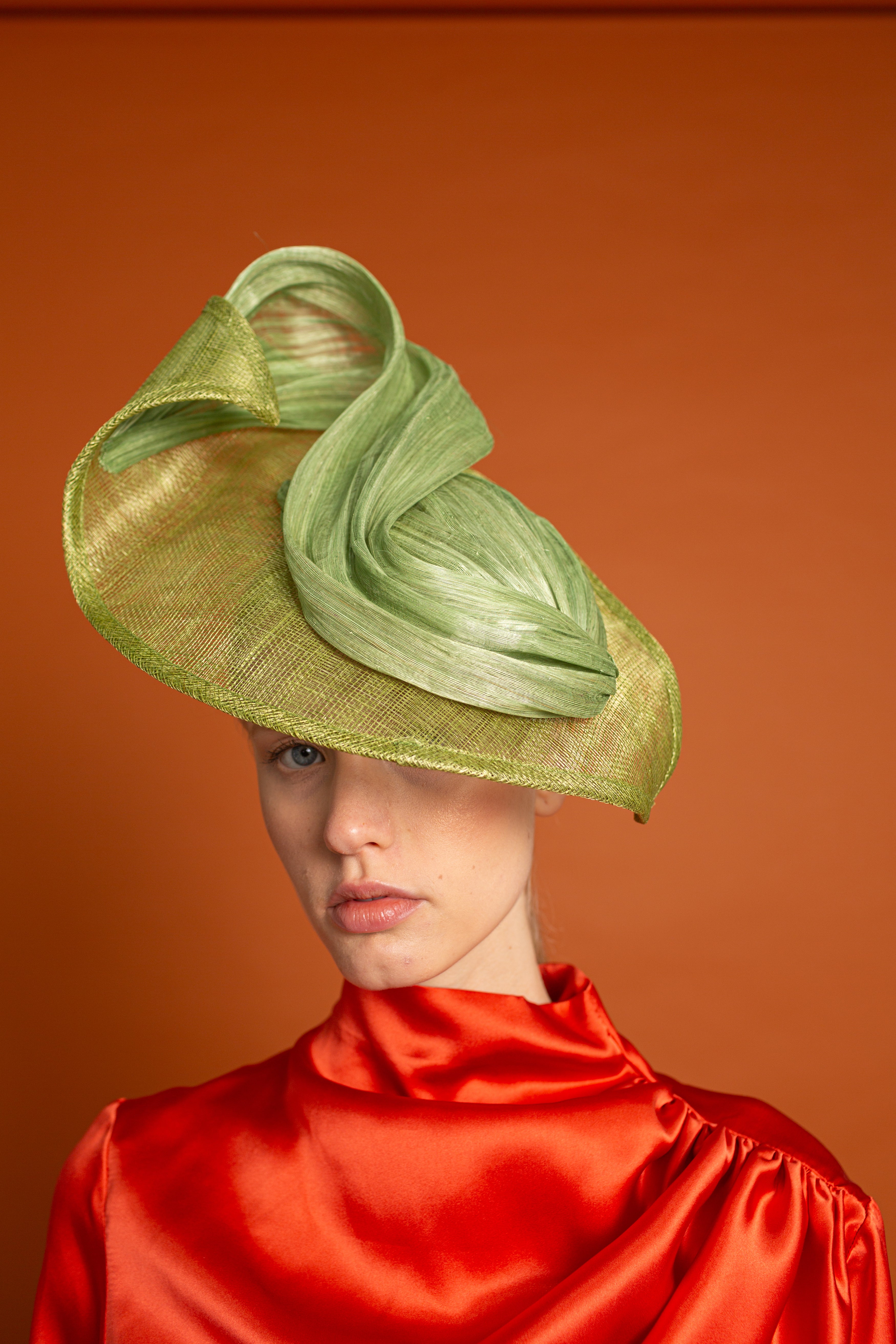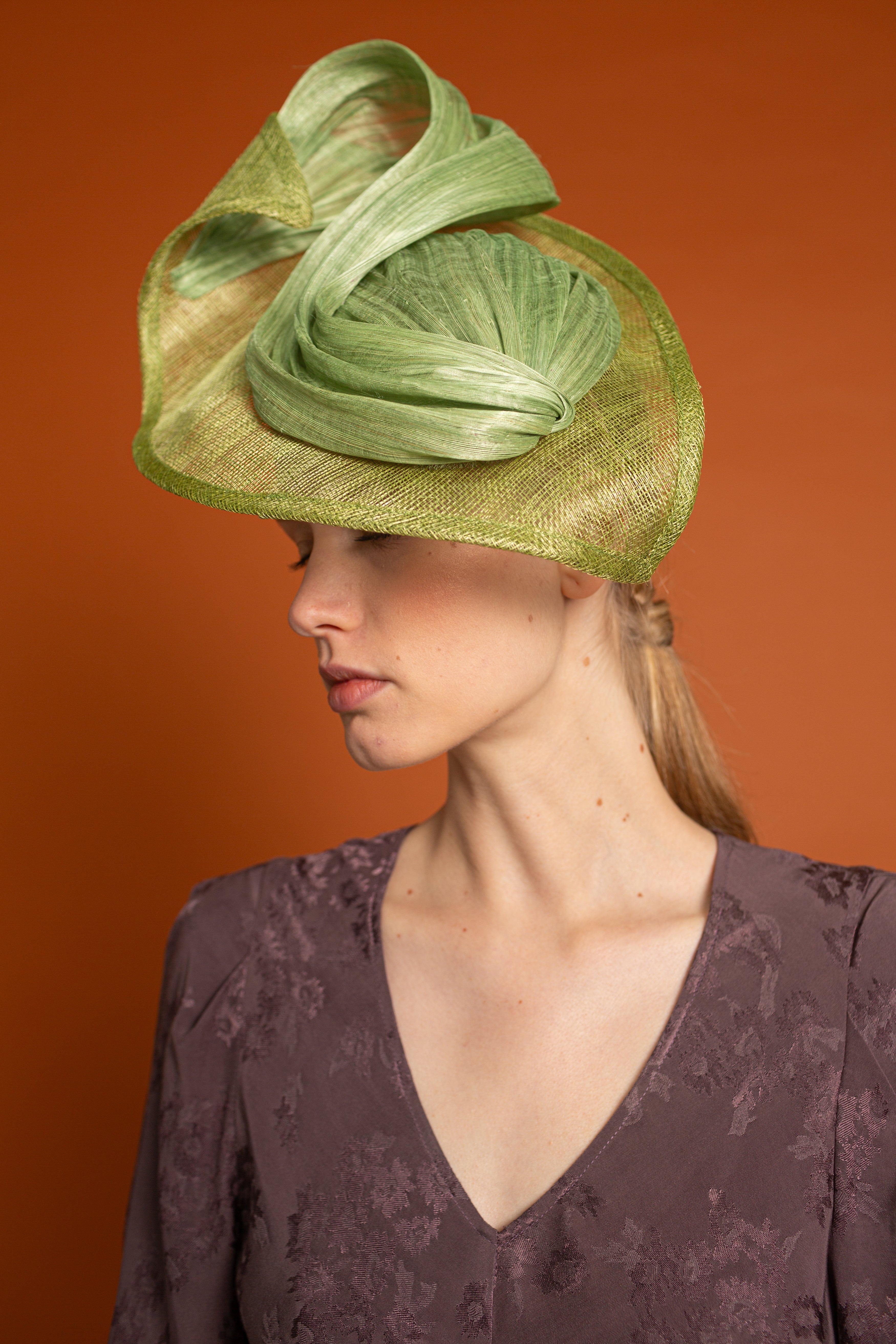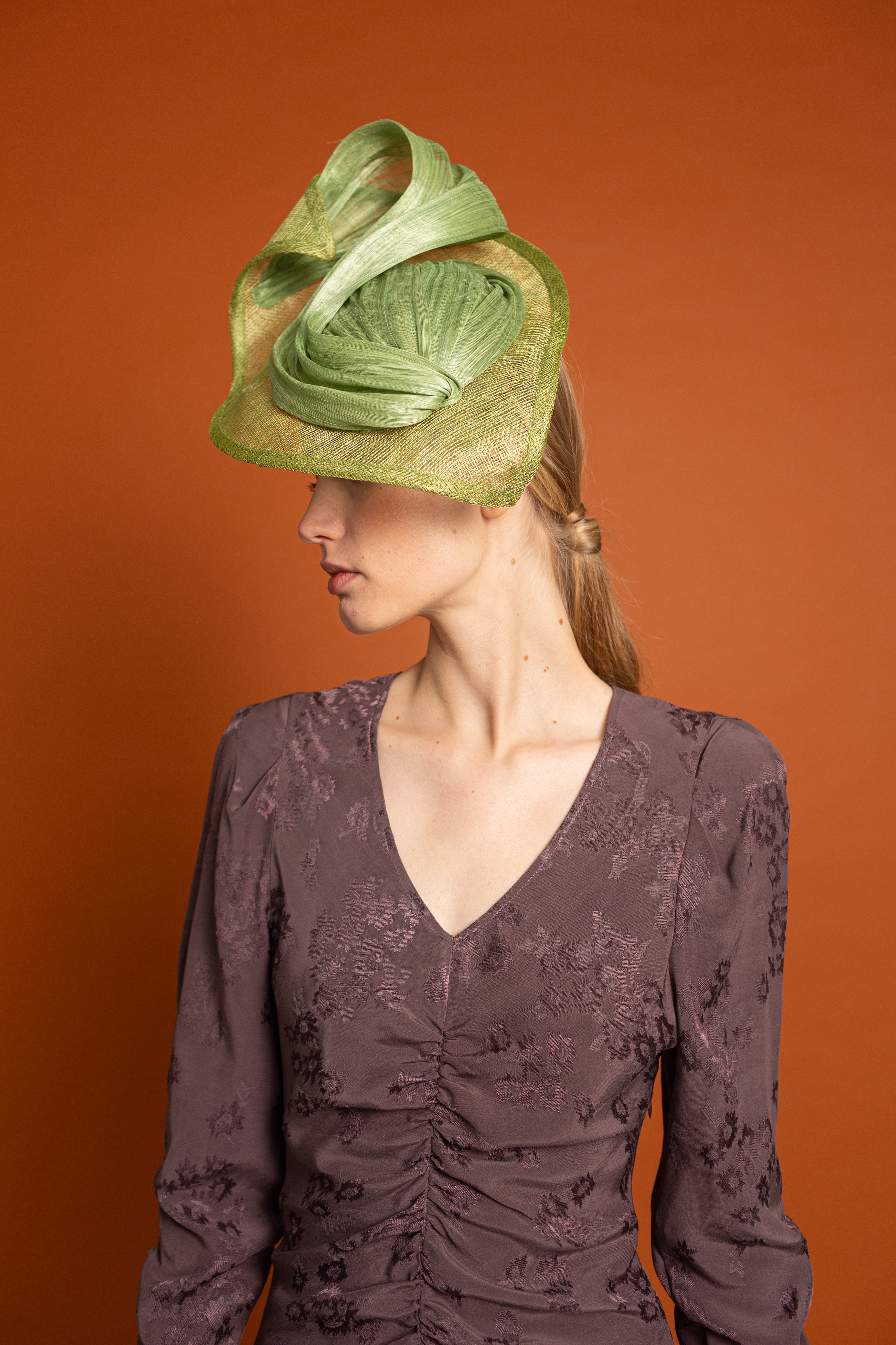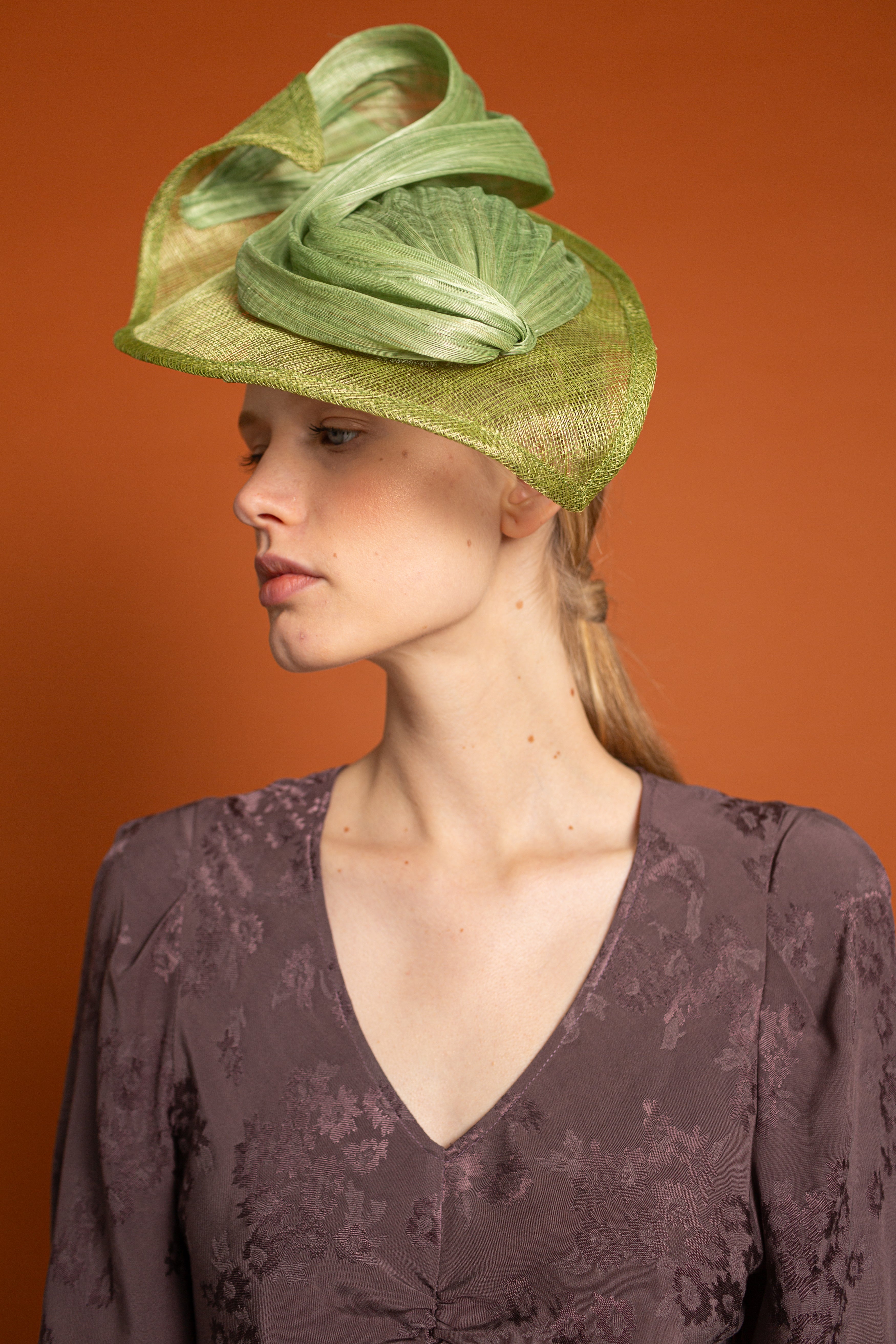 Estructura tipo lágrima de sinamay verde con abanico de rafia de seda al tono.