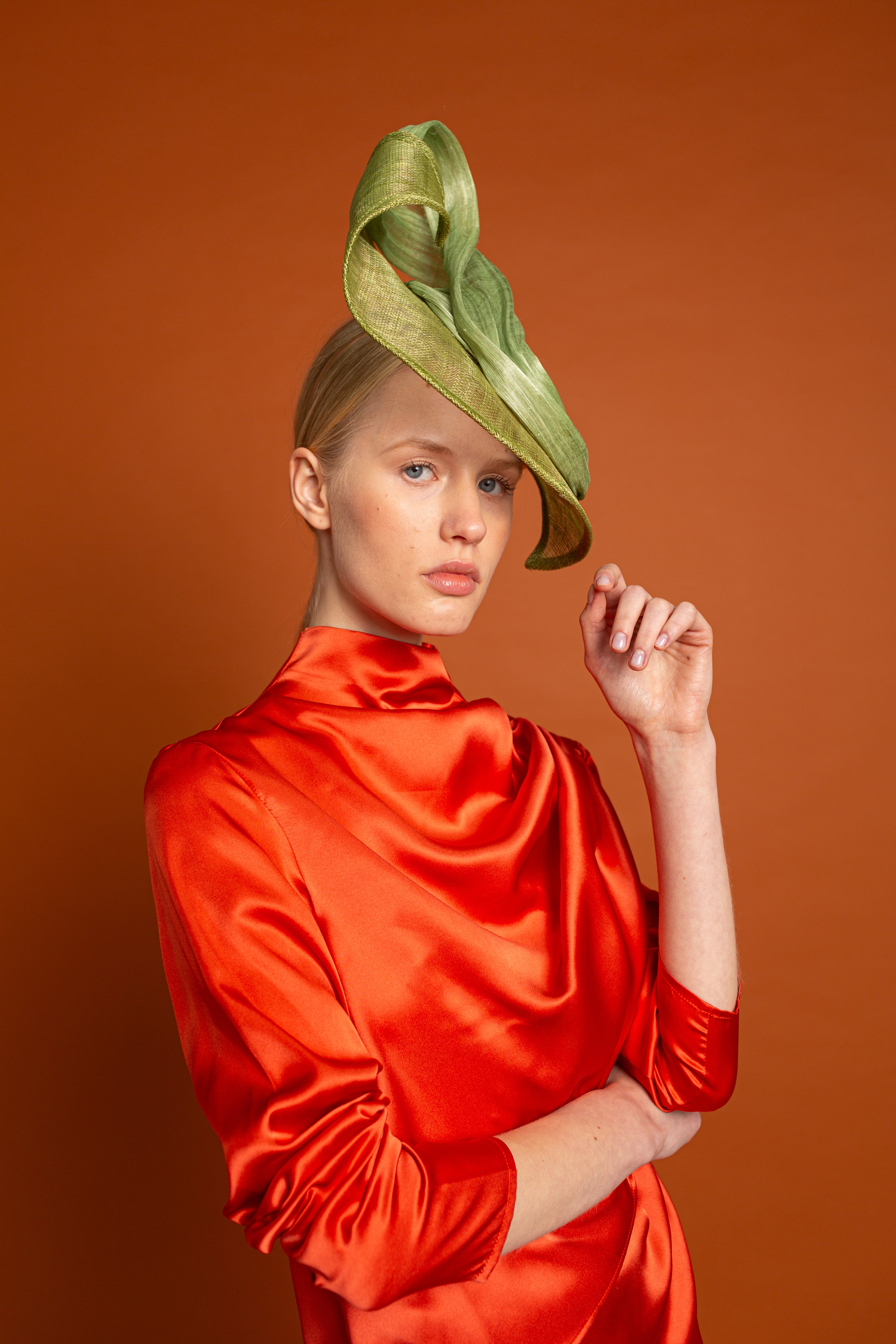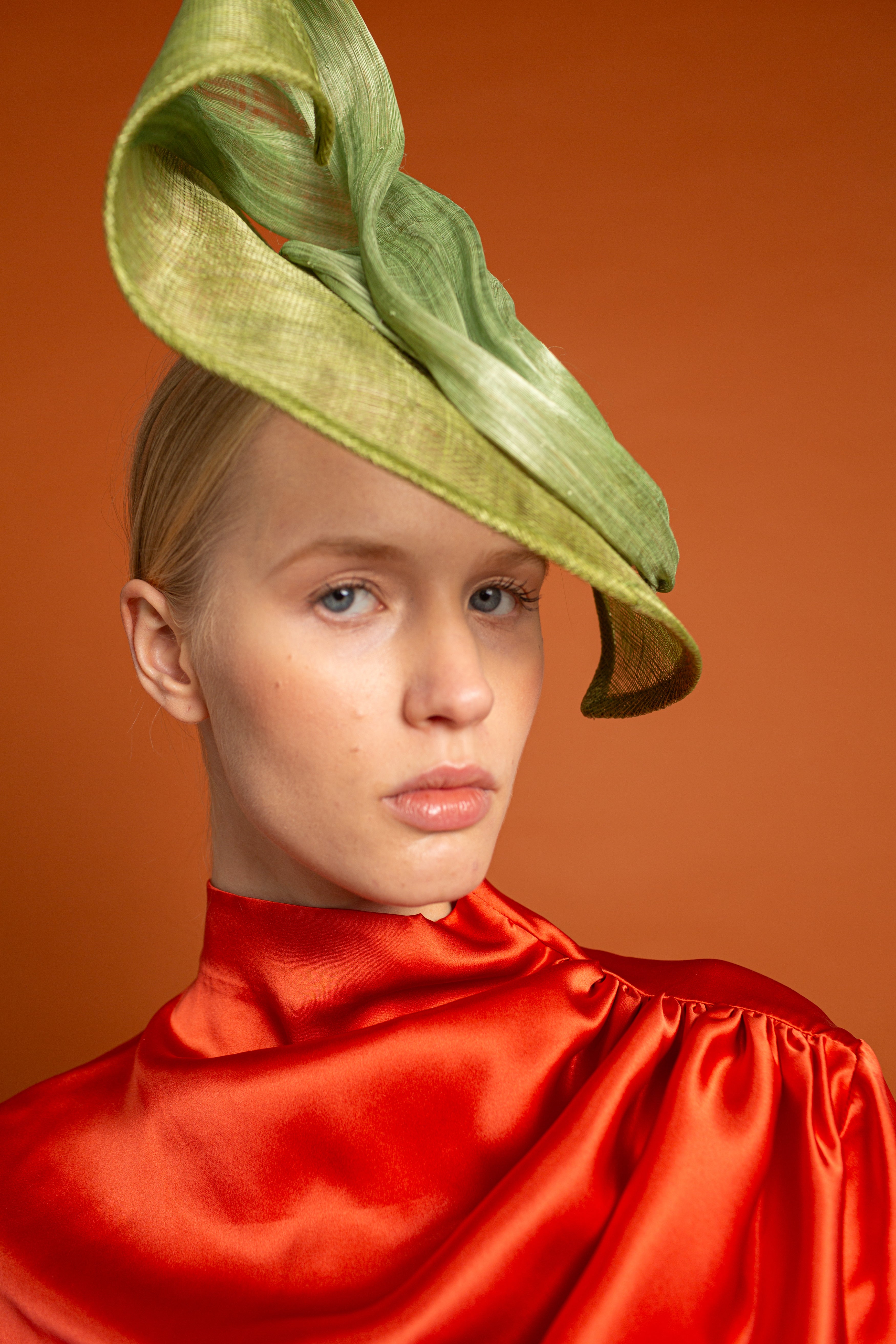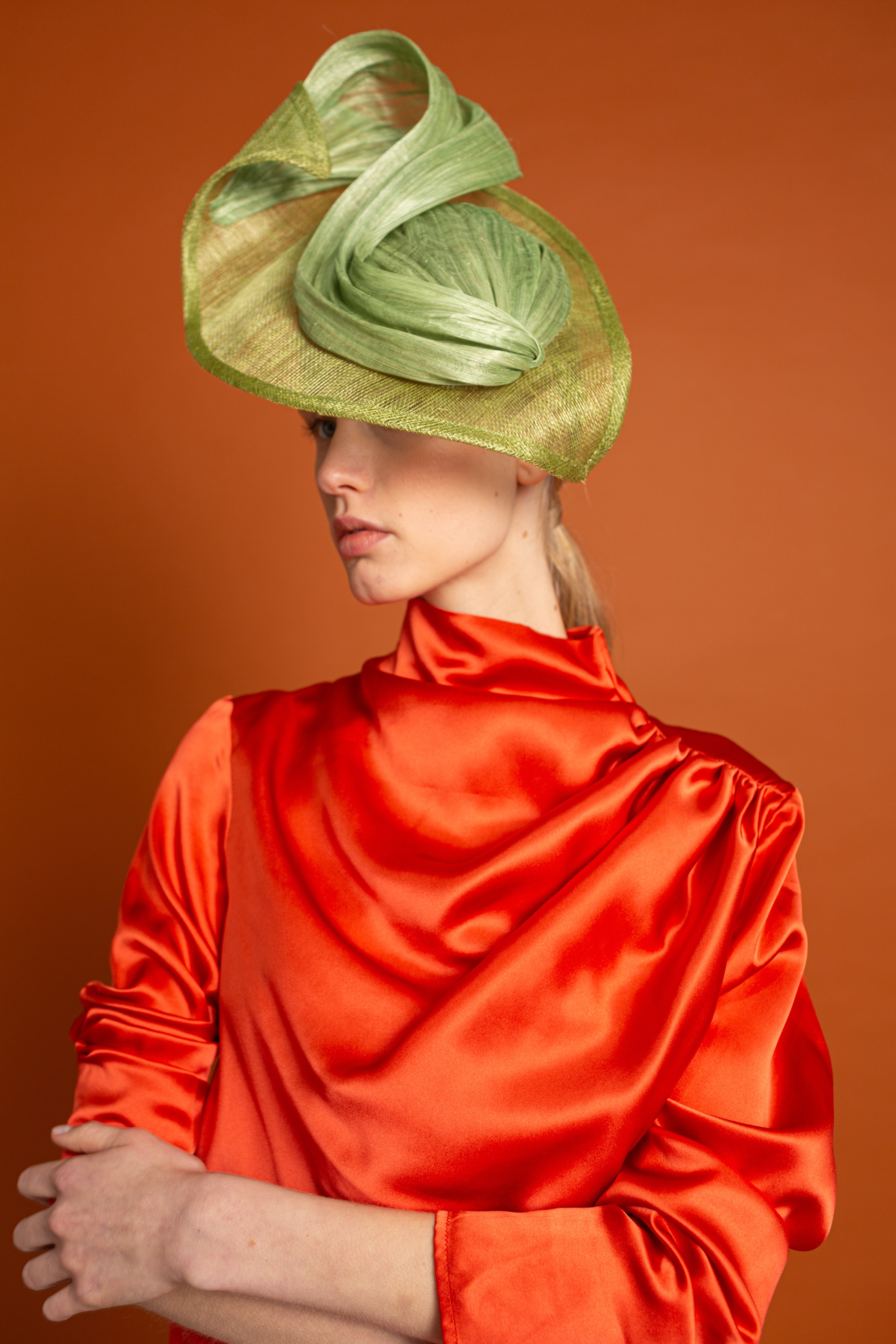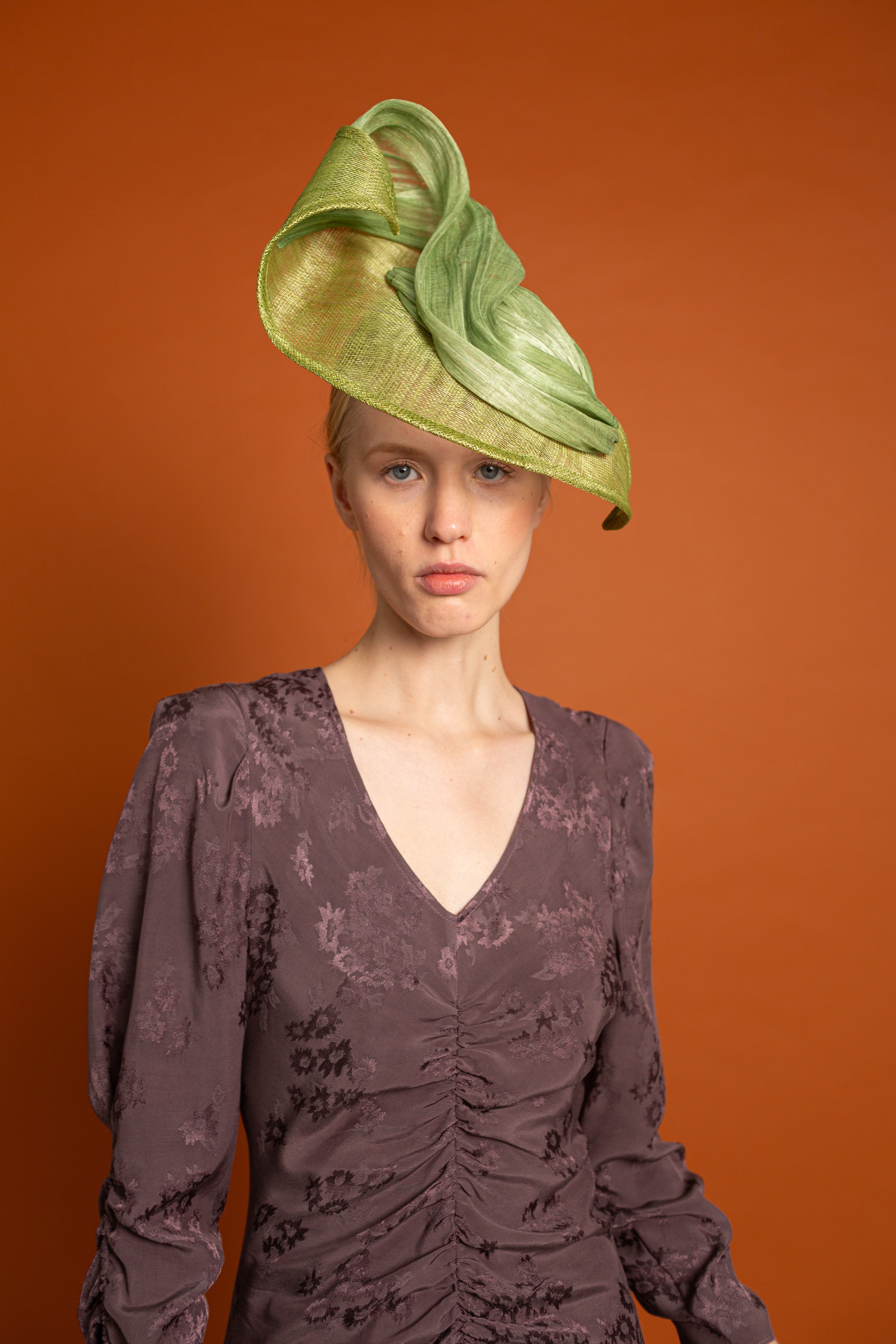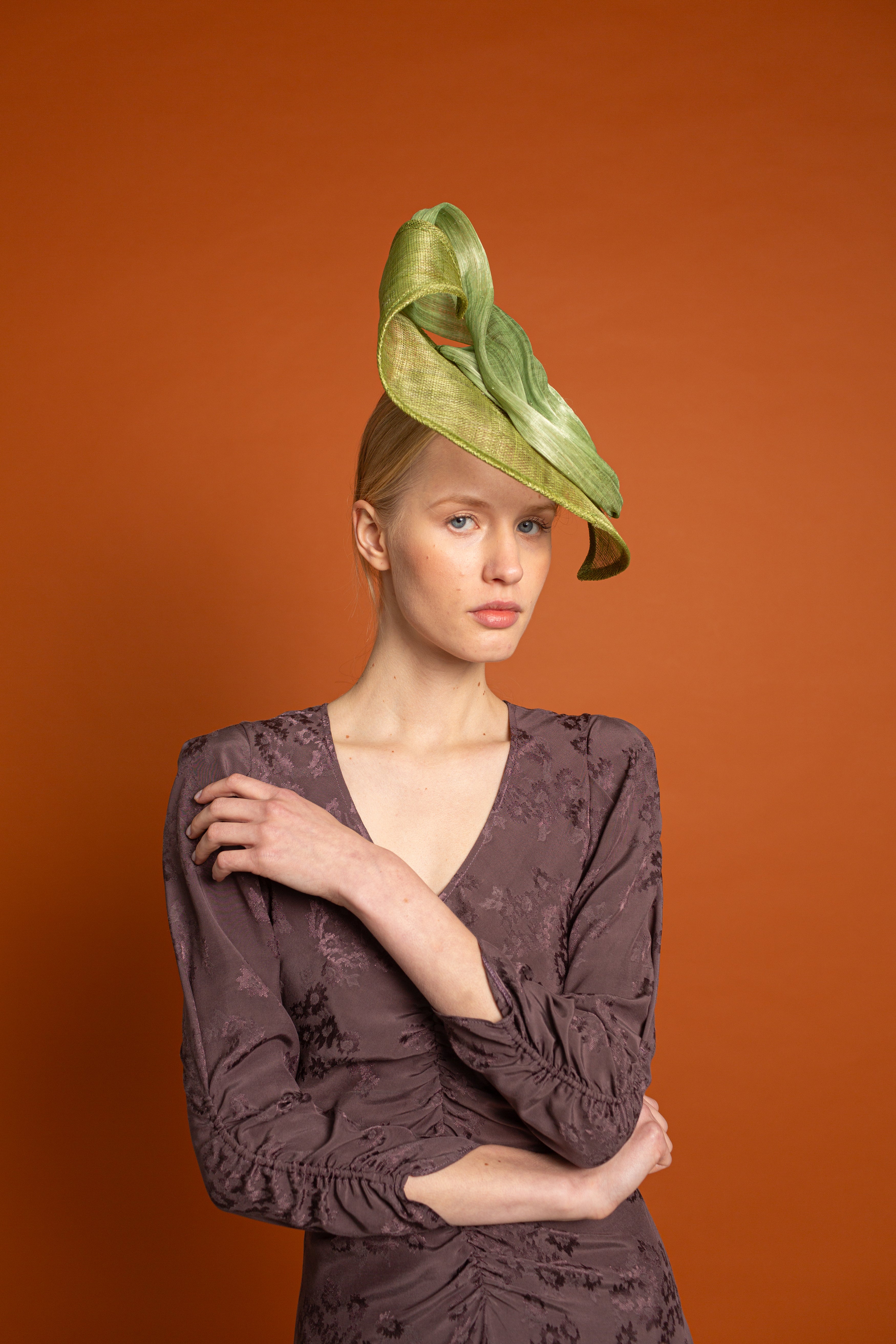Estructura tipo lágrima de sinamay verde con abanico de rafia de seda al tono.
