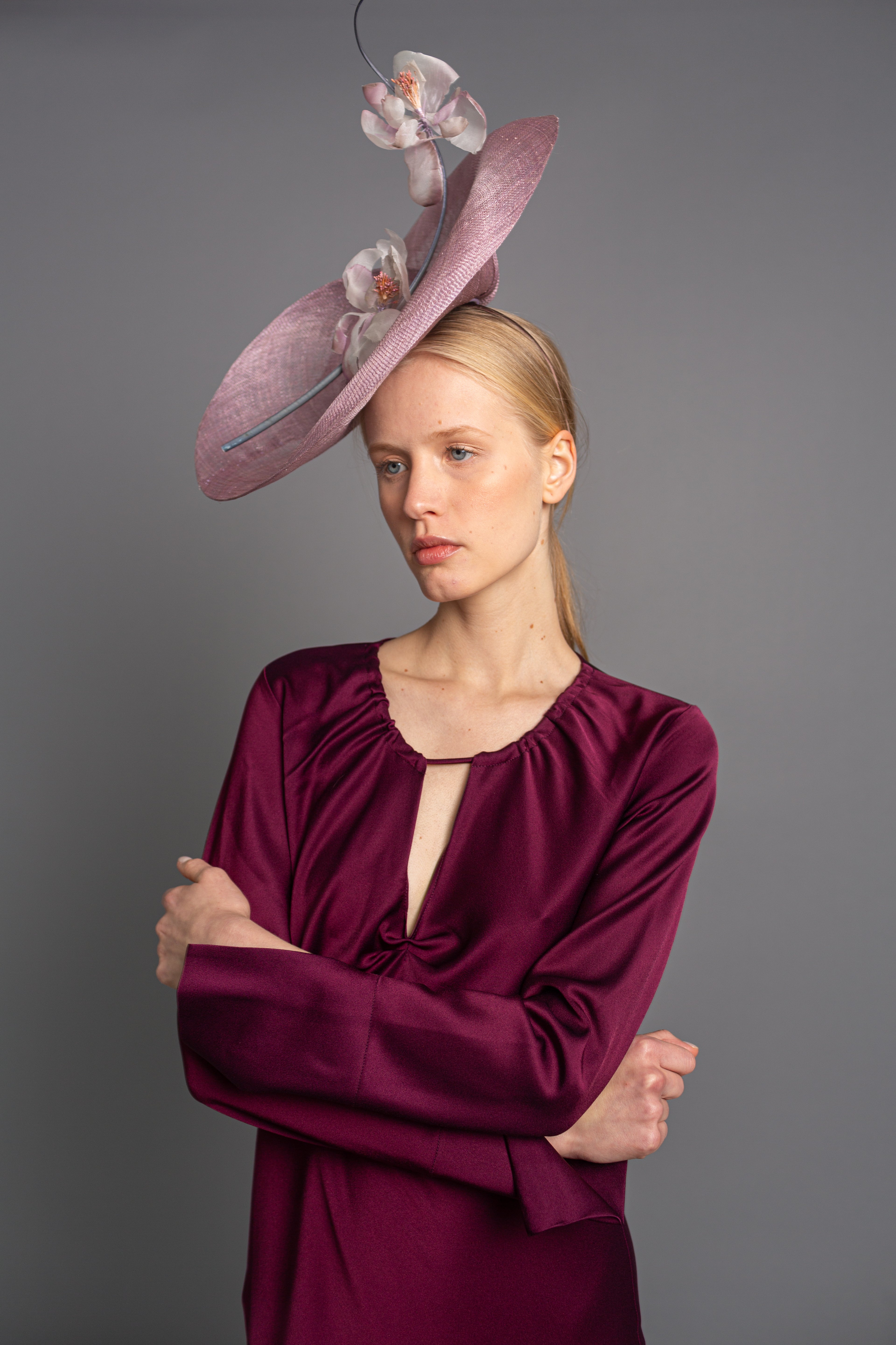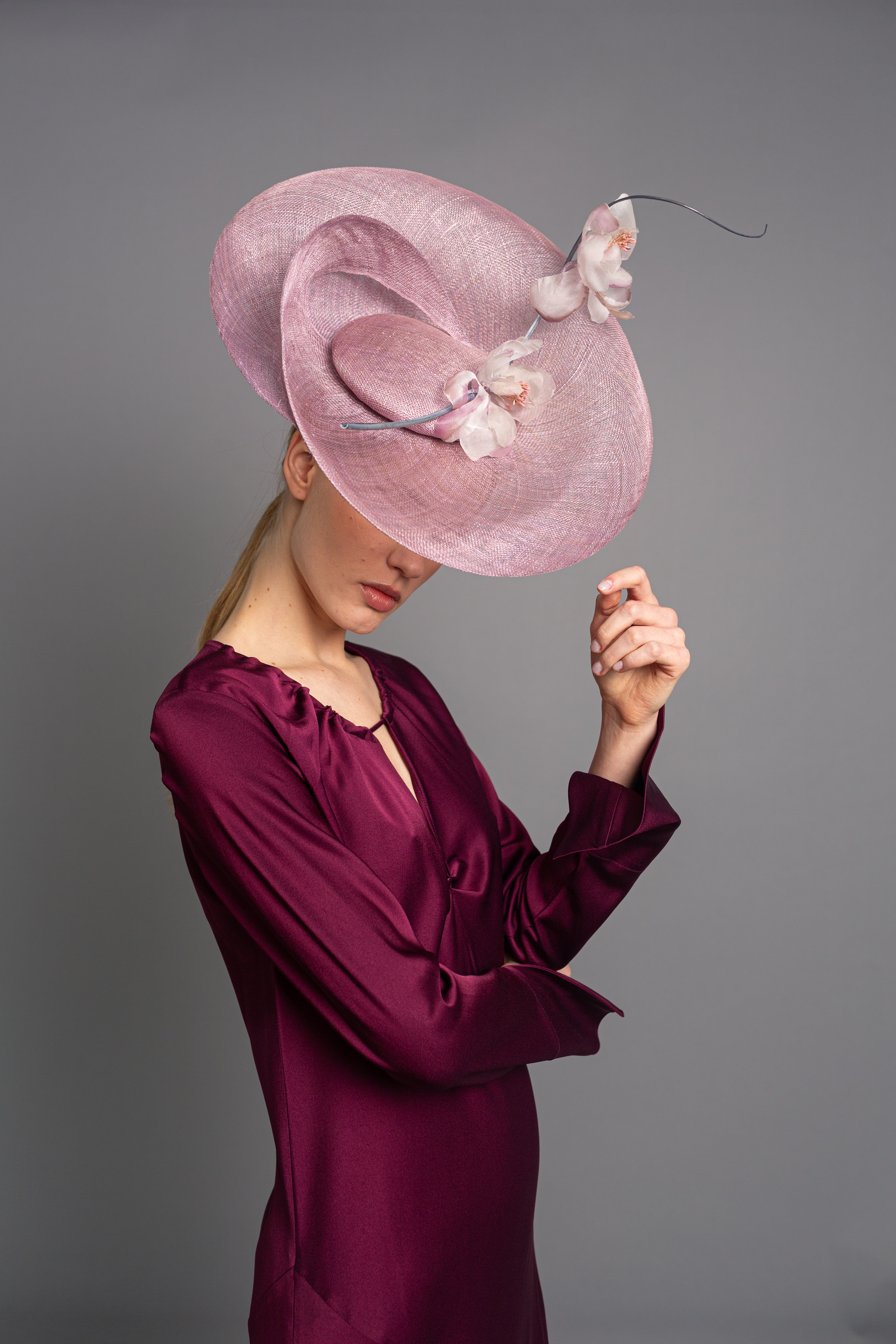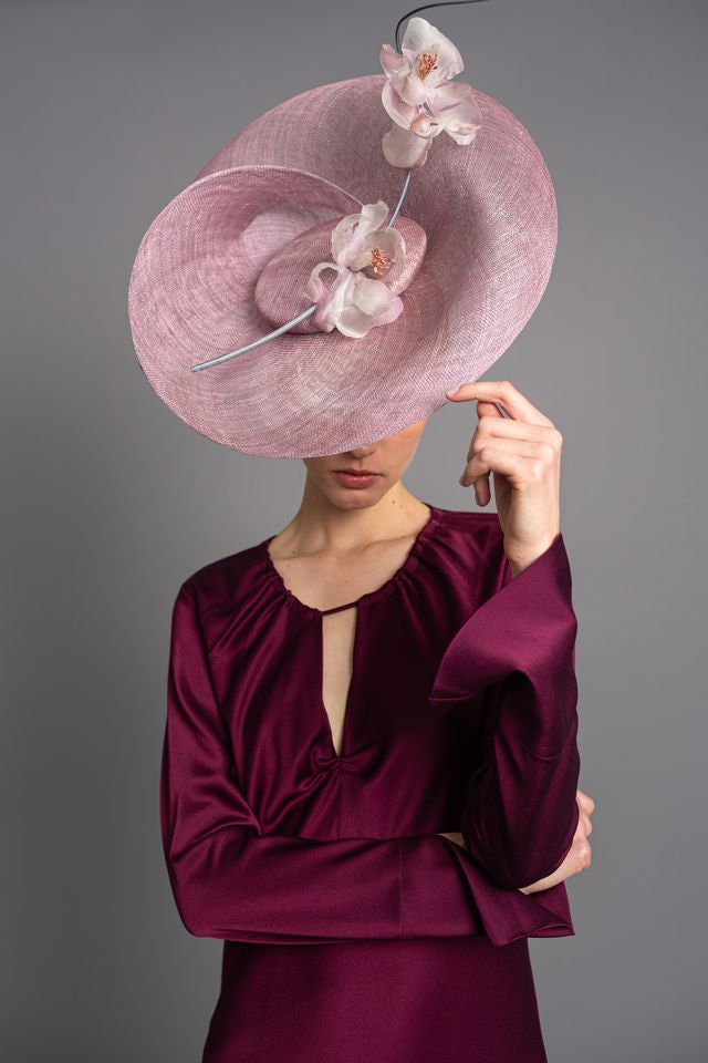 Dulcinea de bies de sinamay rosa malva con raqui gris y flores de seda al tono.