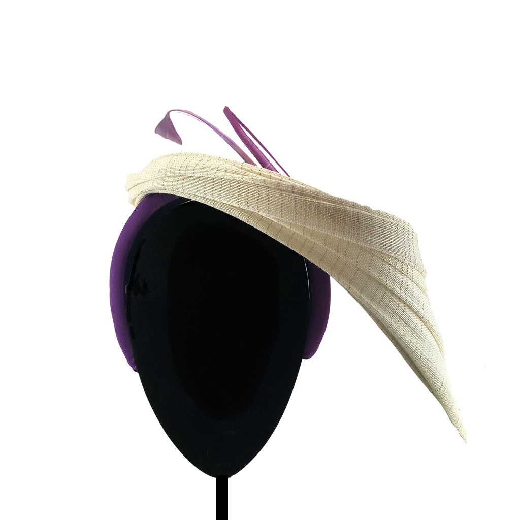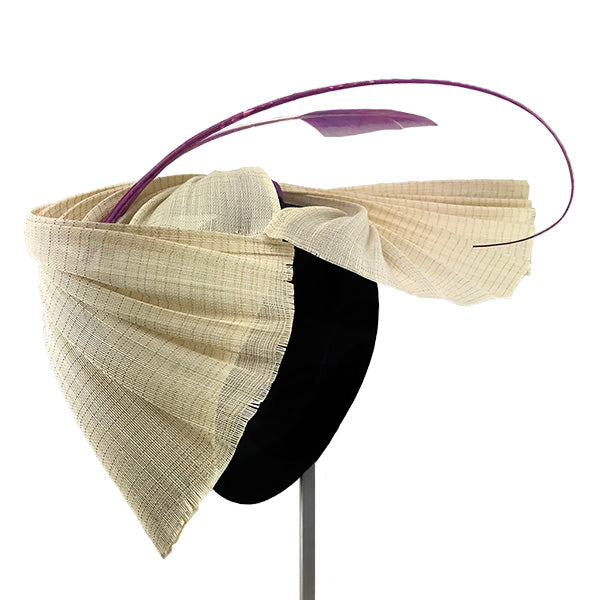 Diadema ancha malva con abanico de rafia rígida natural y raqui y pluma malva