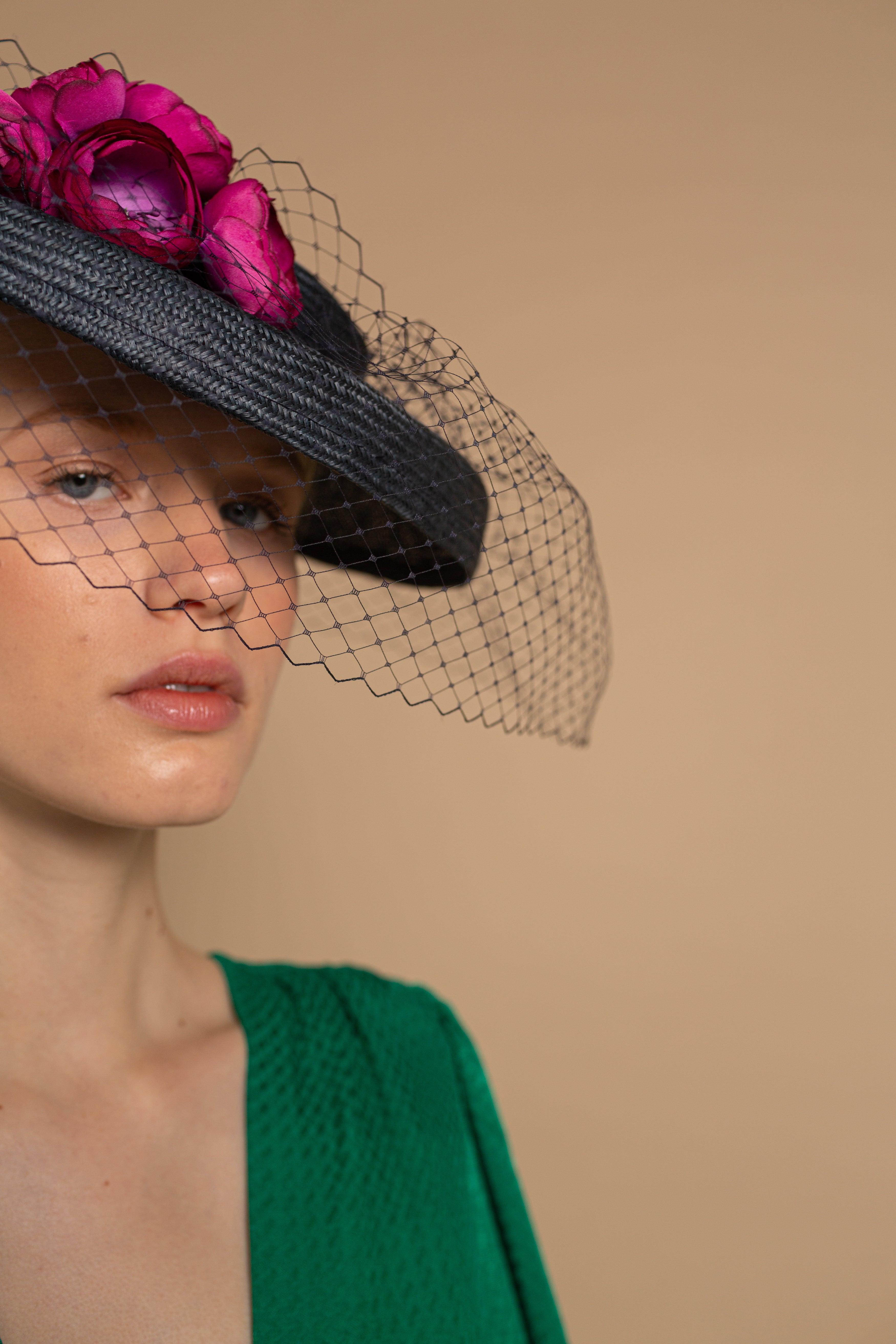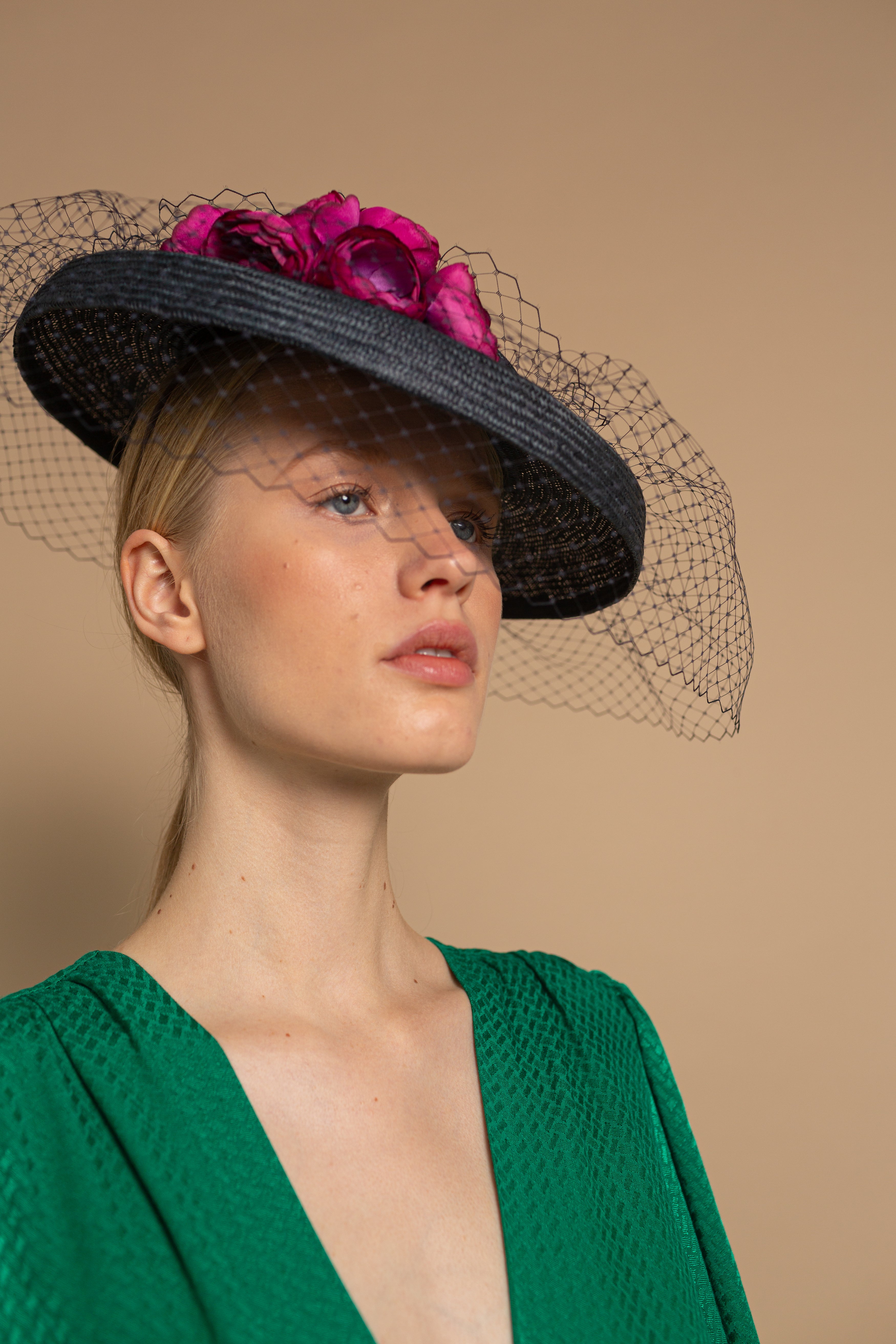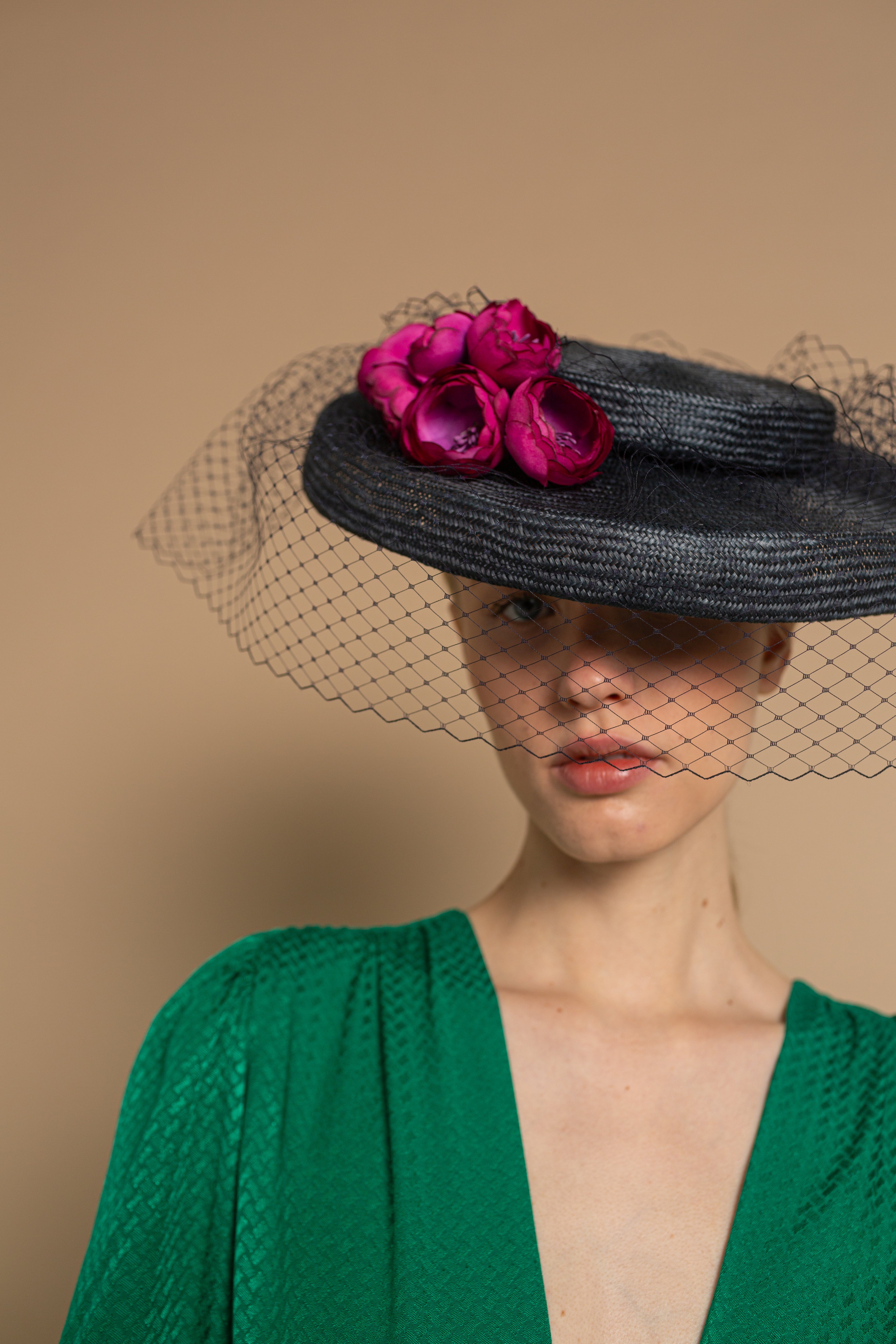 Canotier de copa corta de parasisal azul marino, con velo al tono y y flores buganvilla