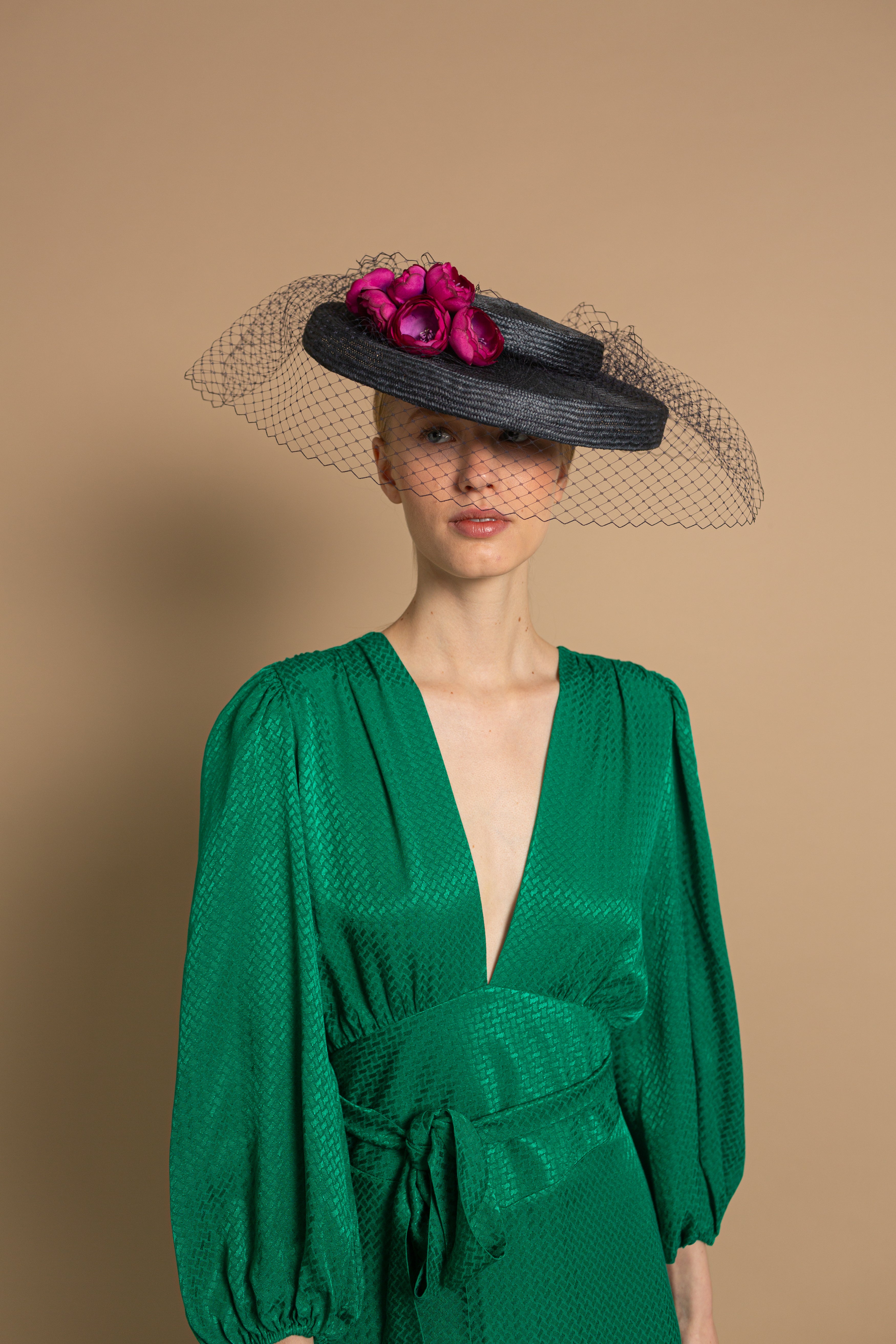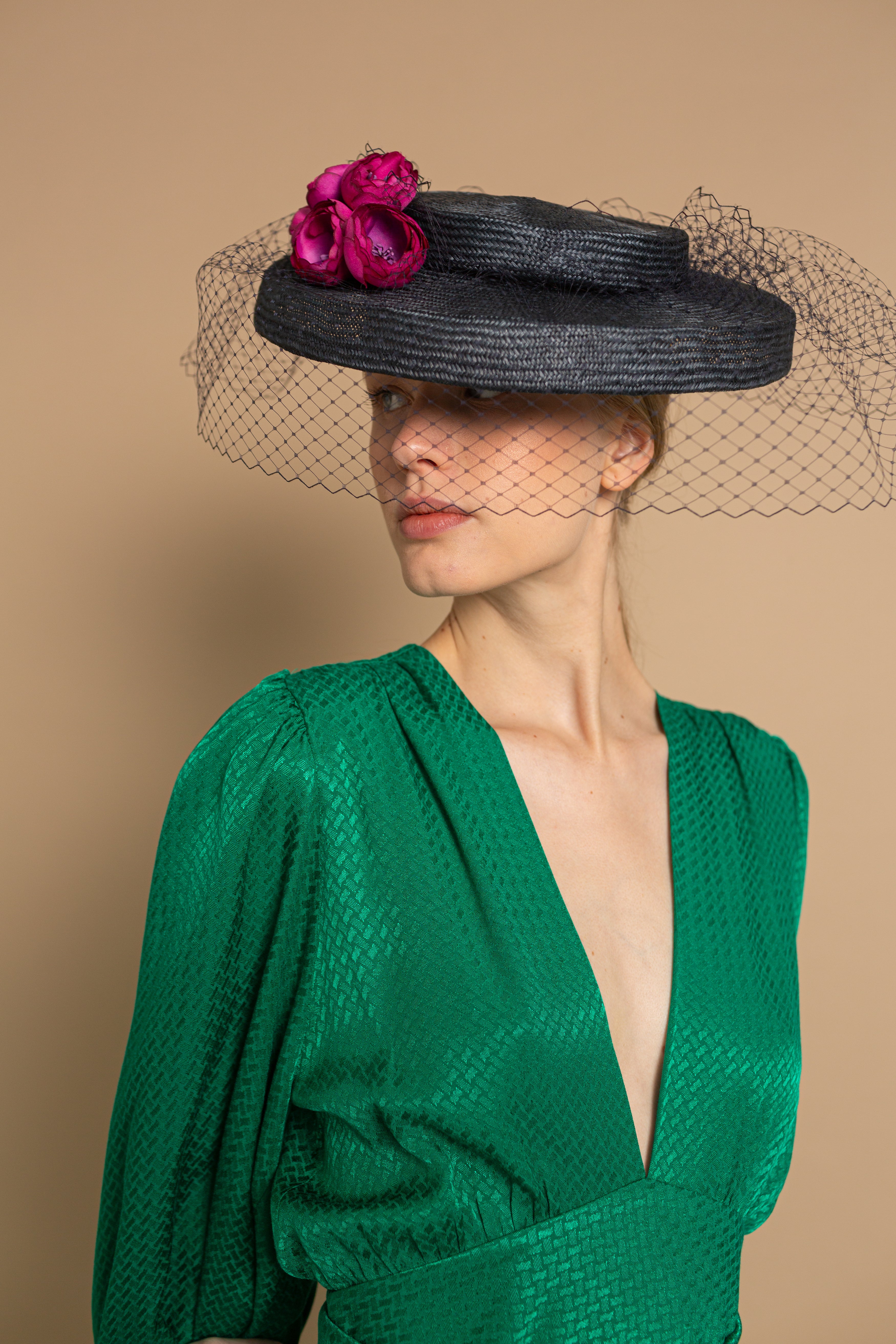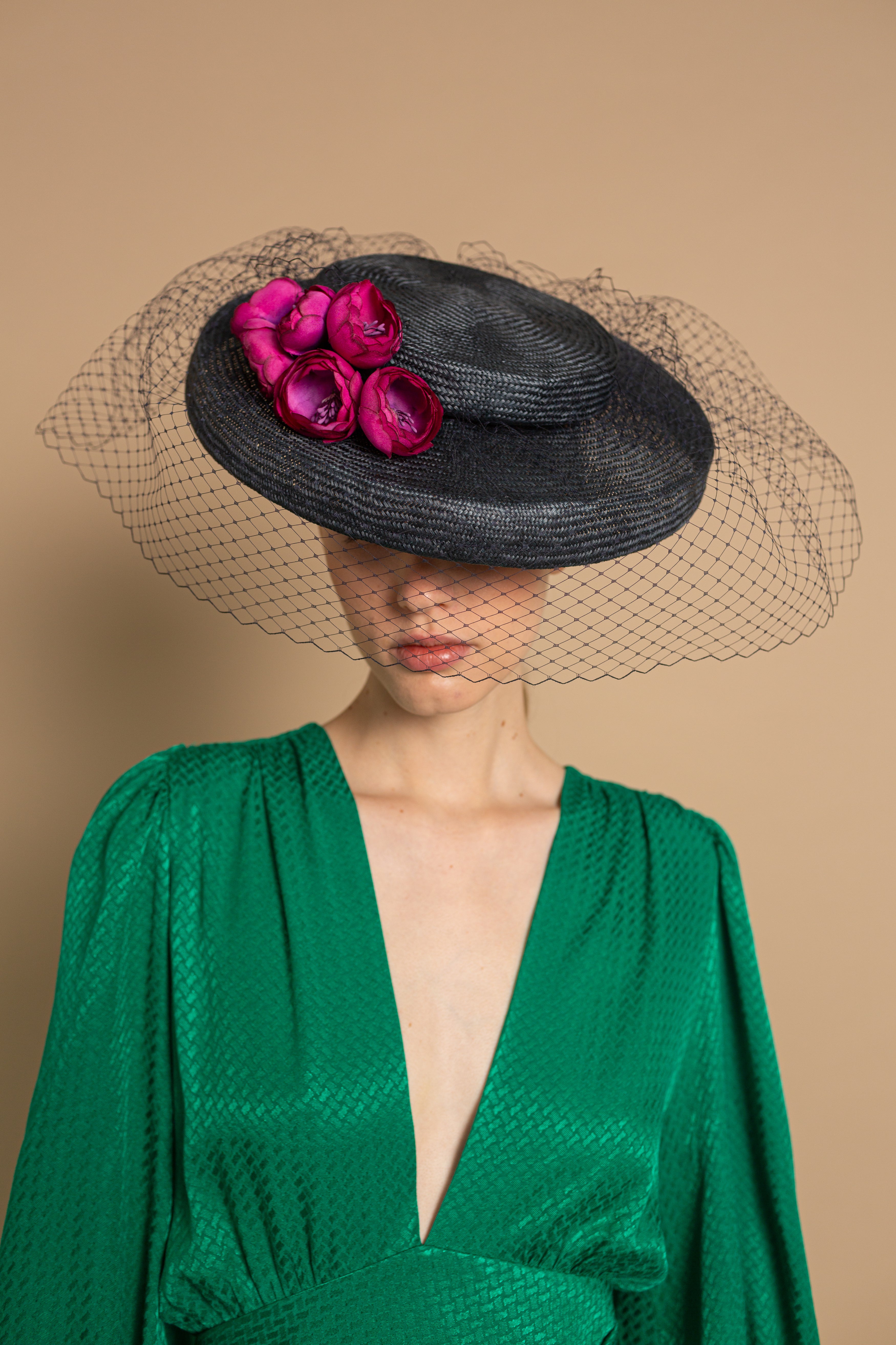 Canotier de copa corta de parasisal azul marino, con velo al tono y y flores buganvilla
