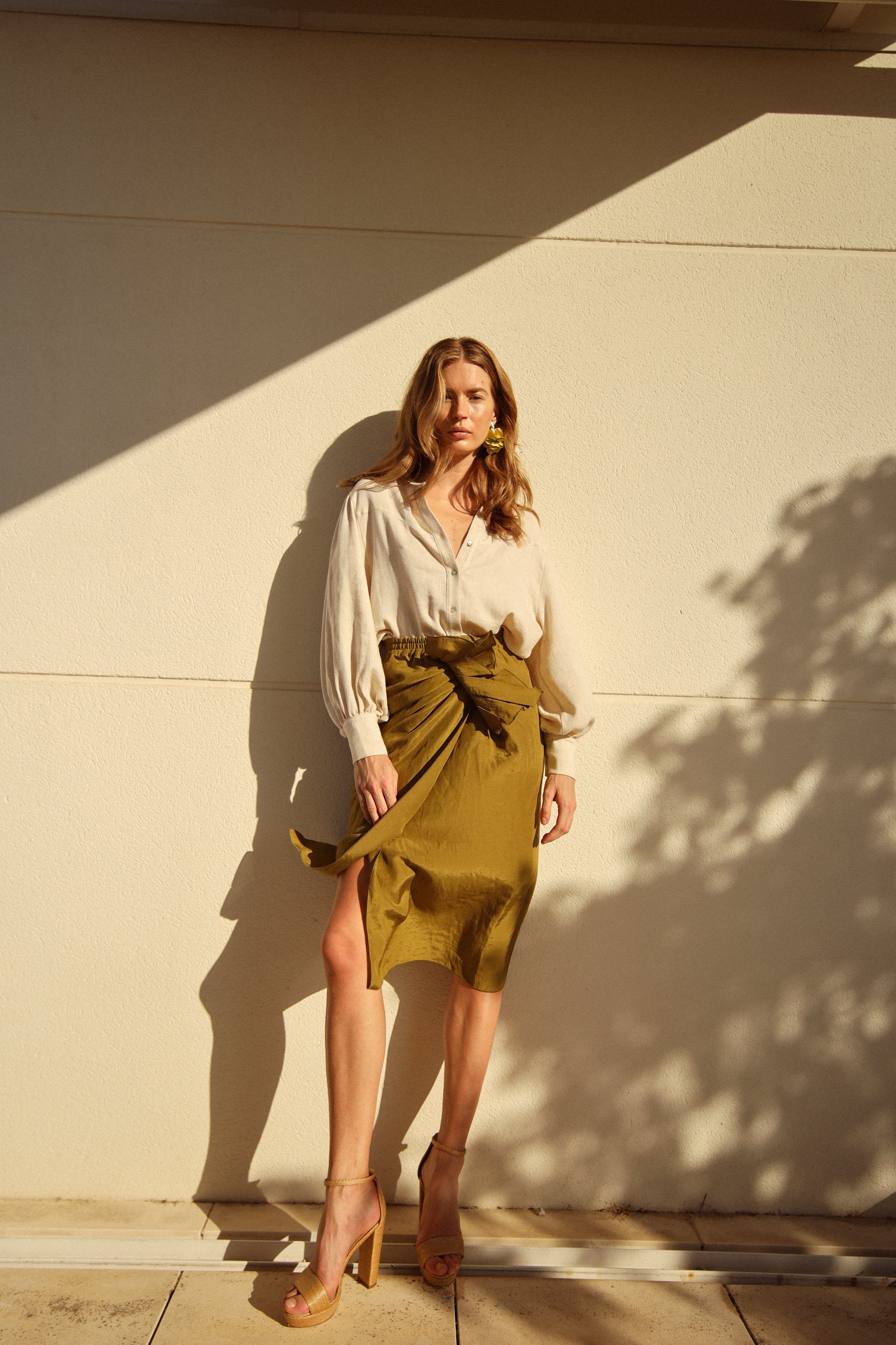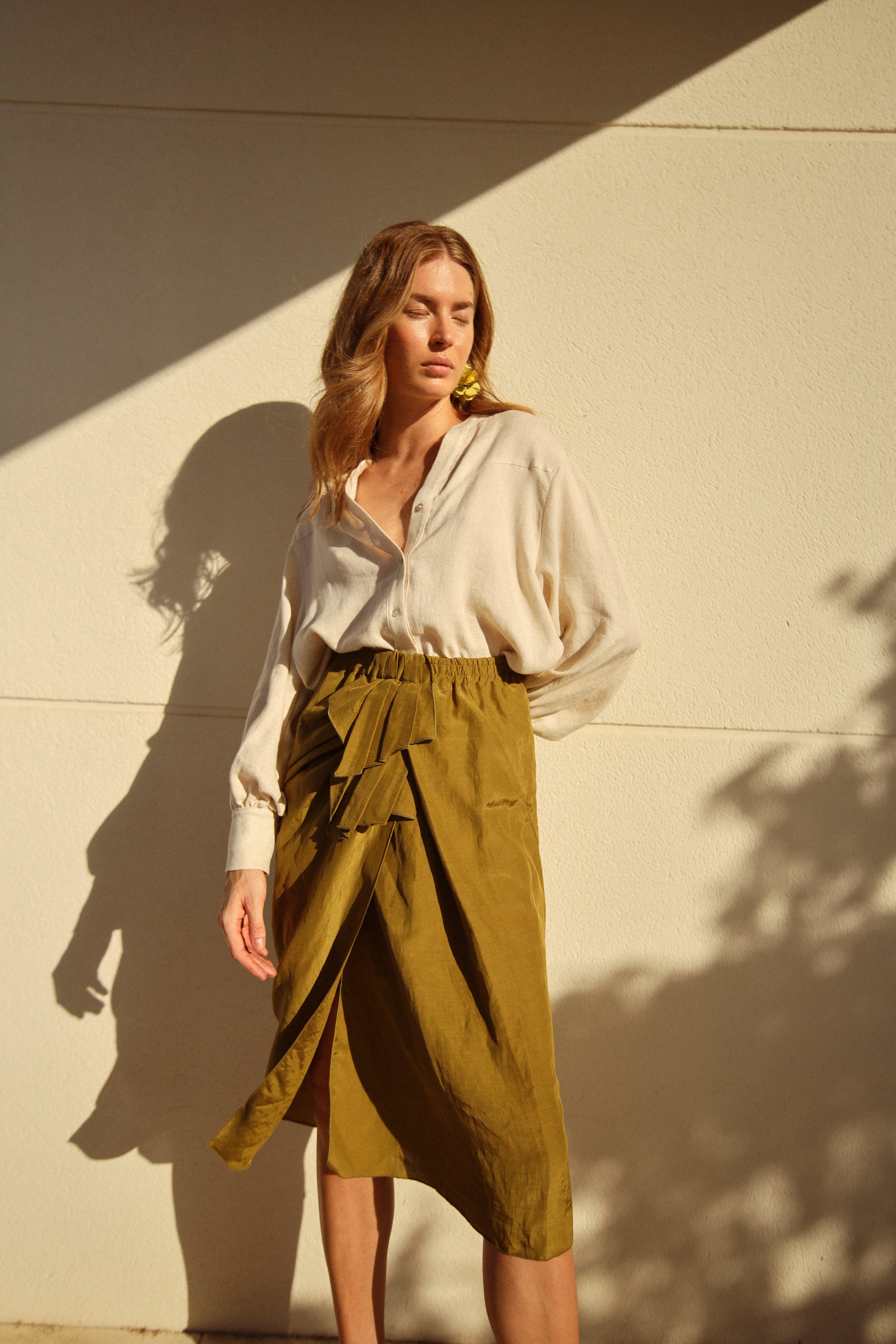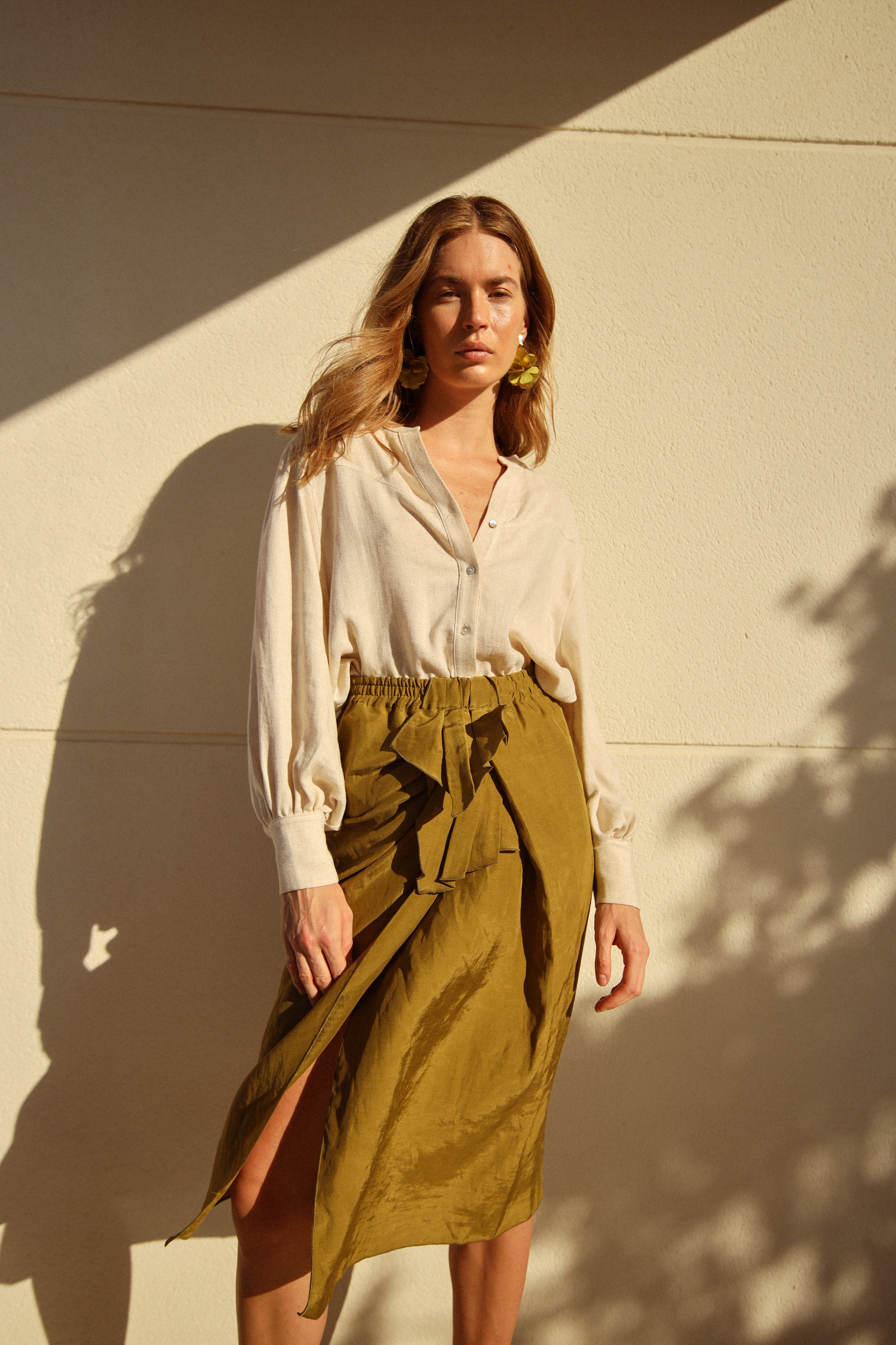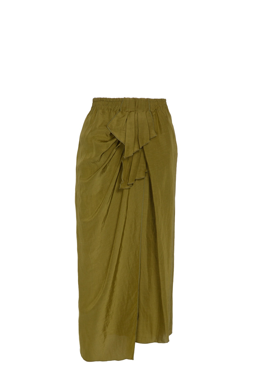 Falda midi estilo pareo con frunce delantero.