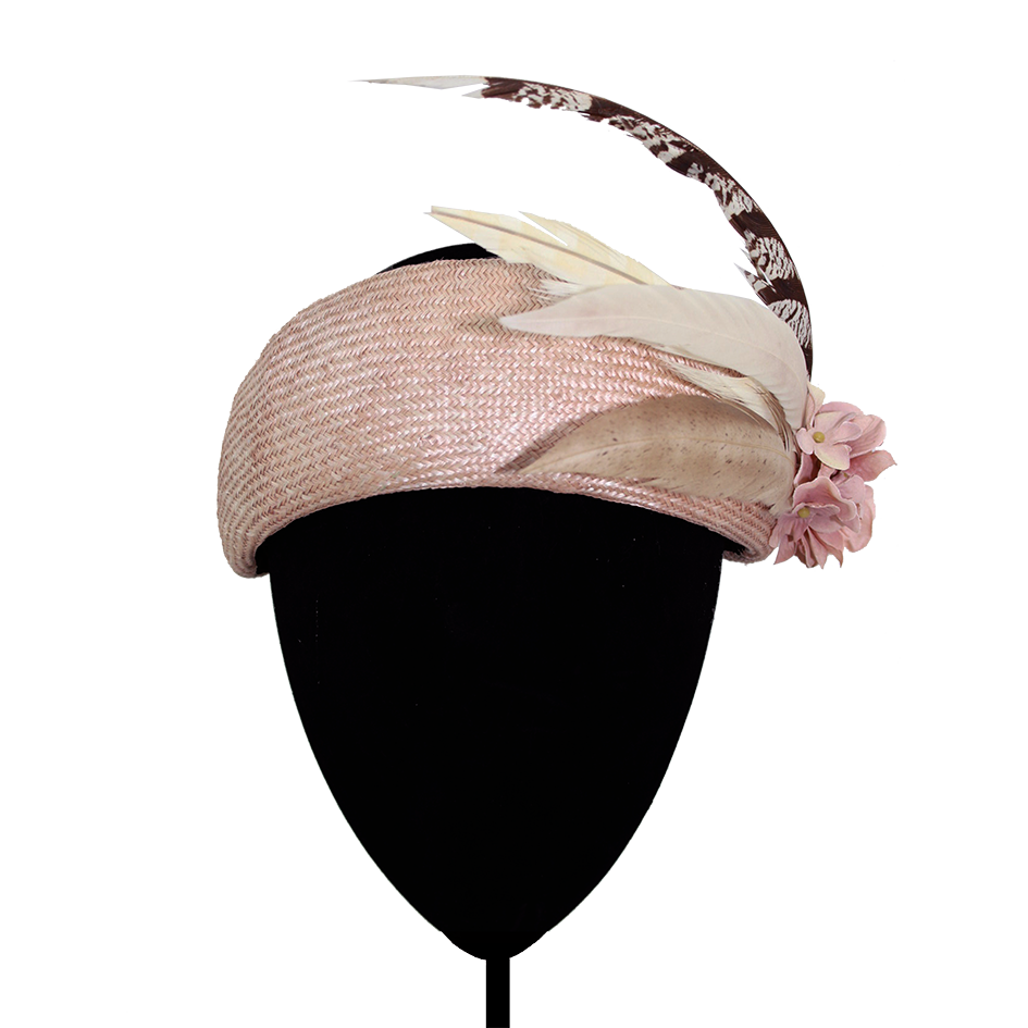 Diadema de parasisal natural con plumas al tono y flores nude laterales