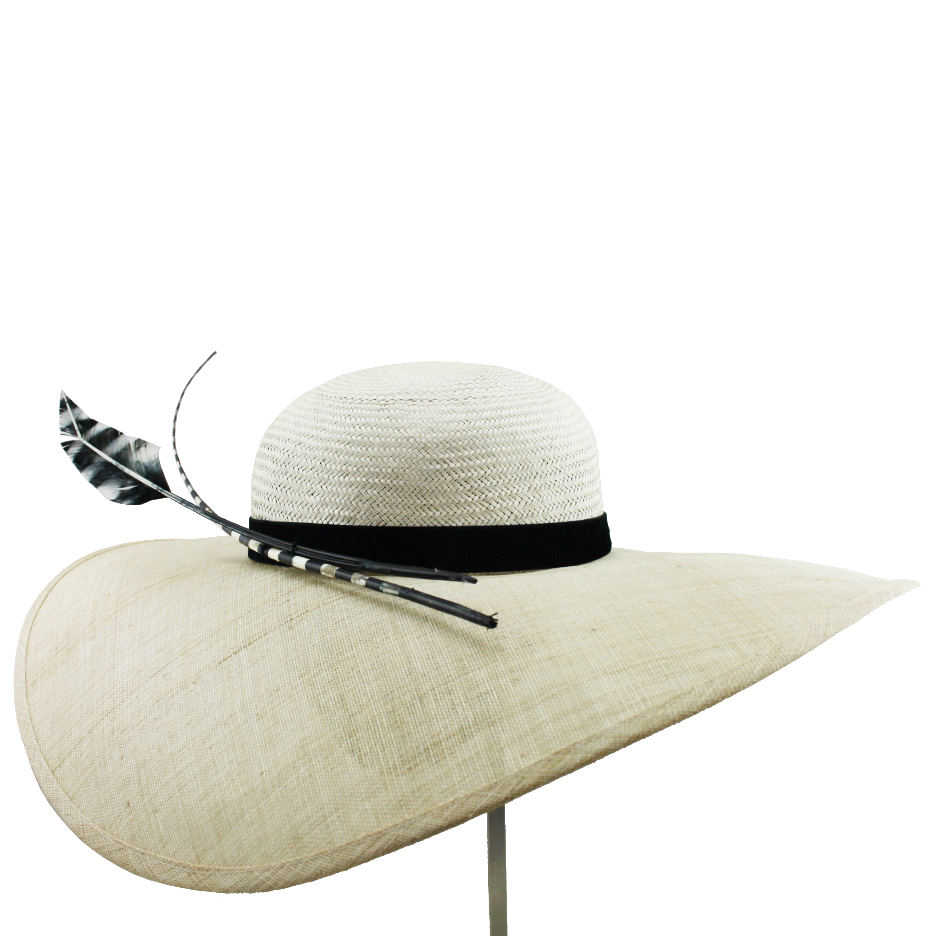 Pamela xl con copa redonda ala de sinamay en color crema con cinta de terciopelo negro, raqui y flecha al tono.