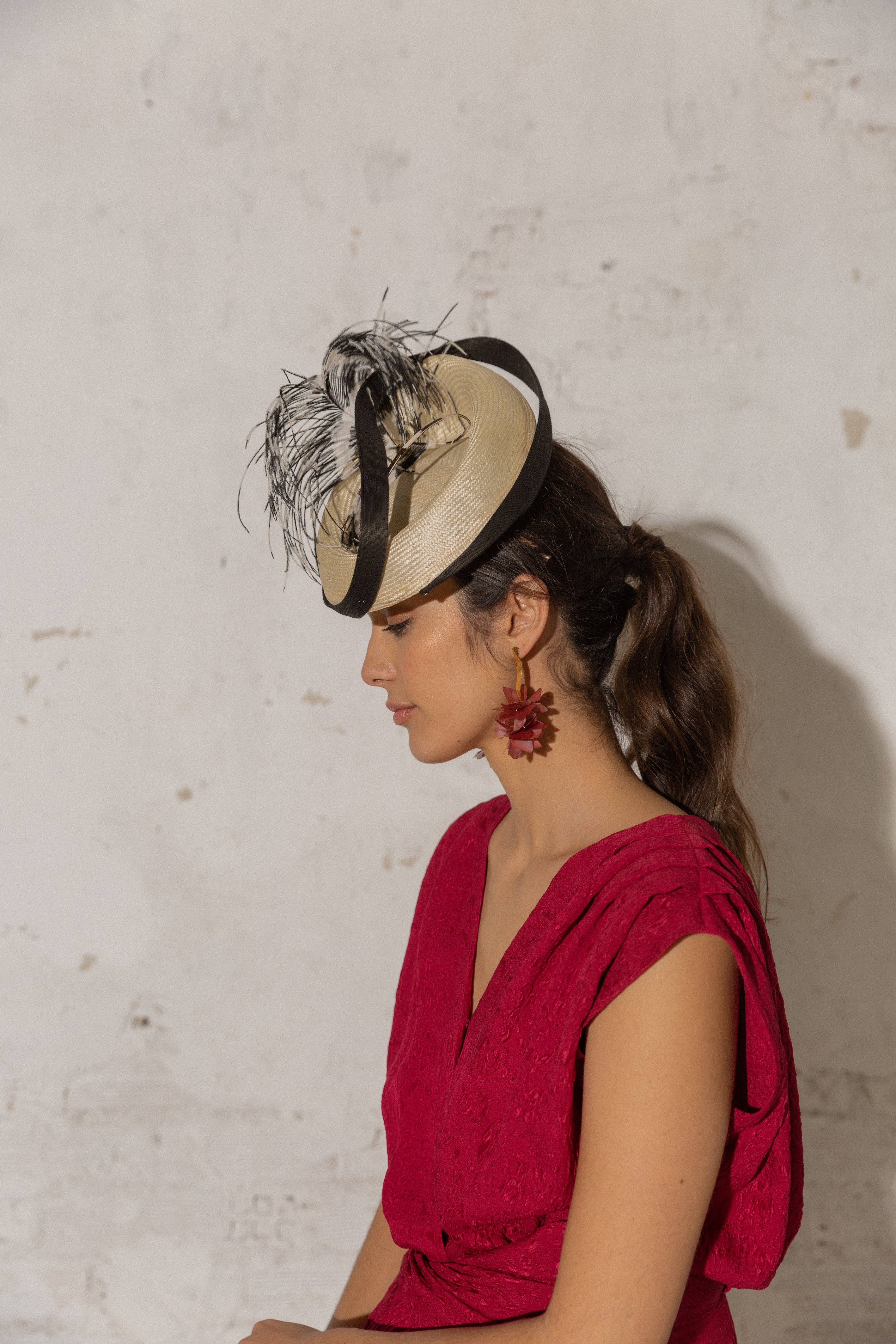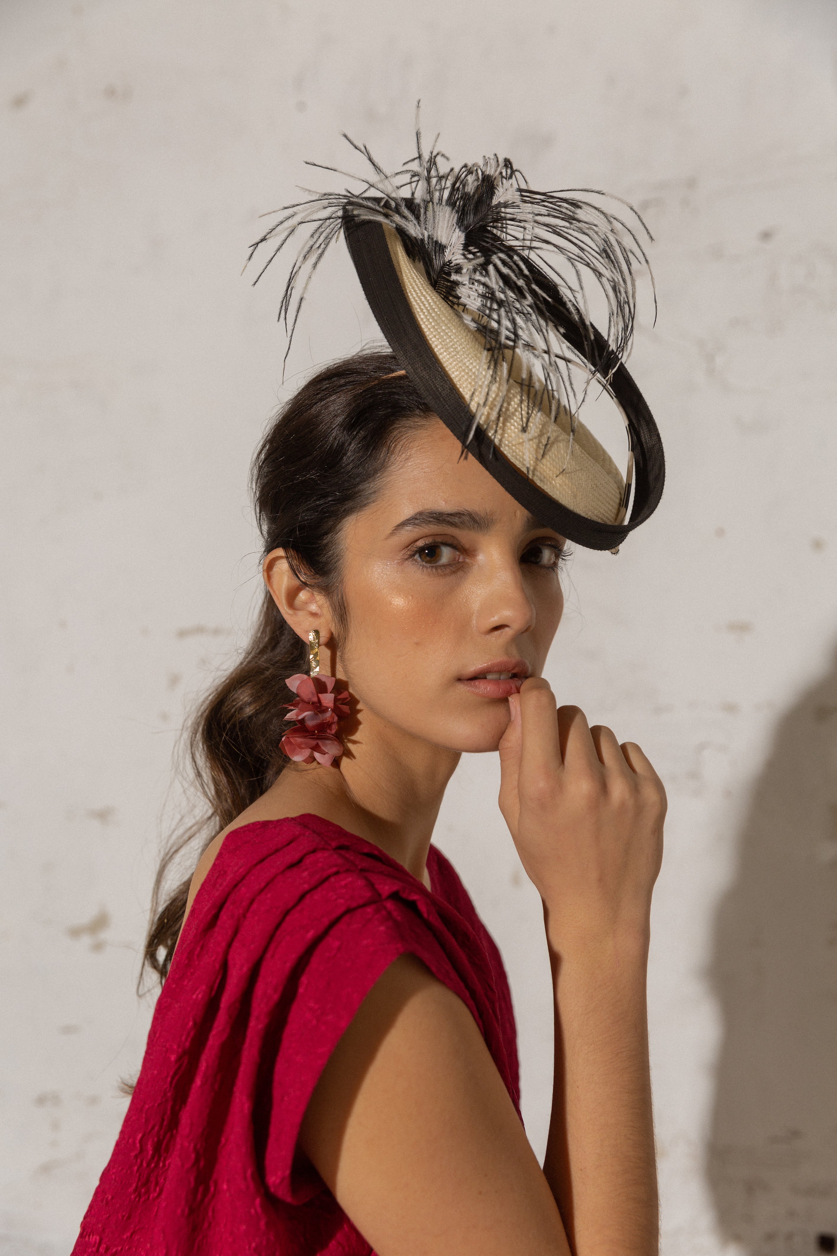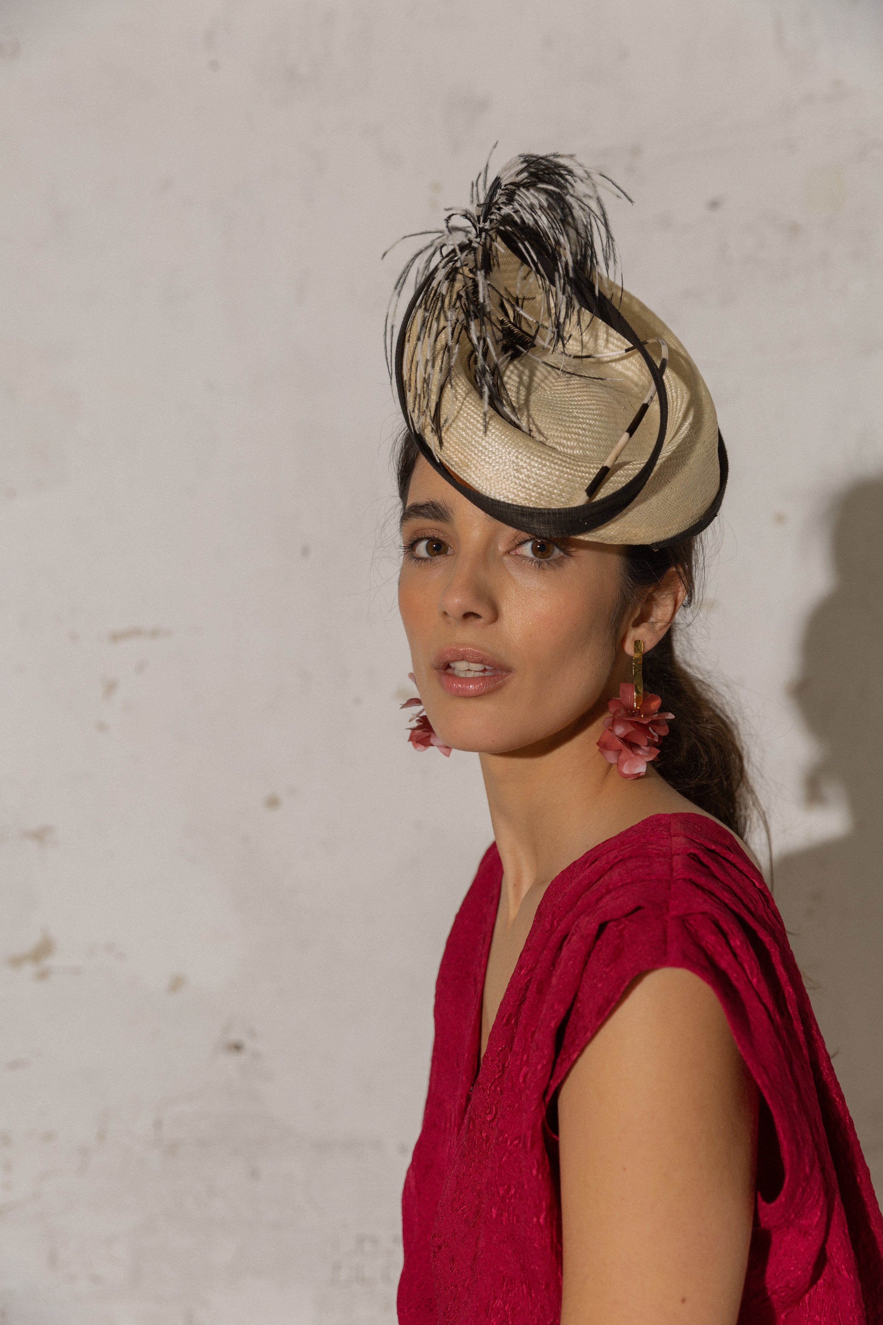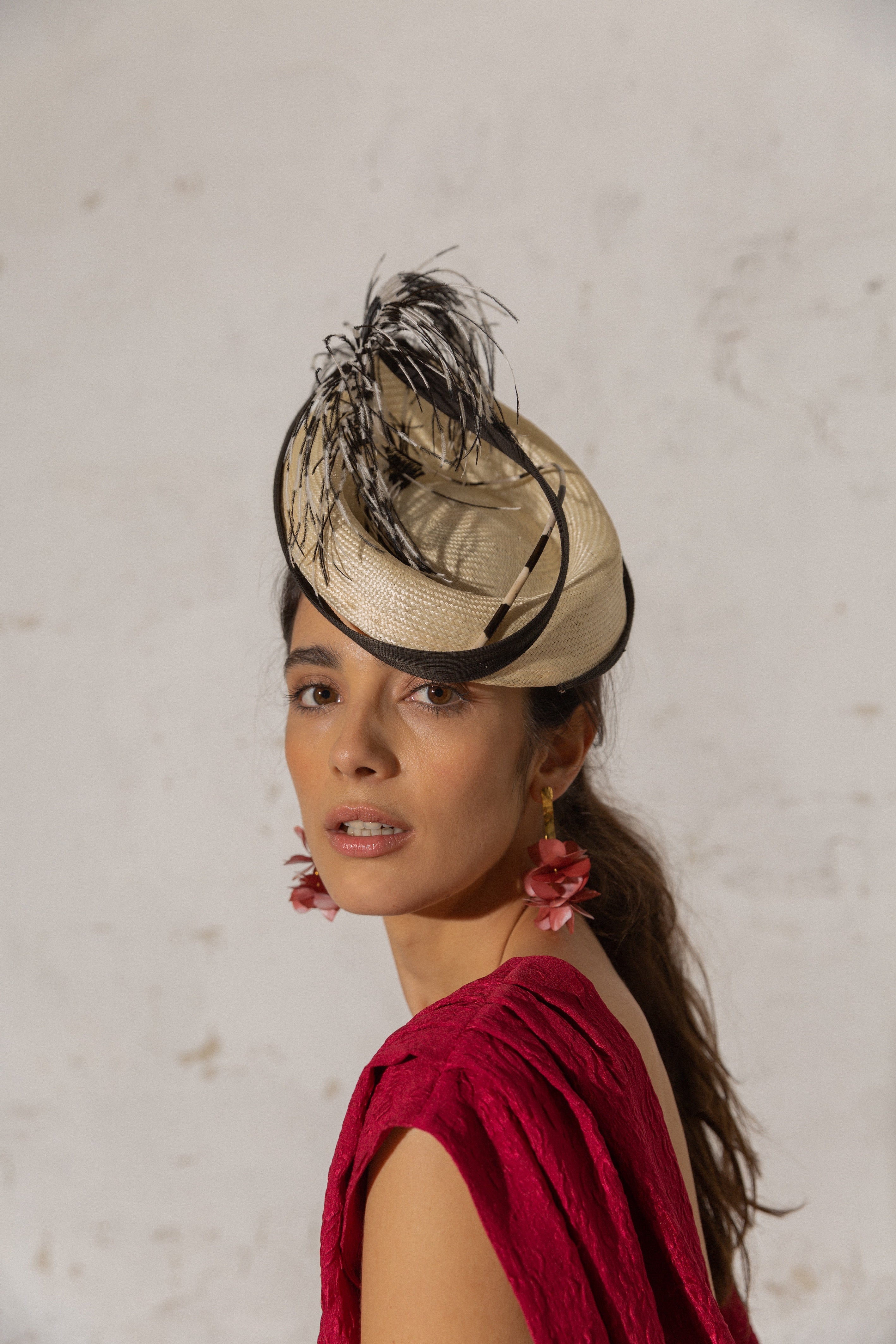 Casquete alargado de parasisal crudo con modelado de rafia negra y pluma B/N