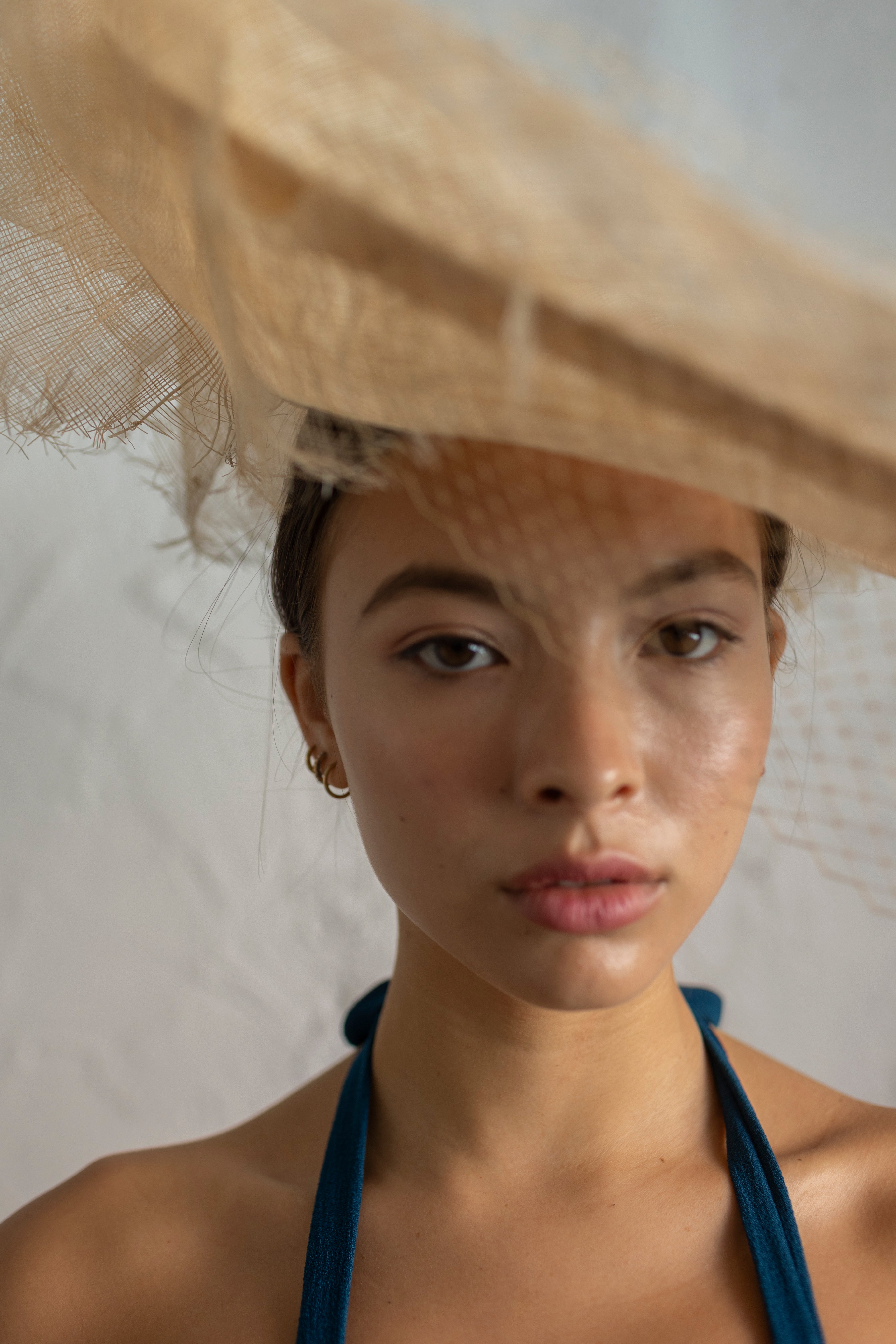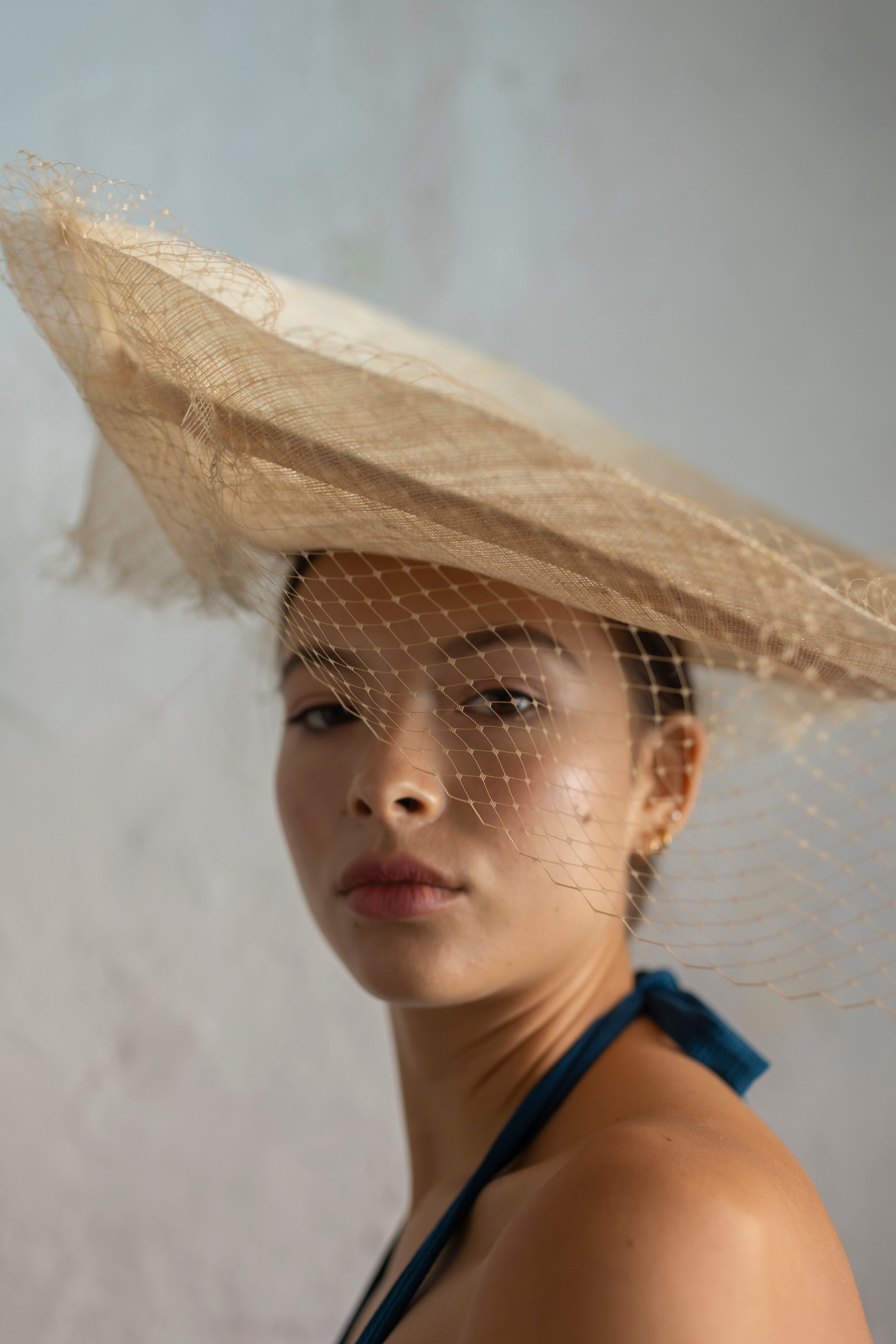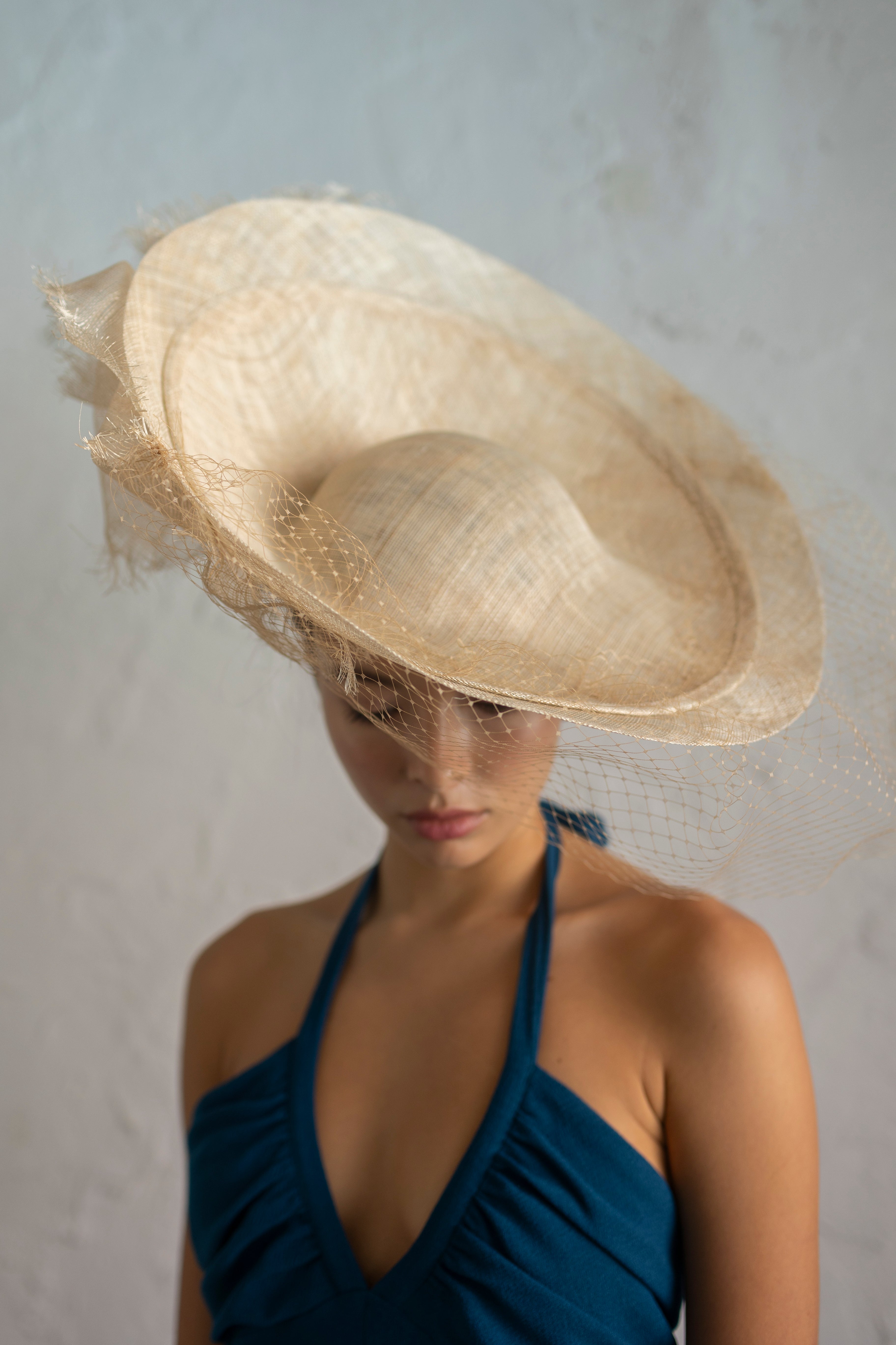 Dulcinea de sinamay color natural, con pespunte al tono y velo al tono.