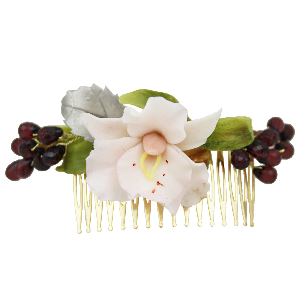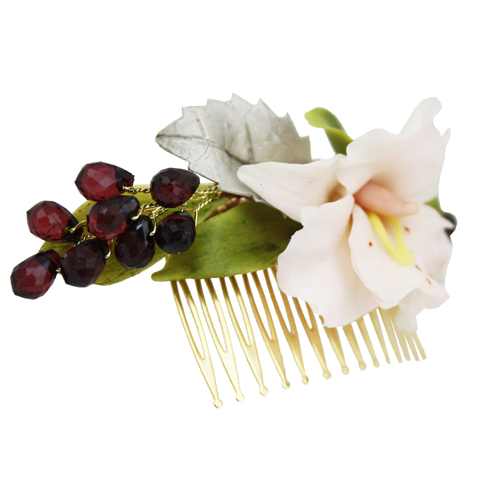 Mini peineta con flor de porcelana fria, hoja plateada y cristales berenjena.
