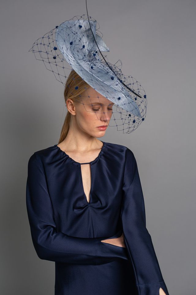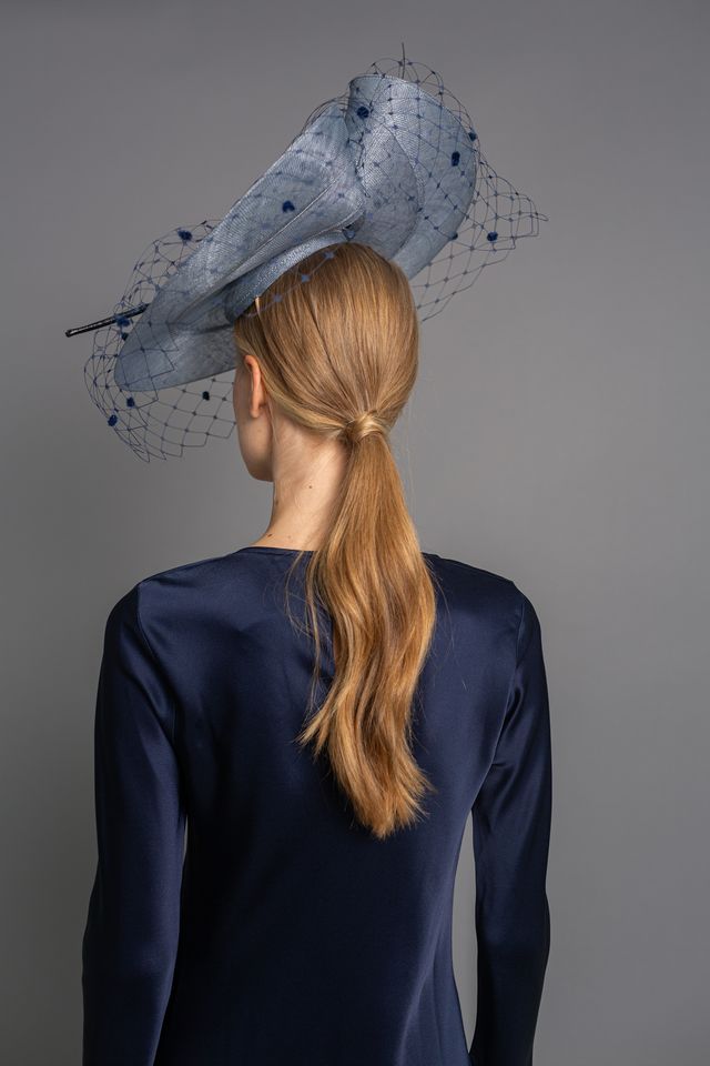 Dulcinea de bies de sinamay azul grisáceo con raqui y velo ancho azul marino.
