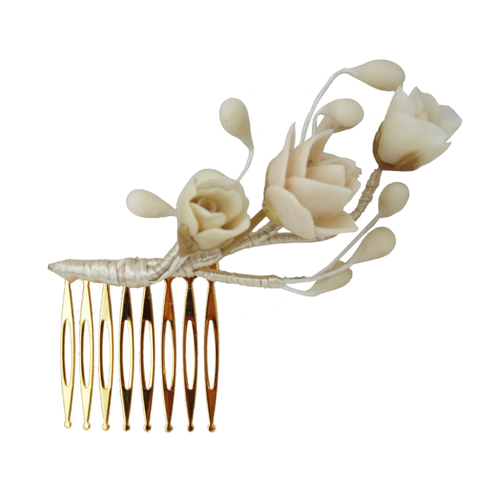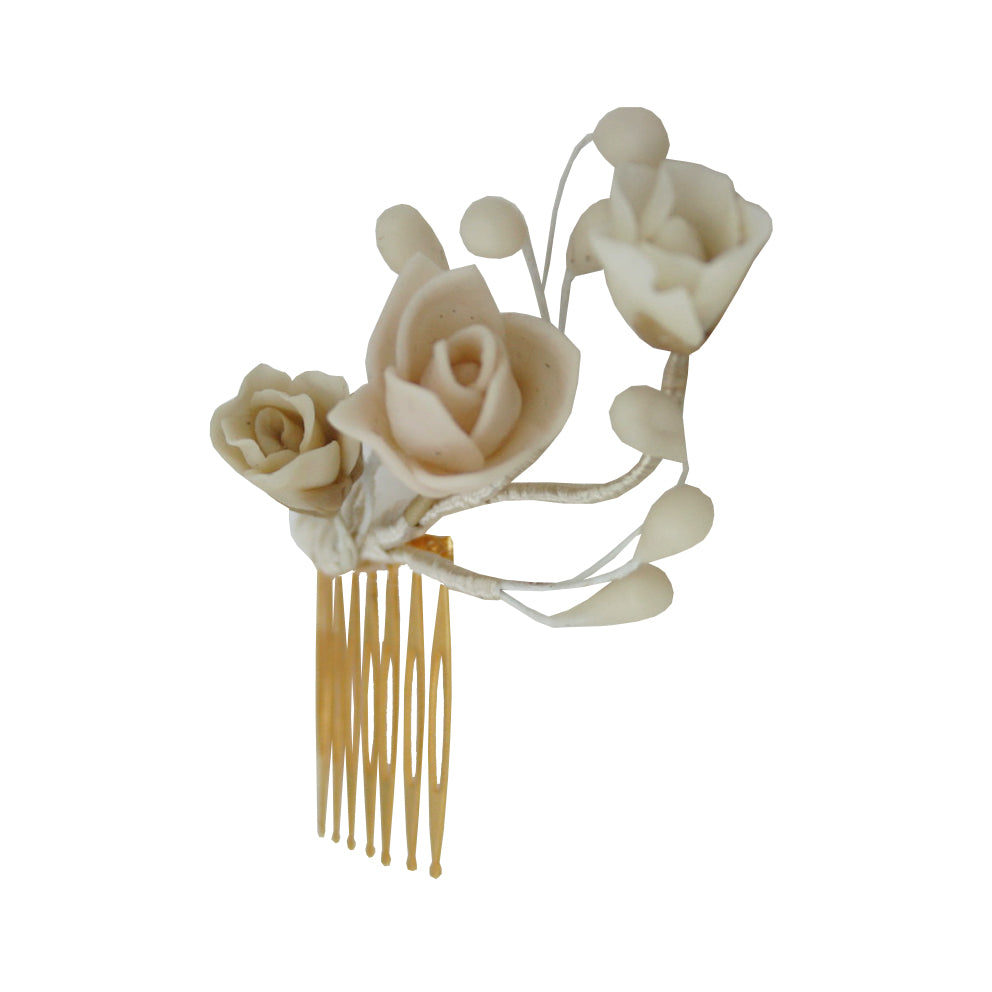 Mini peineta de rosas blancas de porcelana fria y pistilos.