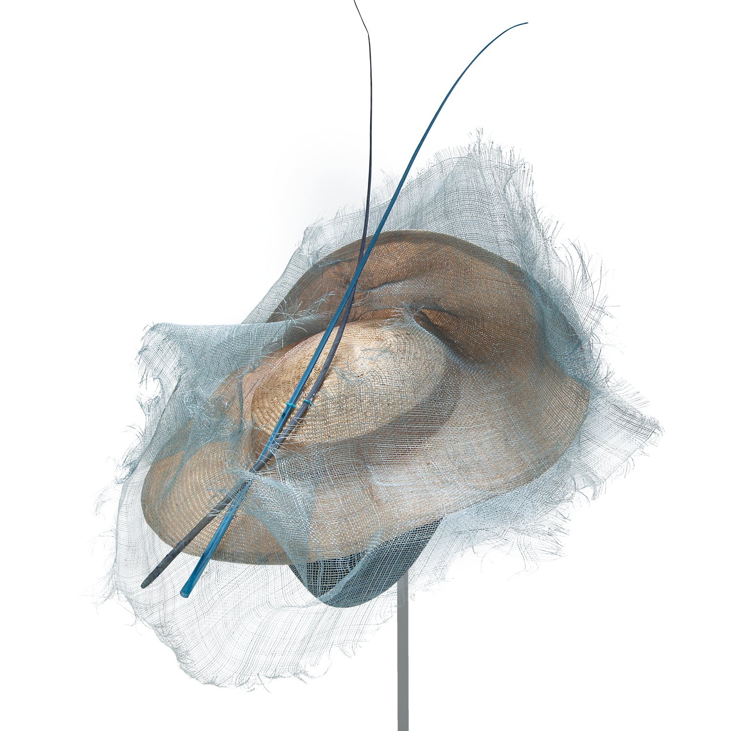 Dulcinea de parasisal tostado de ala levantado con capas de sinamay deshilachado en azul grisaceo y dos raquis al tono