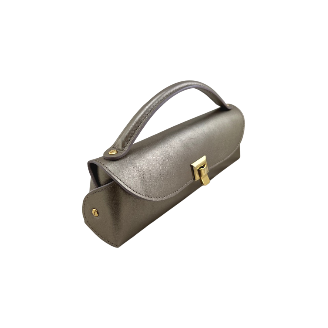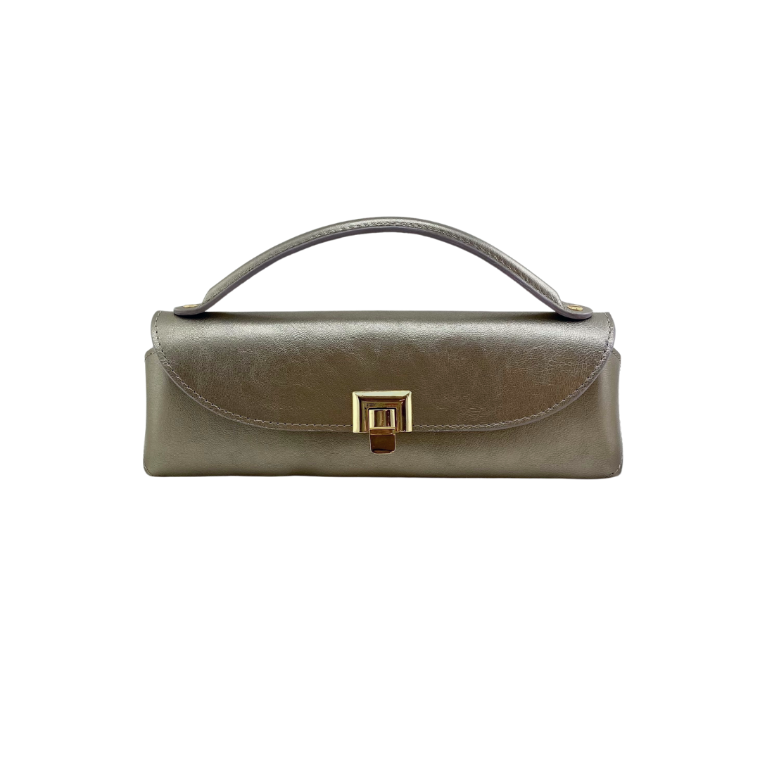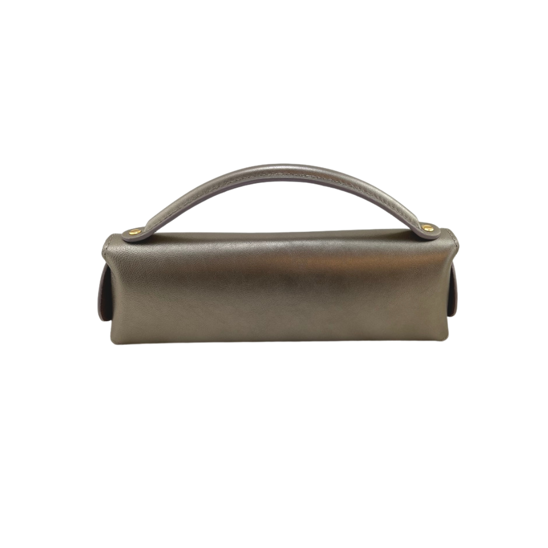 Bolso plegado alargado en piel metalizada con asa al tono y cierre metálico dorado.