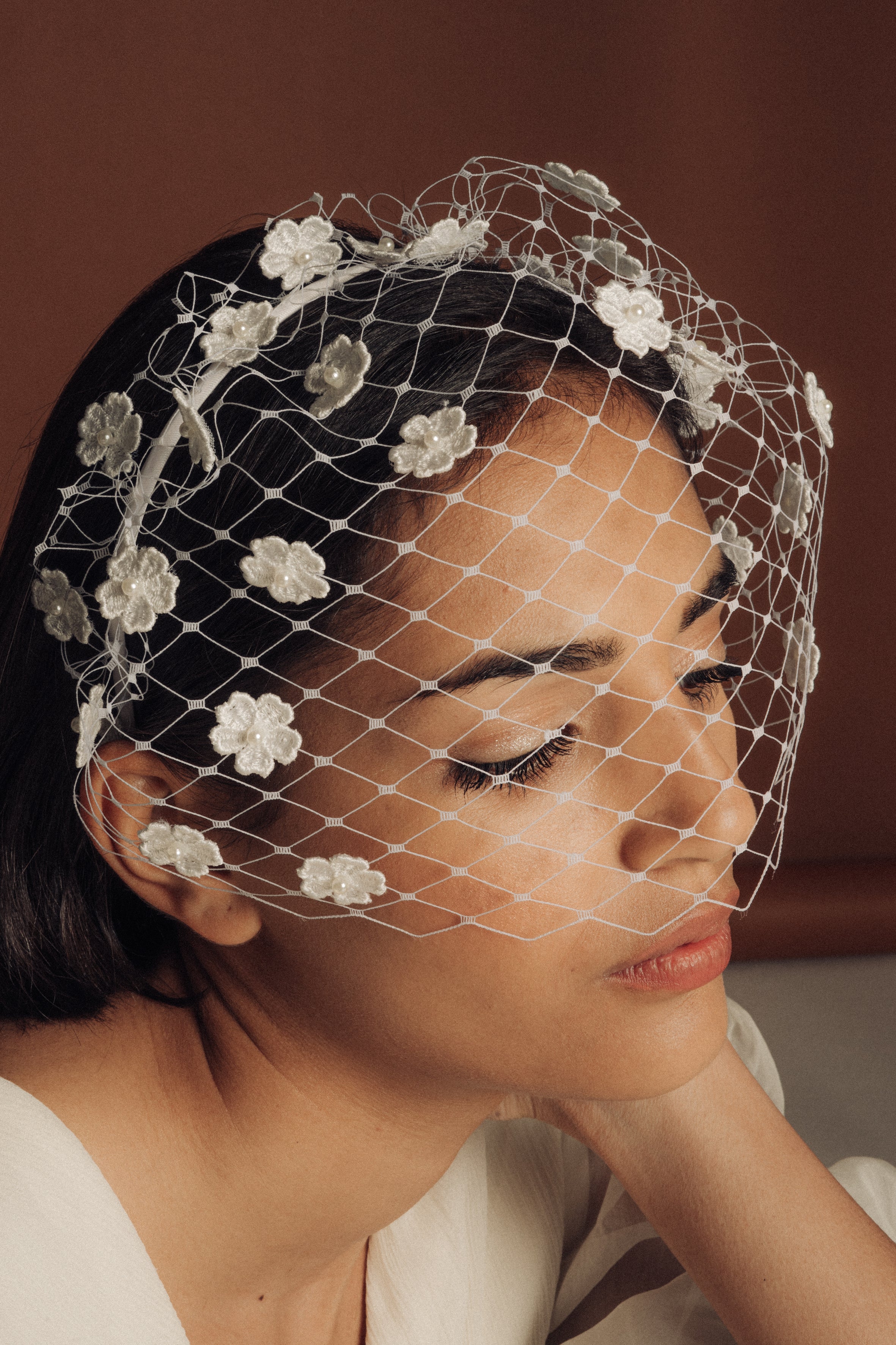 Diadema fina con velo ancho blanco y flores de guipur con centro de perlas.