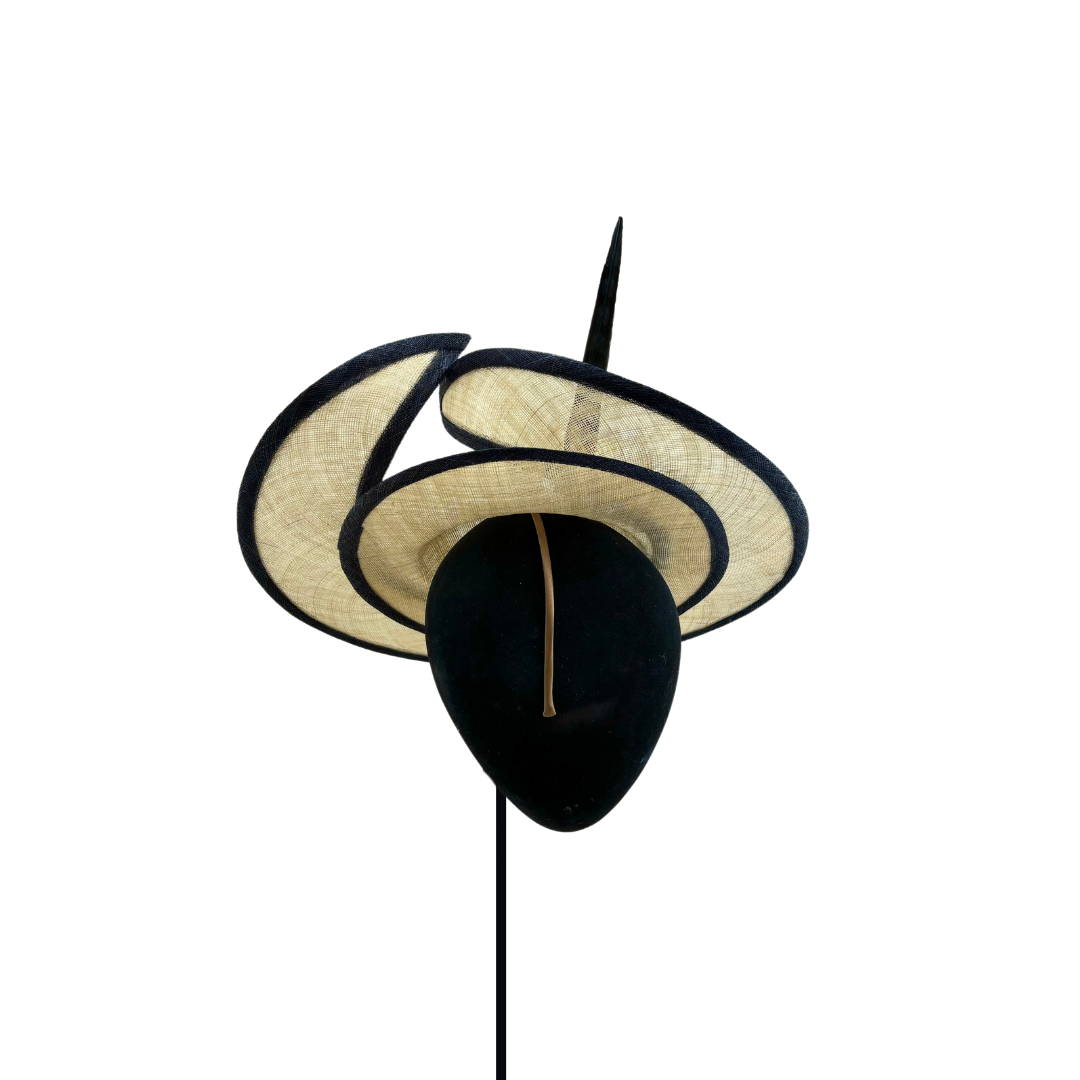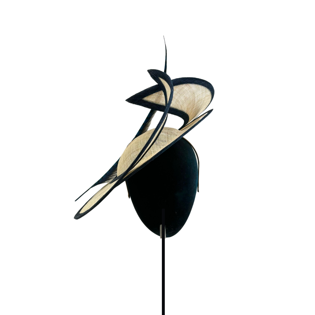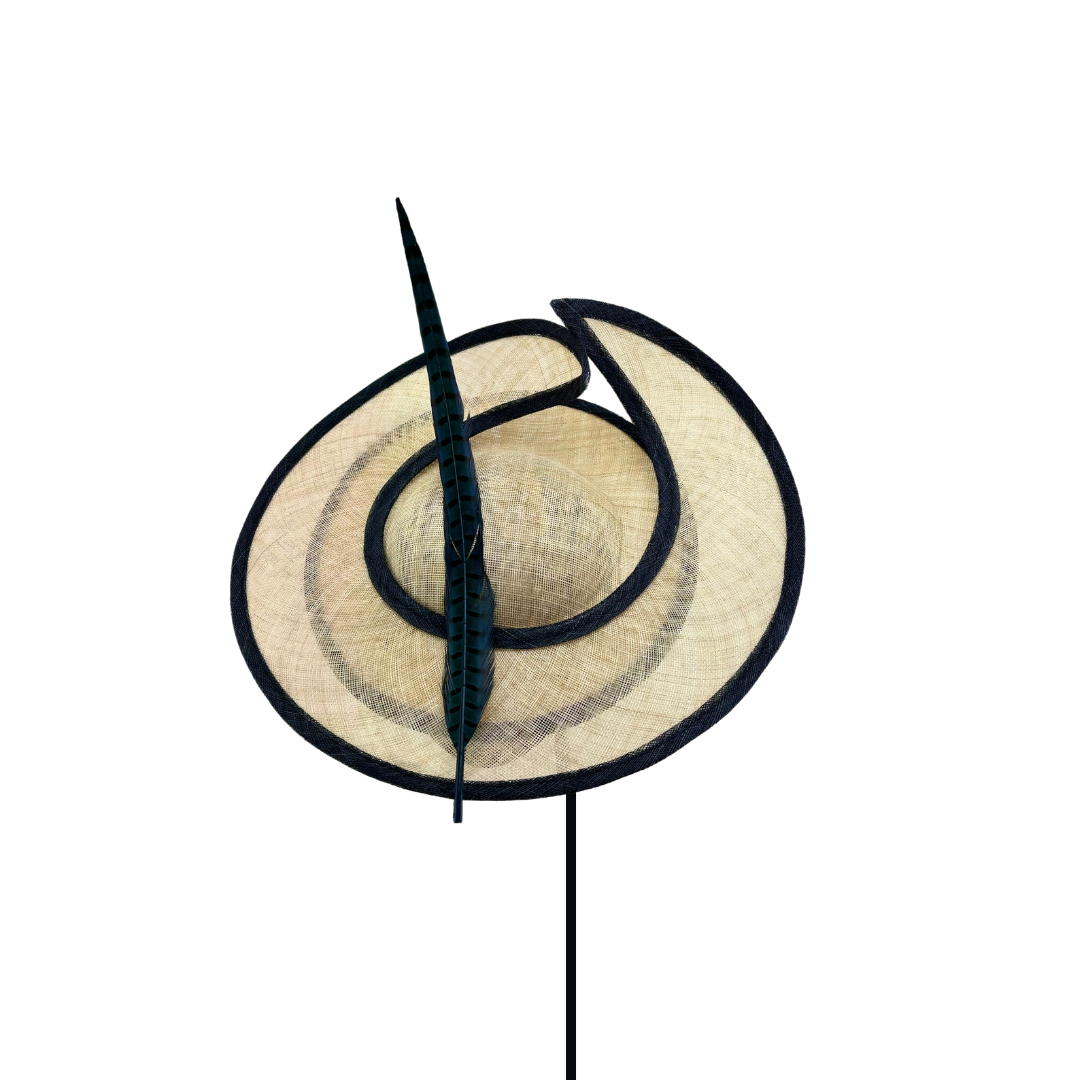 Plato de sinamay crudo con ala levantada, bies azul marino y pluma de faisán al tono.