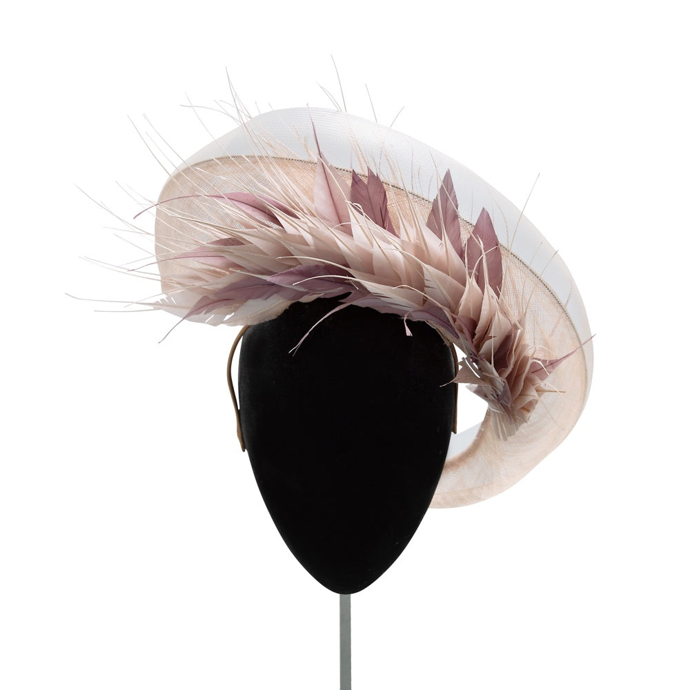 Estructura ala de sinamay rosa nude con bies de crin y plumero japo nude y malva