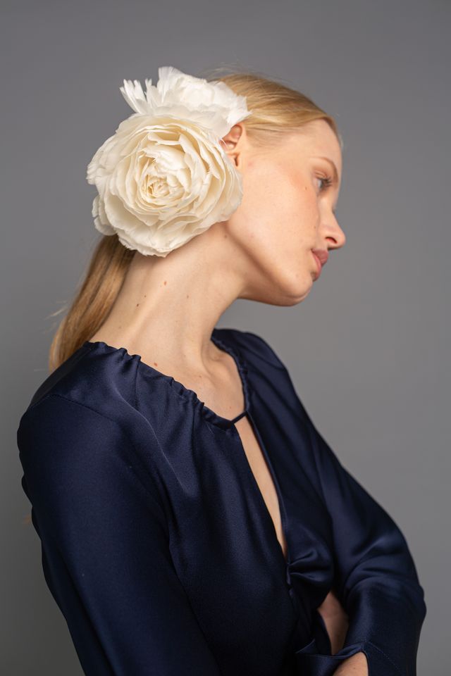 Colocación: flor con alambre para sujetar con horquillas al pelo