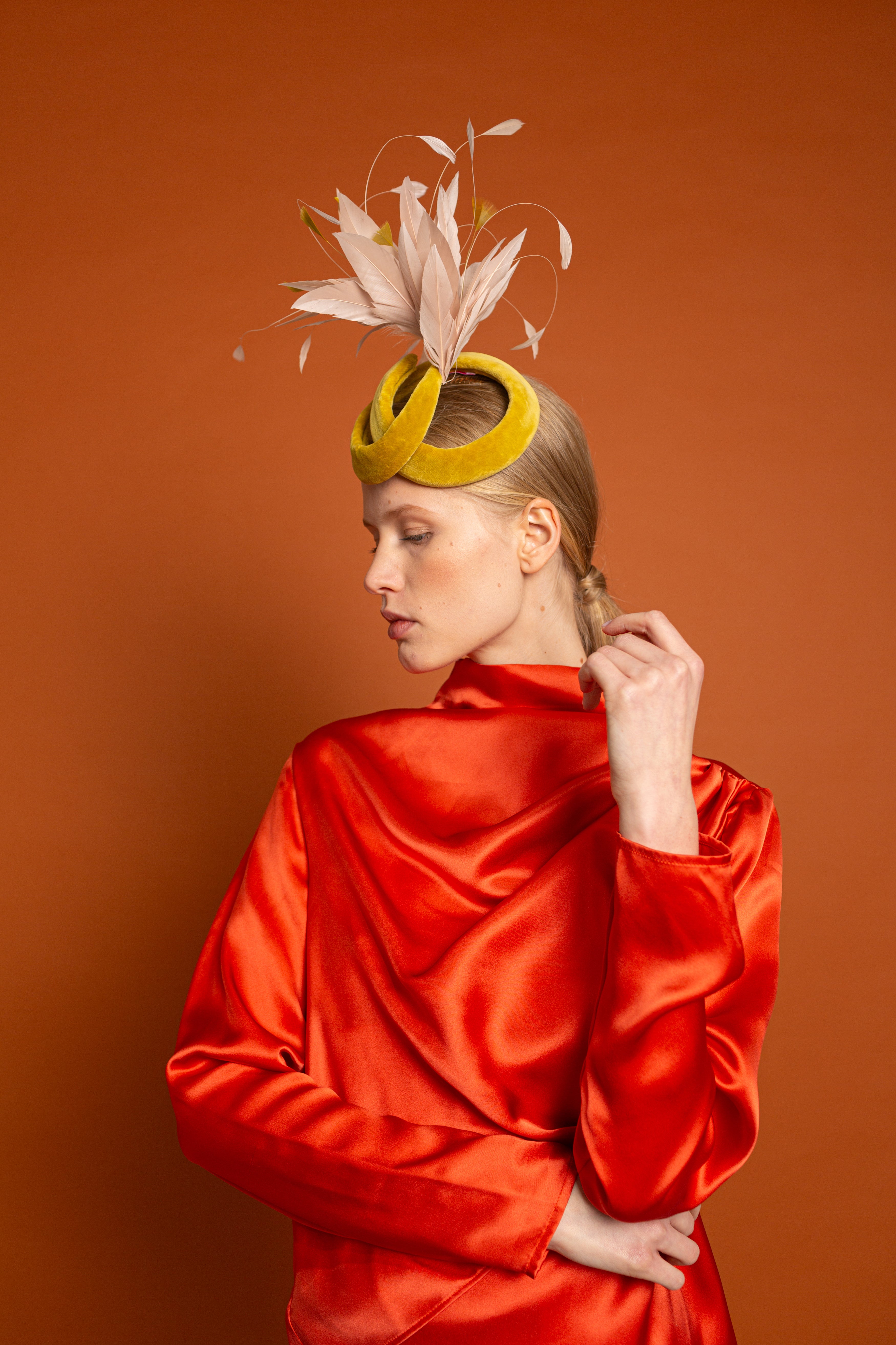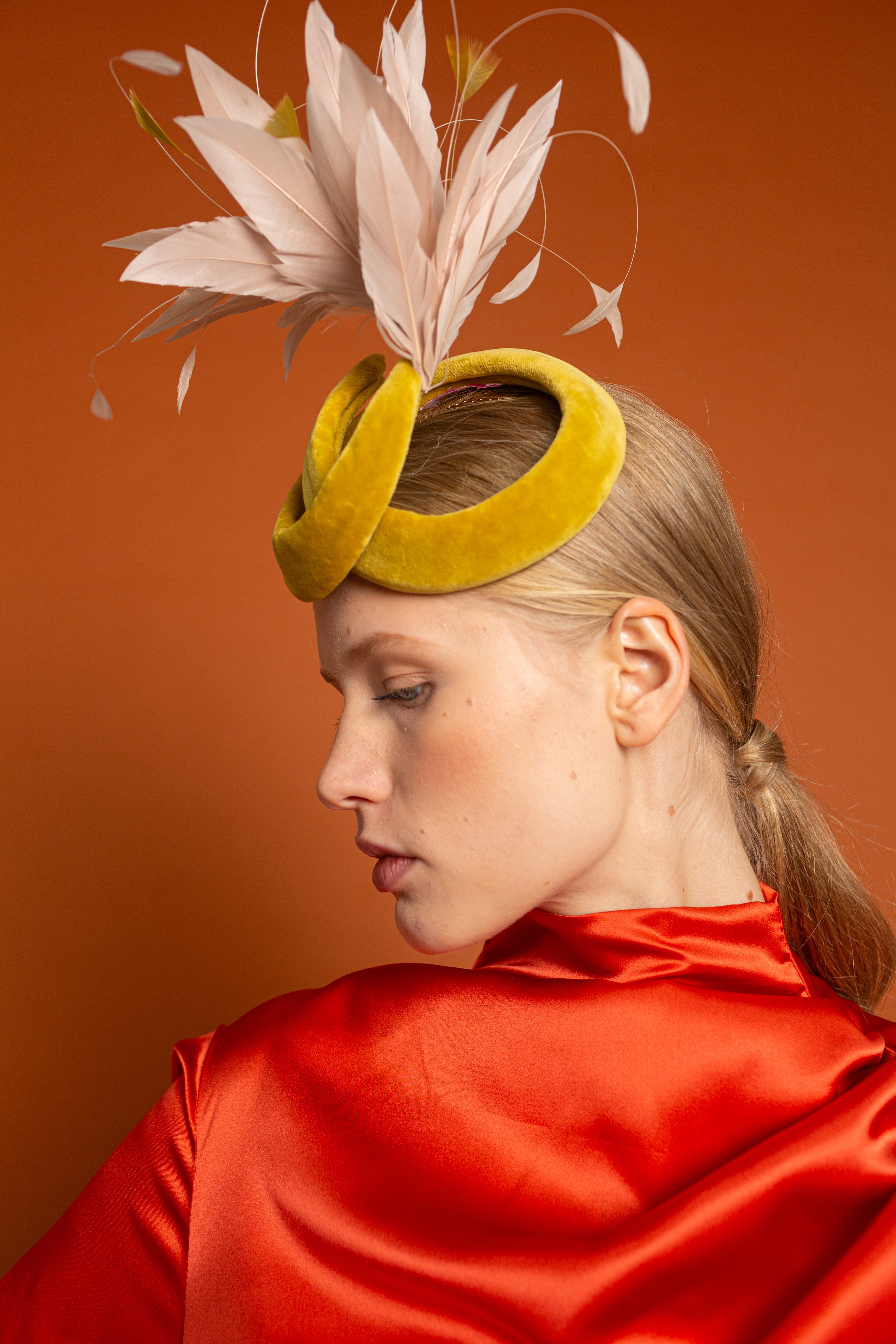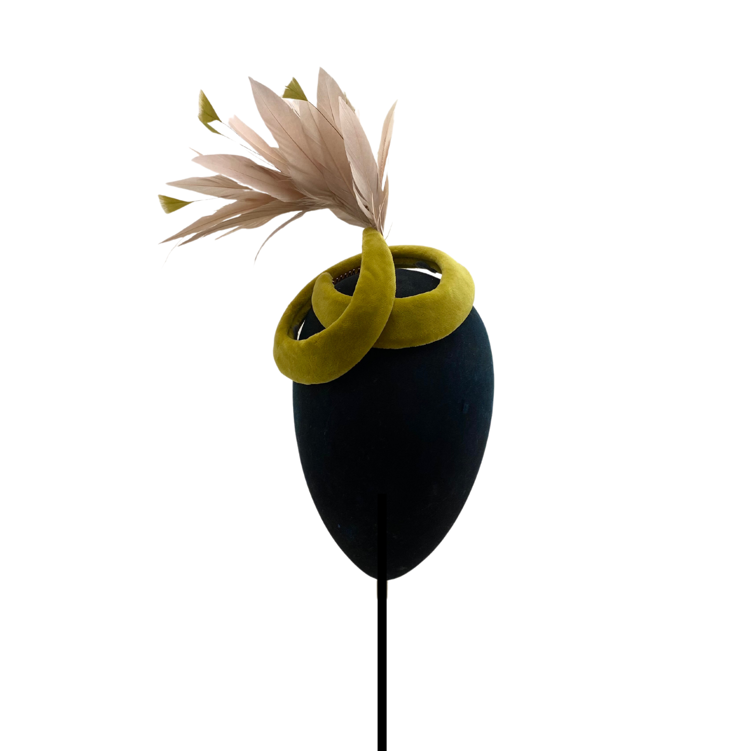 Estructura de listón ondulada forrado en terciopelo verde lima con plumero nude y antenitas en verde lima