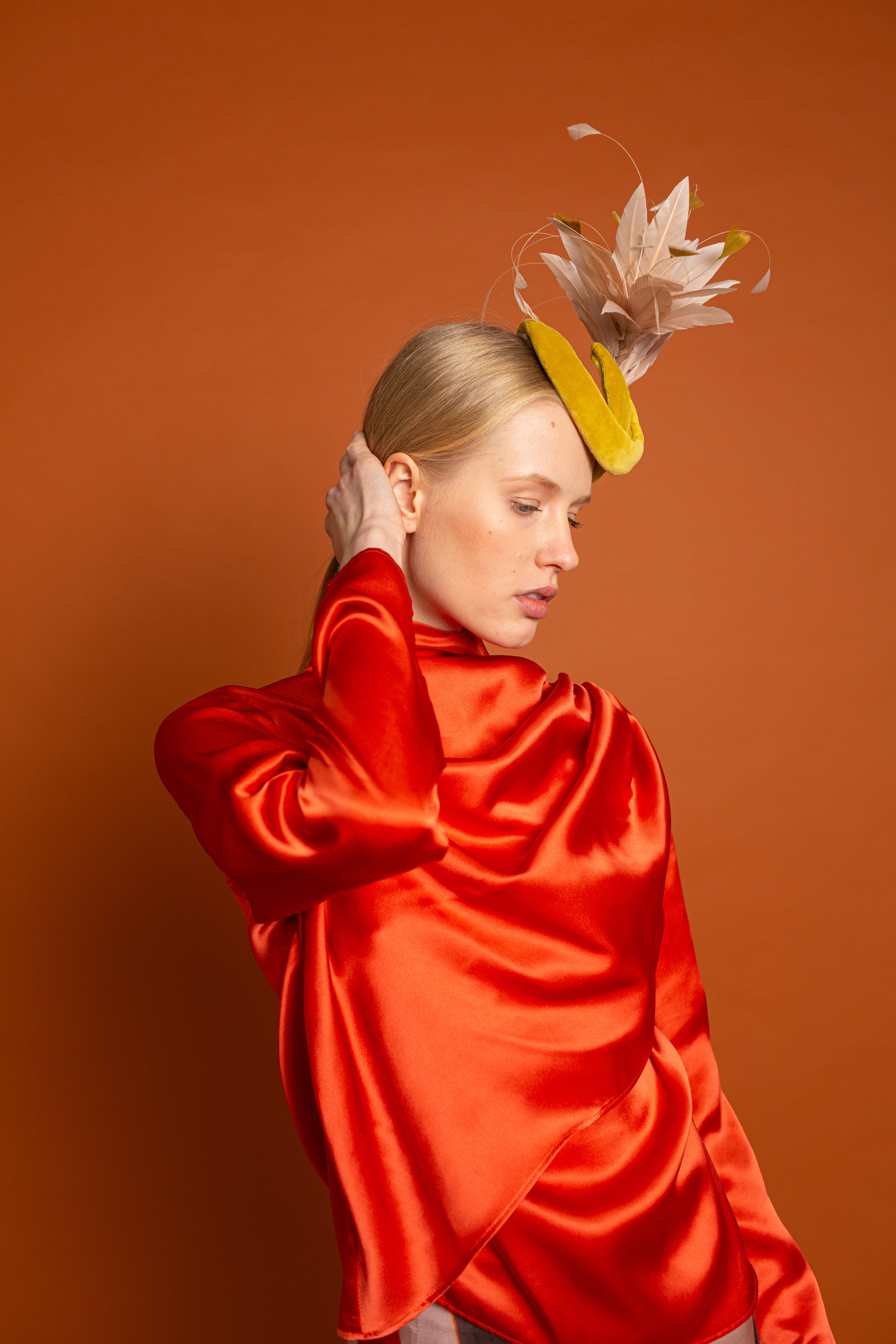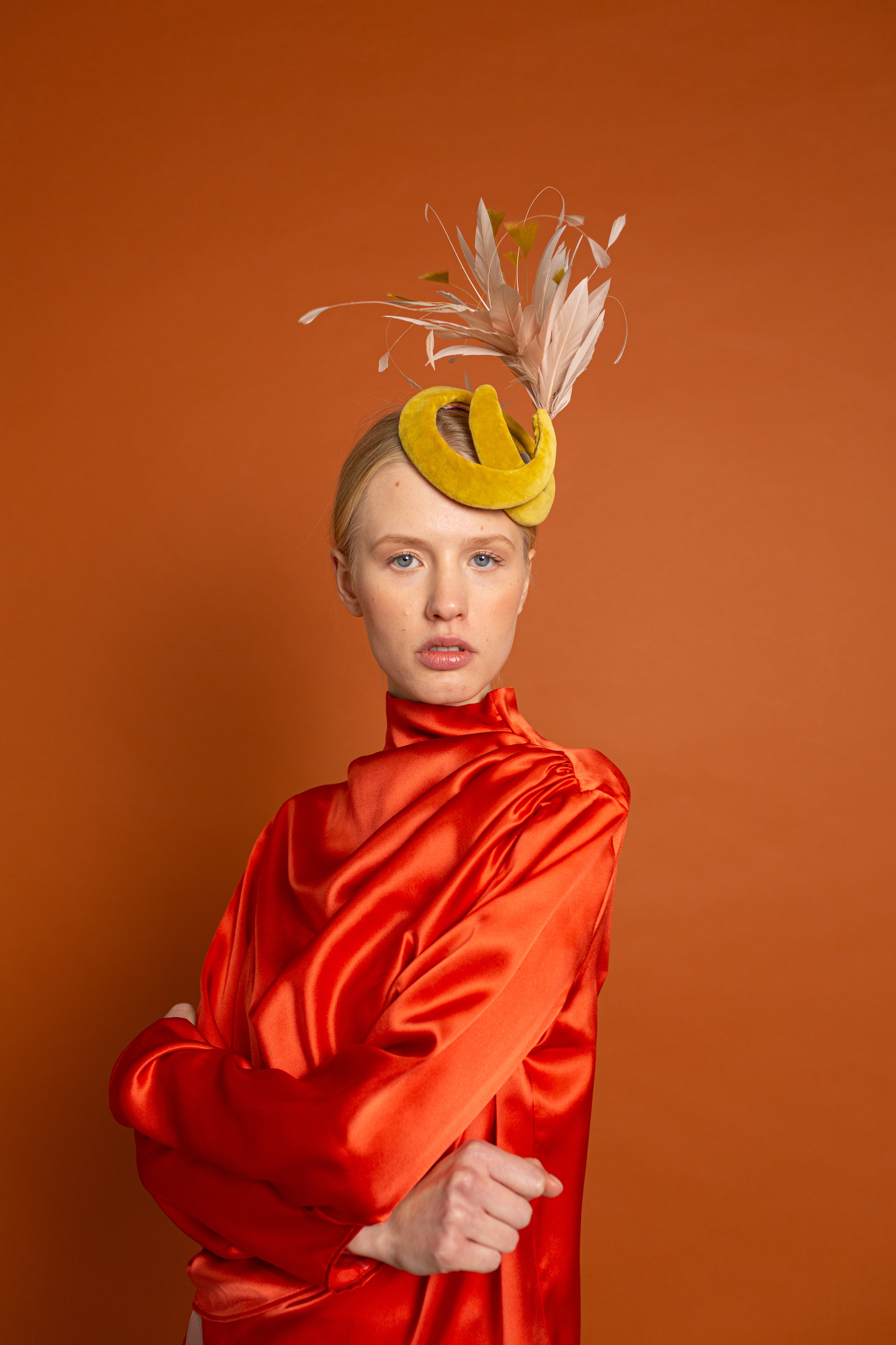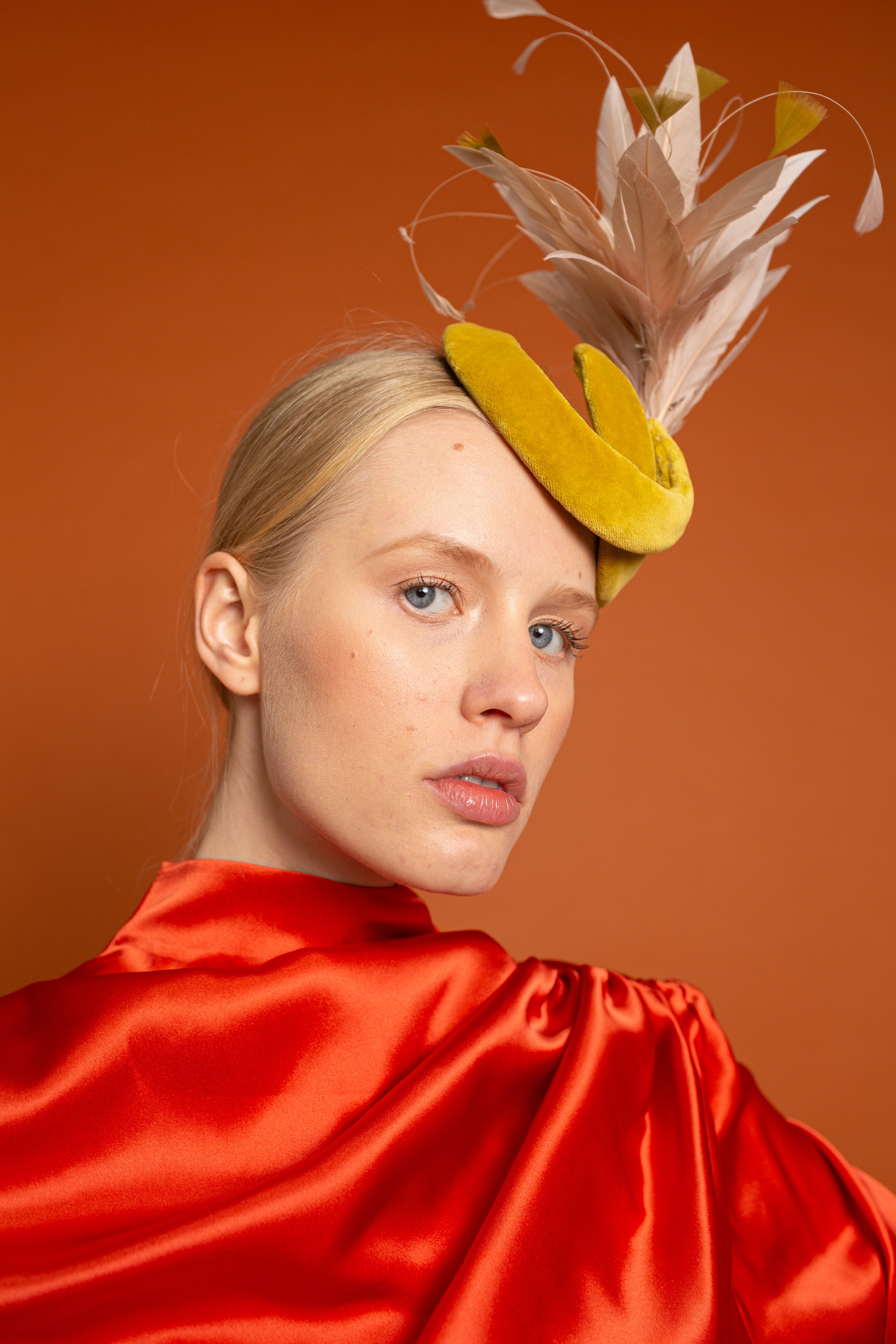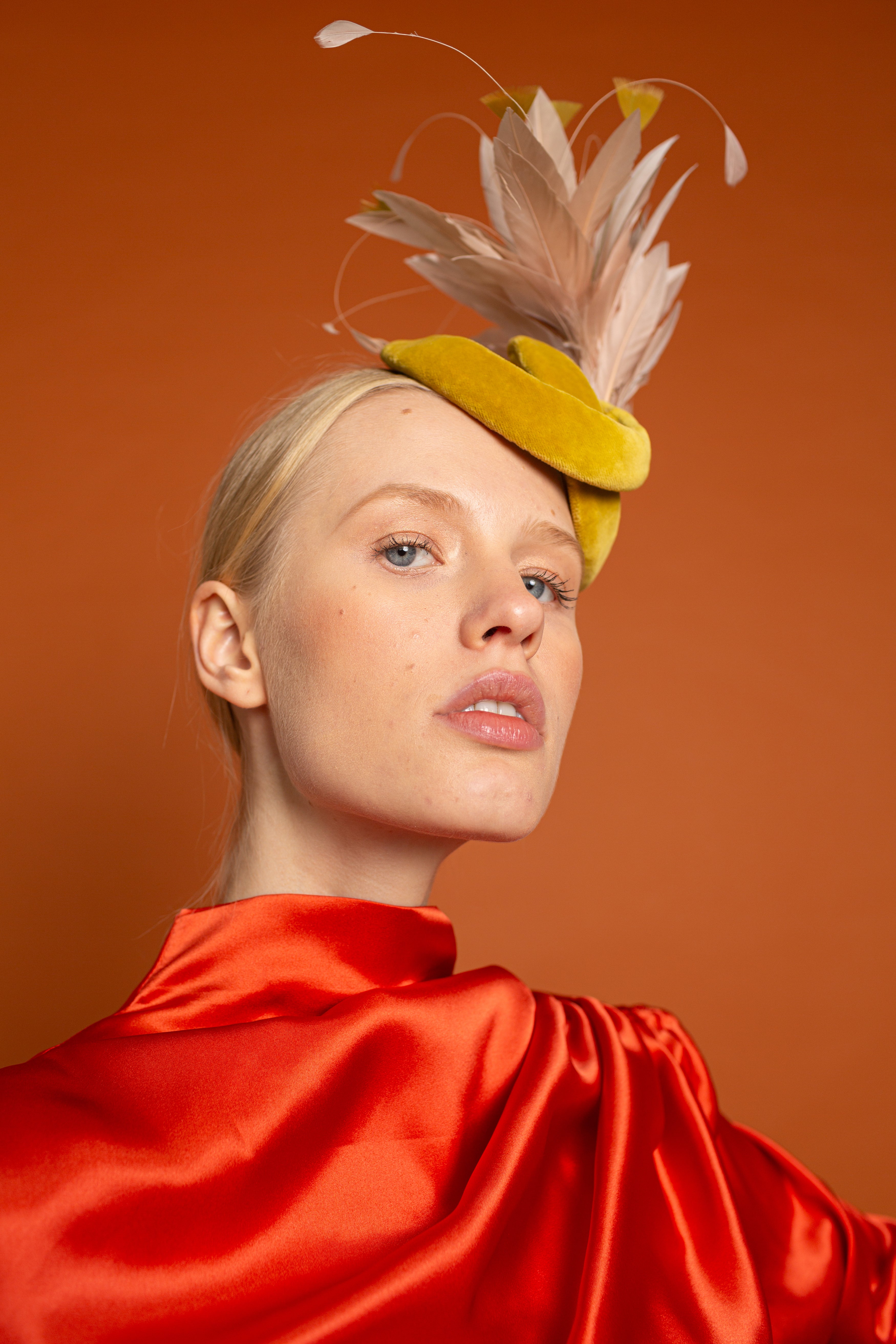 Estructura de listón ondulada forrado en terciopelo verde lima con plumero nude y antenitas en verde lima