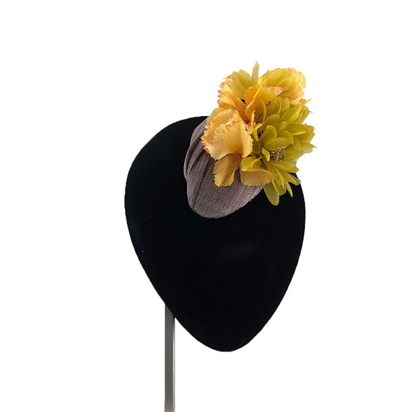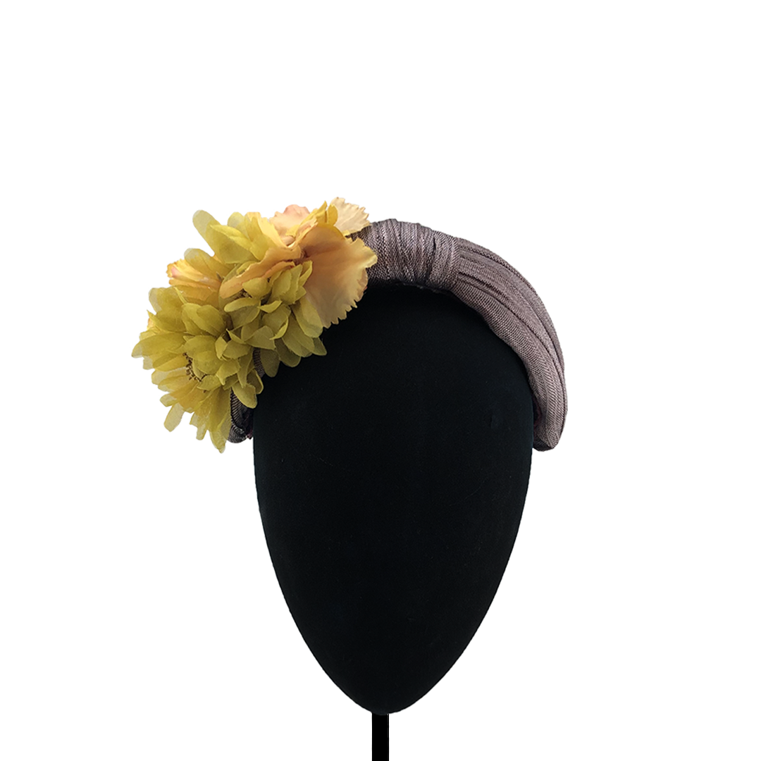 Diadema turbante en rafia malva empolvado con flores mostaza y naranja