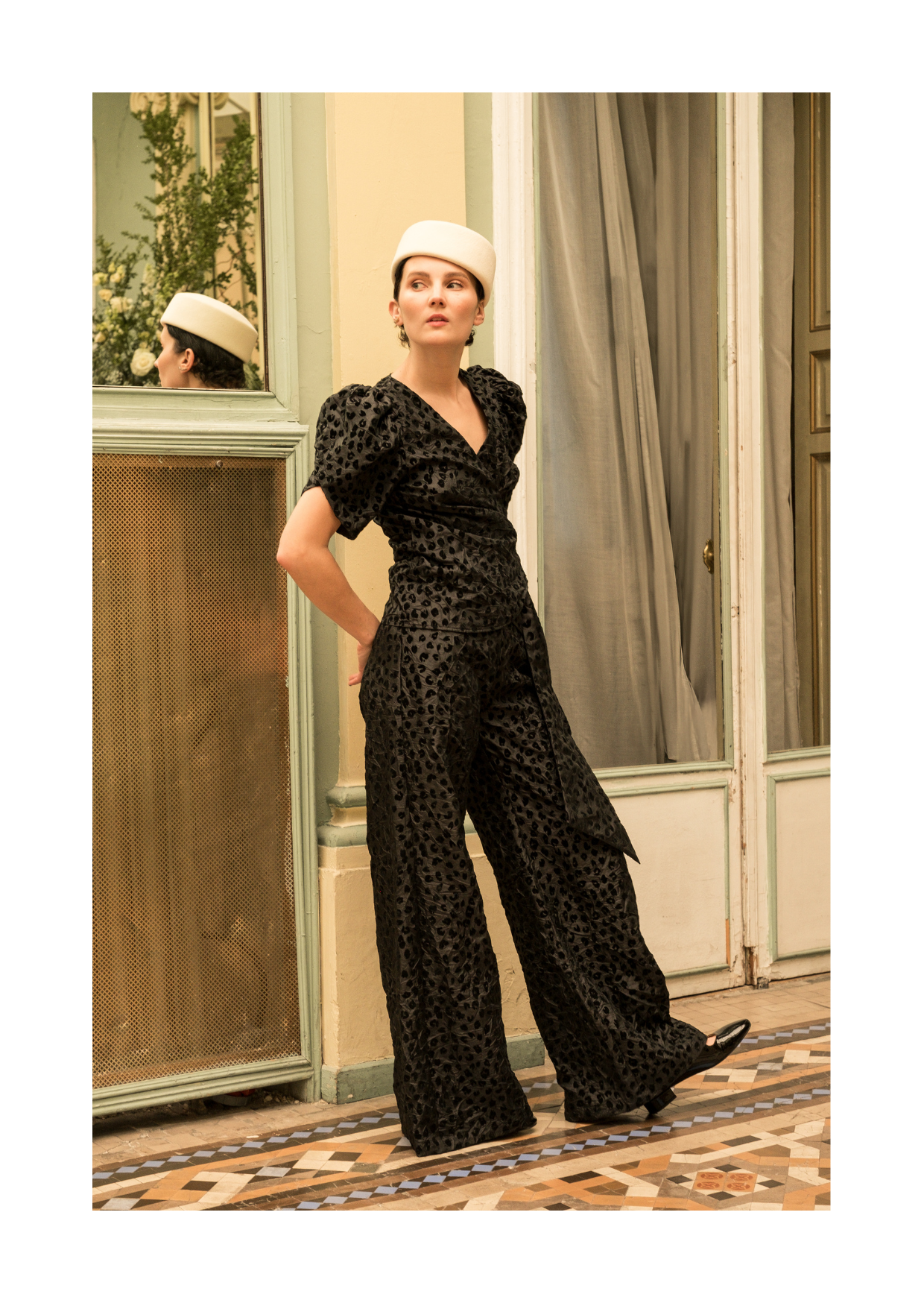 Pantalón palazzo de talle alto y bolsillos laterales.