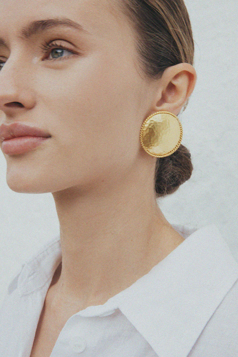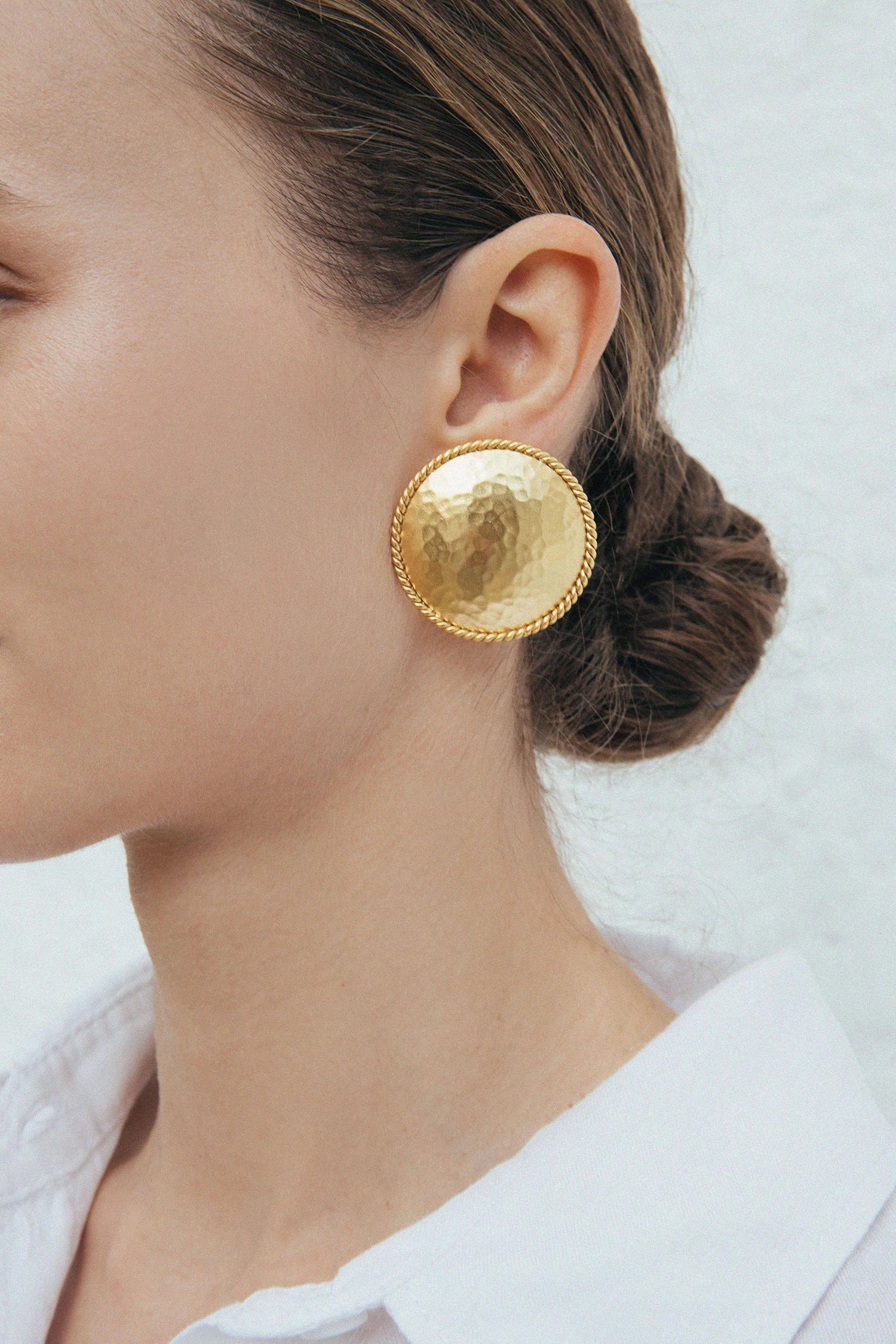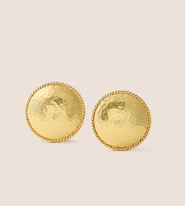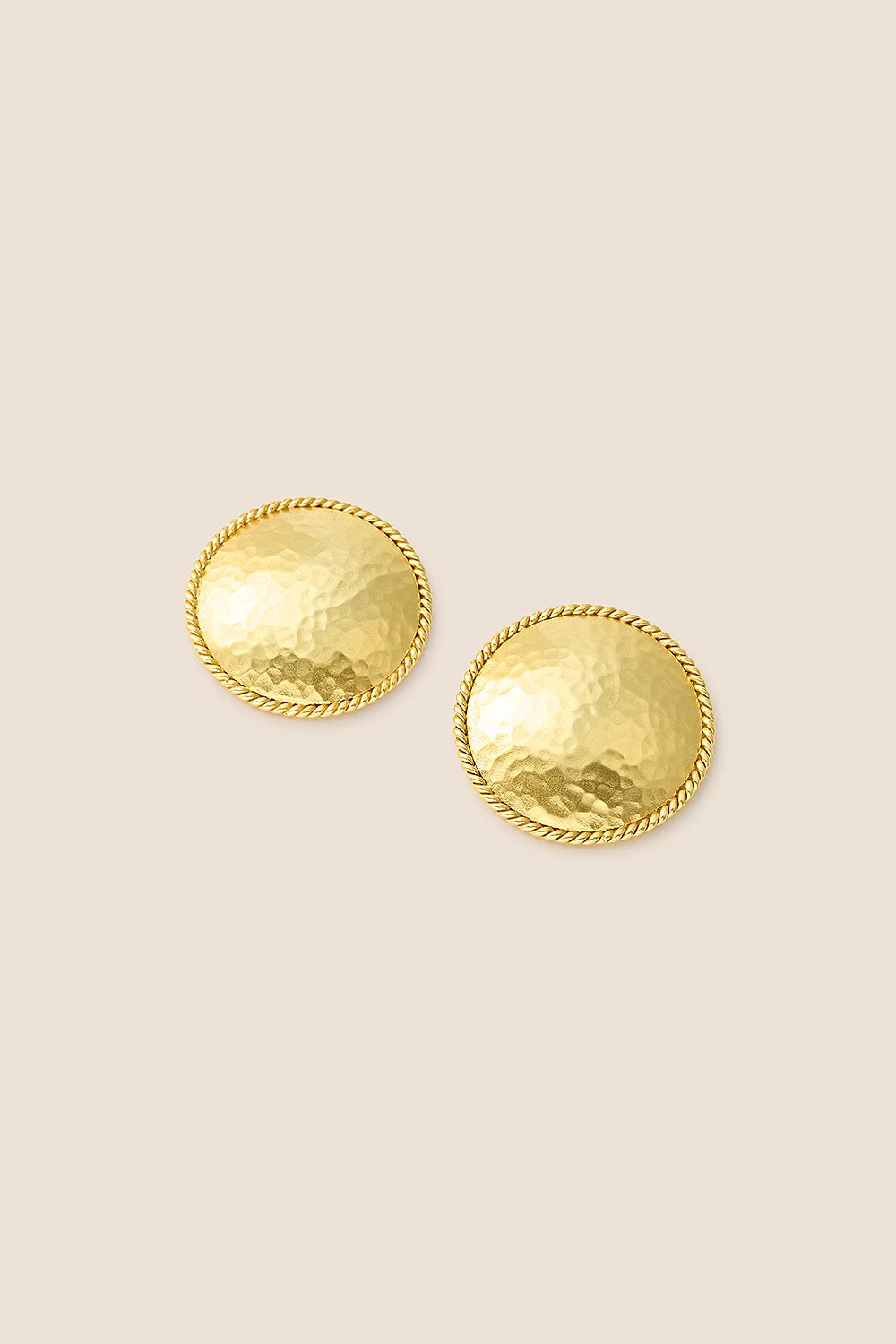 Los pendientes Marcia capturan la esencia de la elegancia atemporal con su diseño redondo de textura martelada, realzado por un delicado borde trenzado. Bañados en oro de 24k, reflejan la luz con sutileza y añaden un toque sofisticado a cualquier look. Su acabado artesanal y su silueta clásica los convierten en una pieza versátil, ideal para el día a día o para complementar un estilo más refinado.