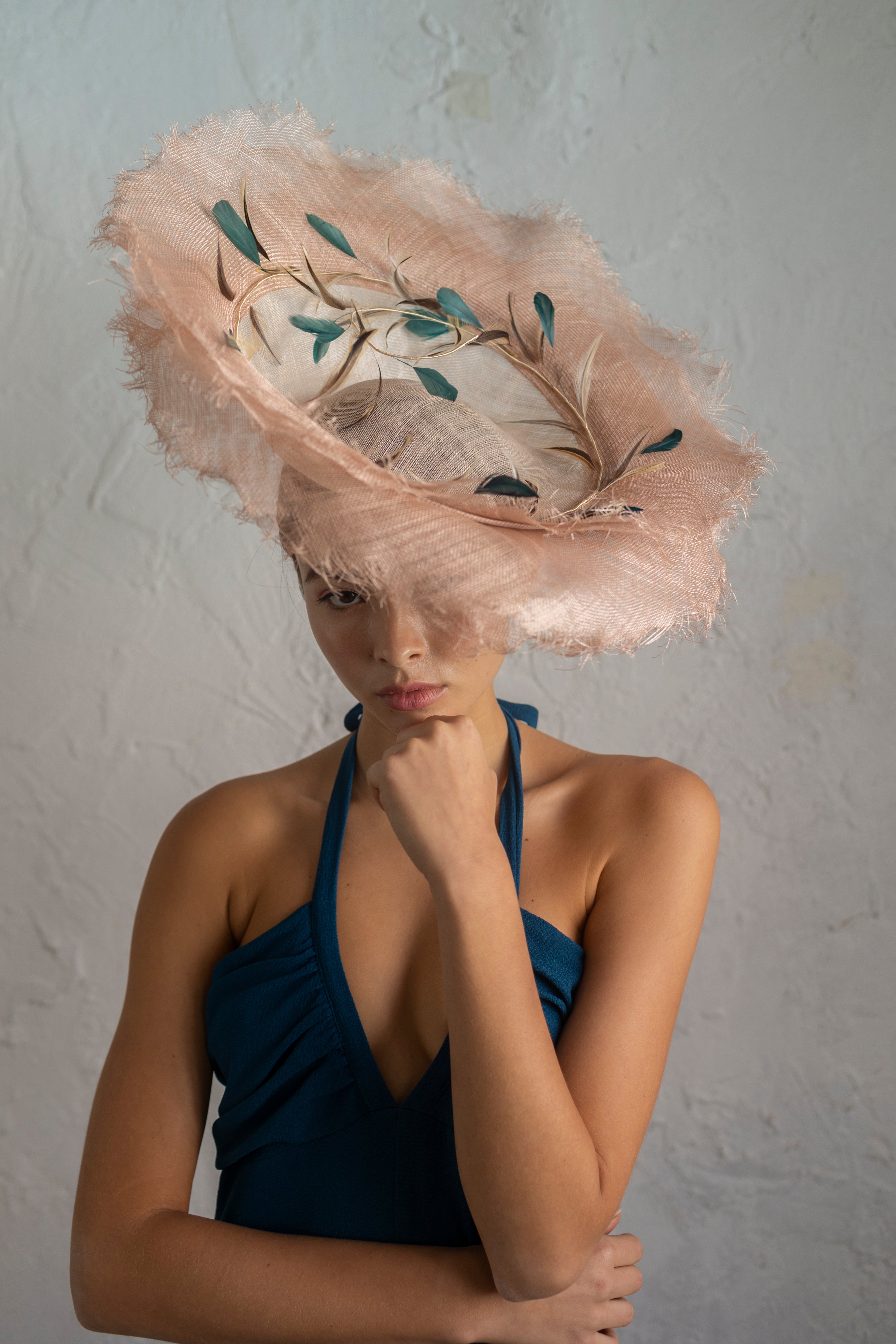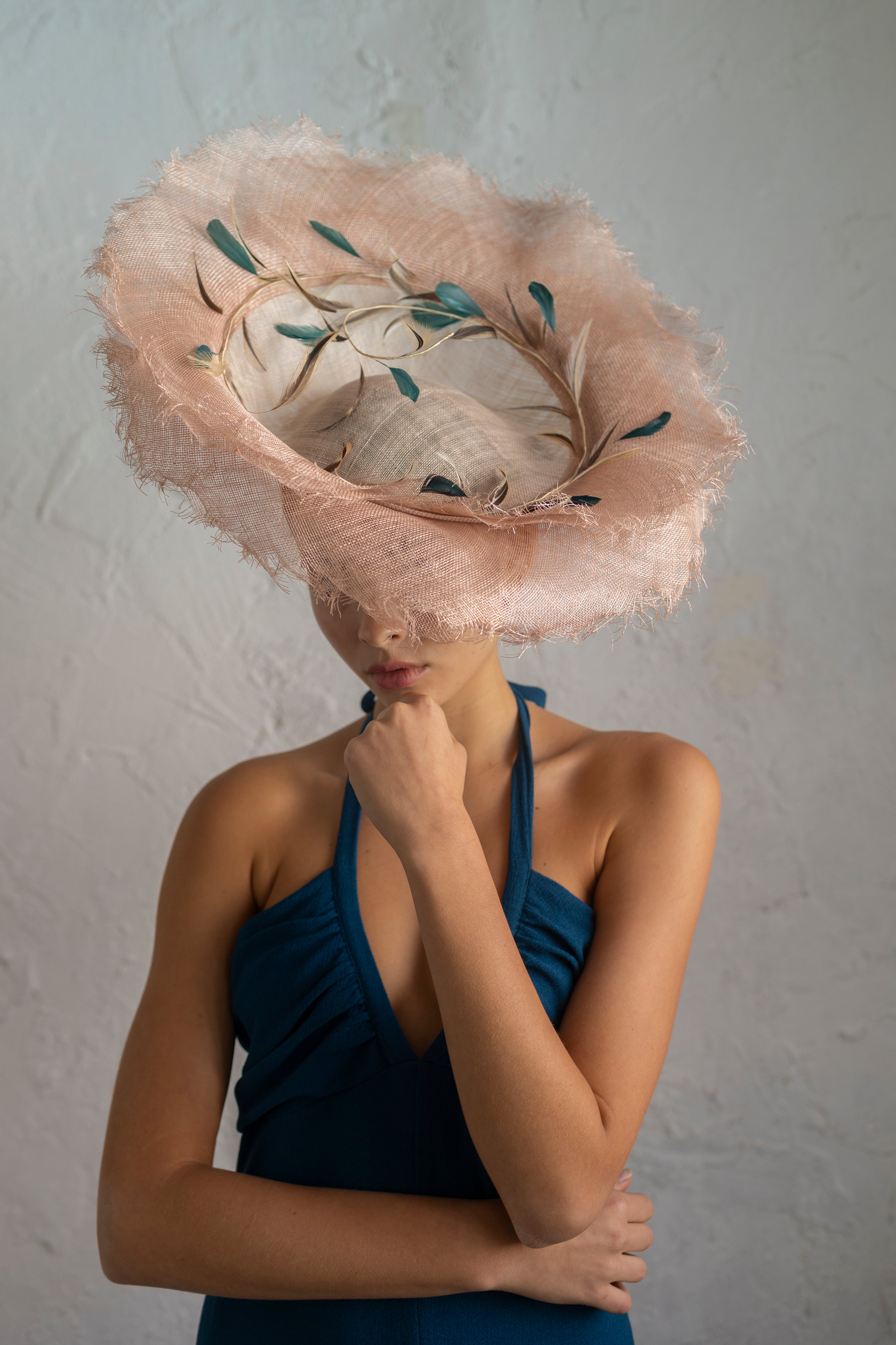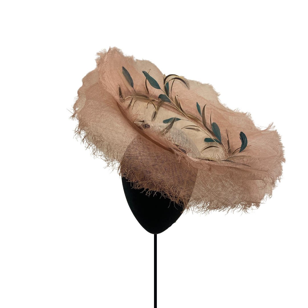 Dulcinea rosa nude con capas de bies de sinamay delhilachado al tono y antenitas alhambradas en tonos turquesa y marrón