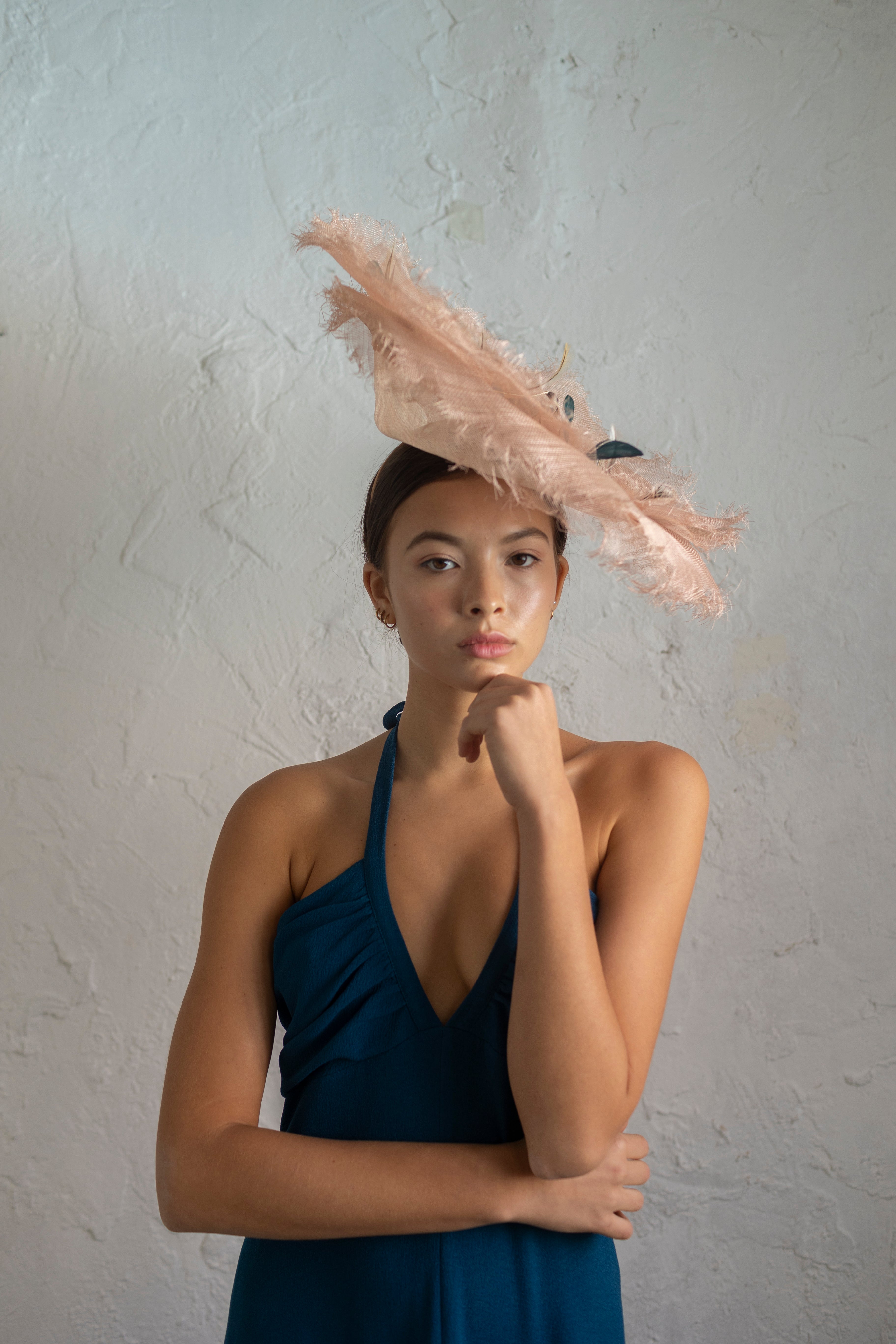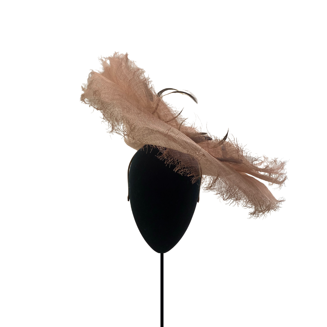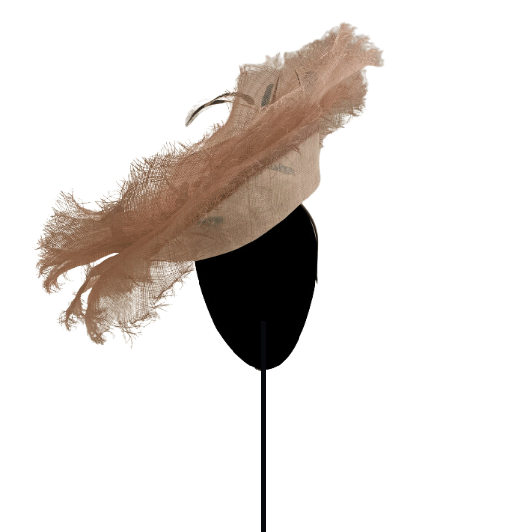 Dulcinea rosa nude con capas de bies de sinamay delhilachado al tono y antenitas alhambradas en tonos turquesa y marrón