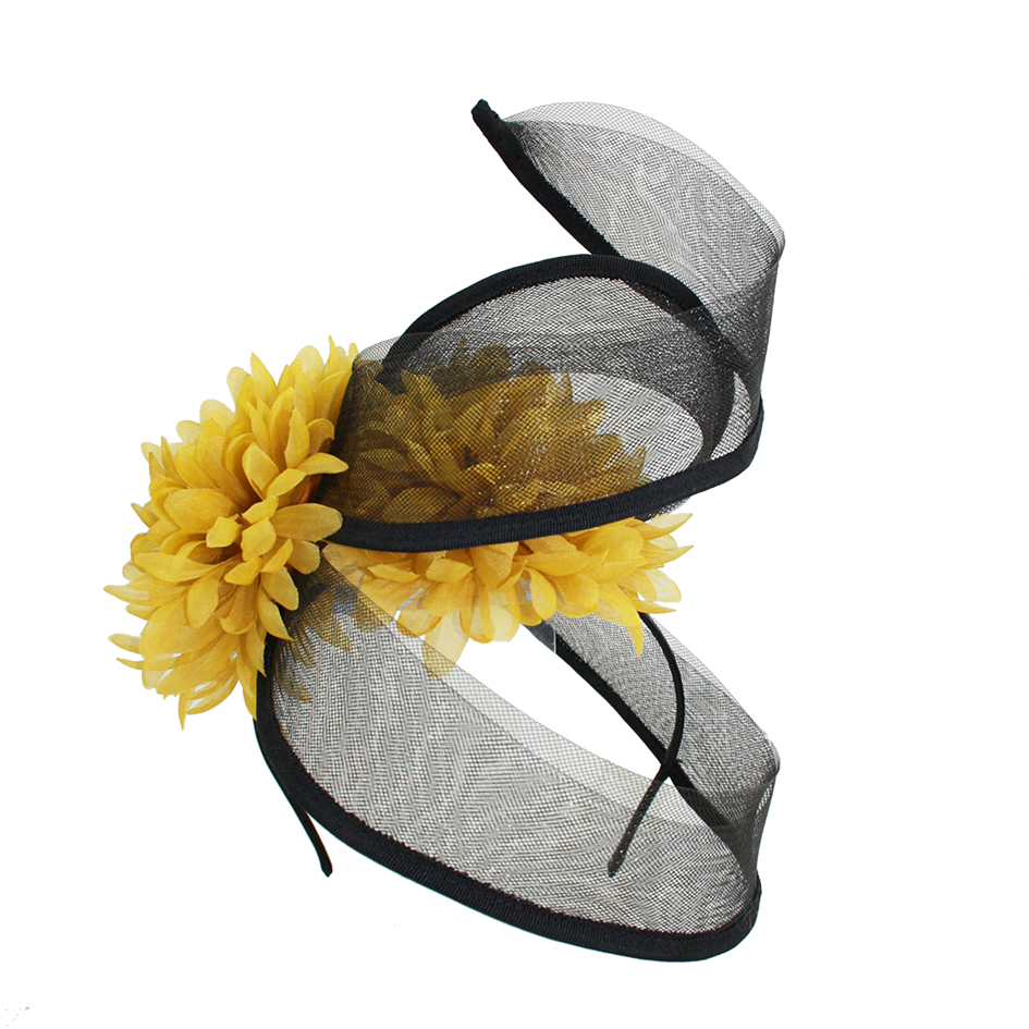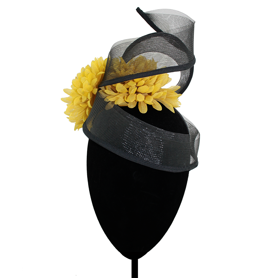 Estructura de crin negro alambrado con dos flores en mostaza