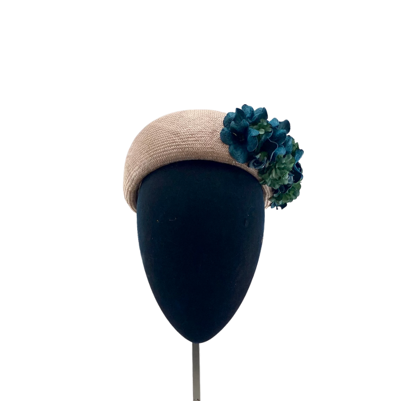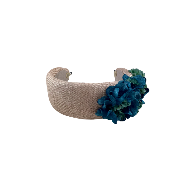 Diadema casquete de parasisal natural con flores en tonos verde y azul