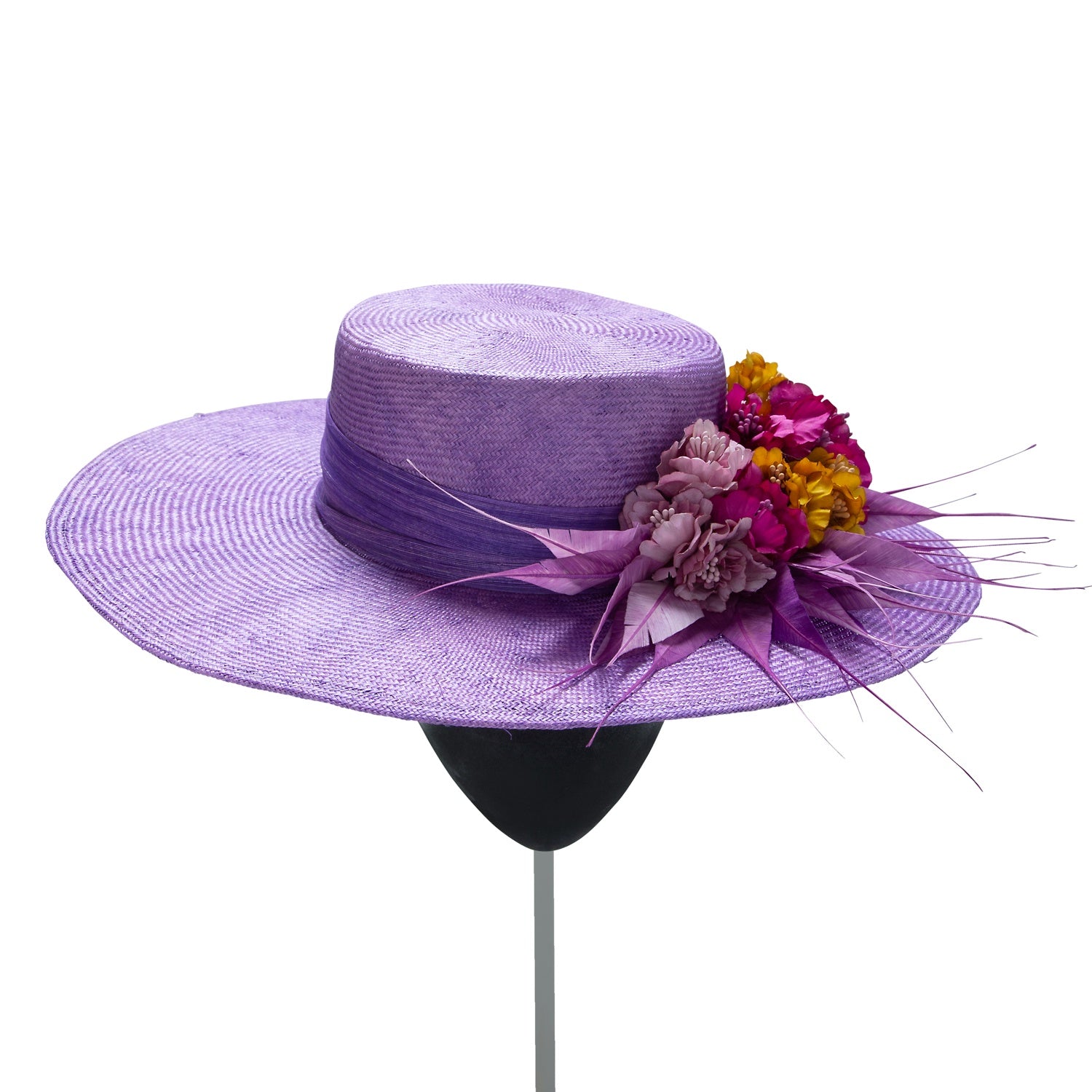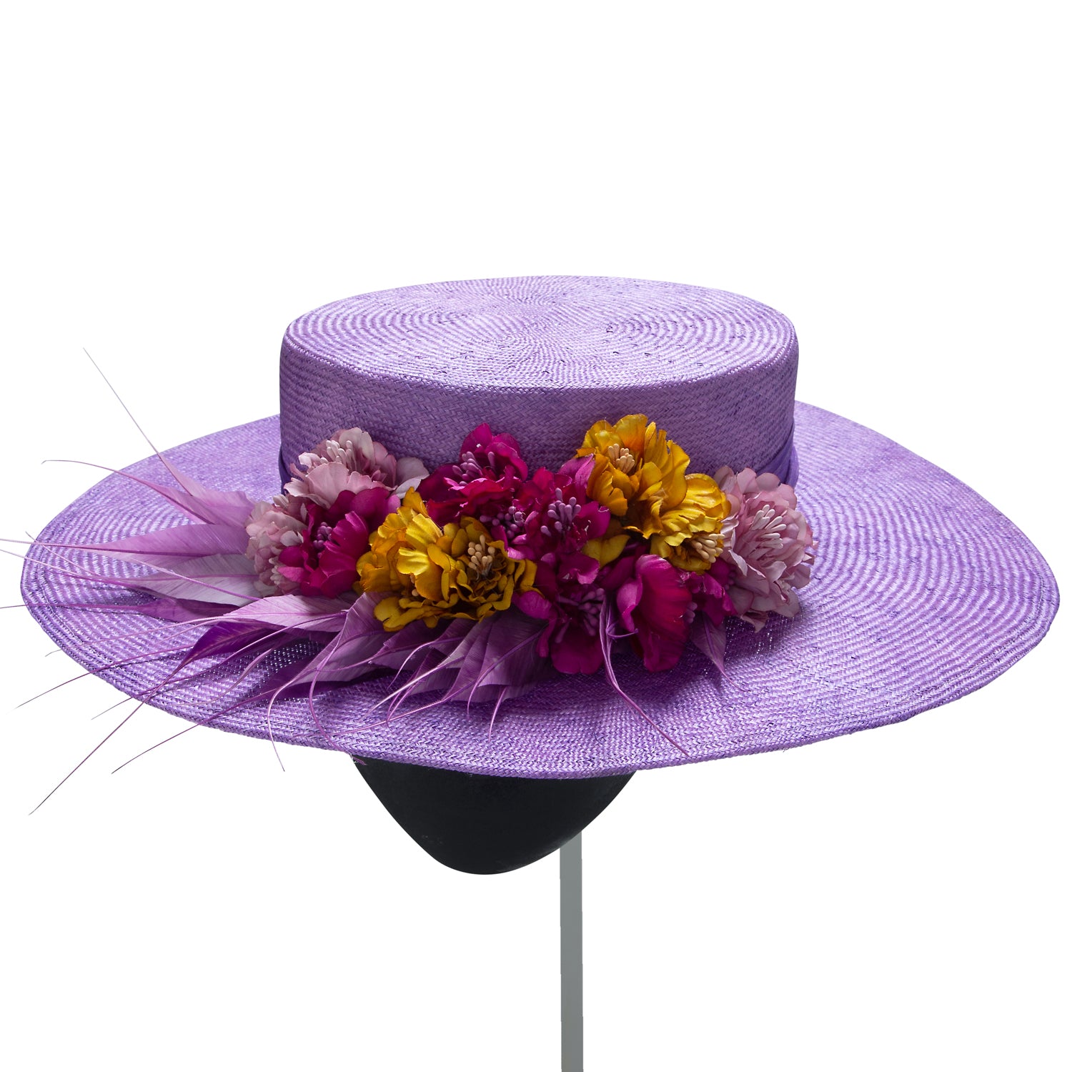 Sombrero cordobés de parasisal morado con flores buganvilla y mostaza y plumero japo morado