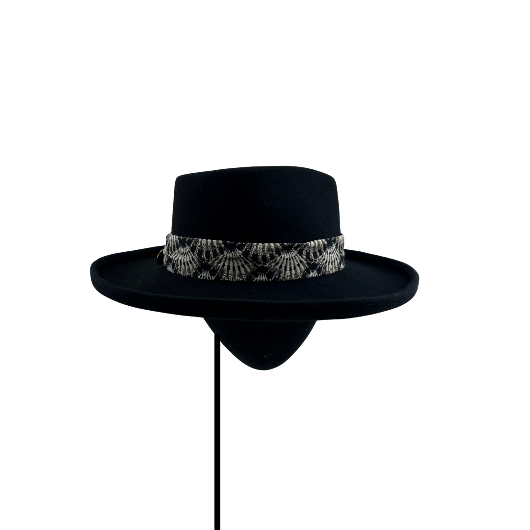 Sombrero de fieltro de lana negro con copa diamante, ala levantada y cinta estampada en B/N
